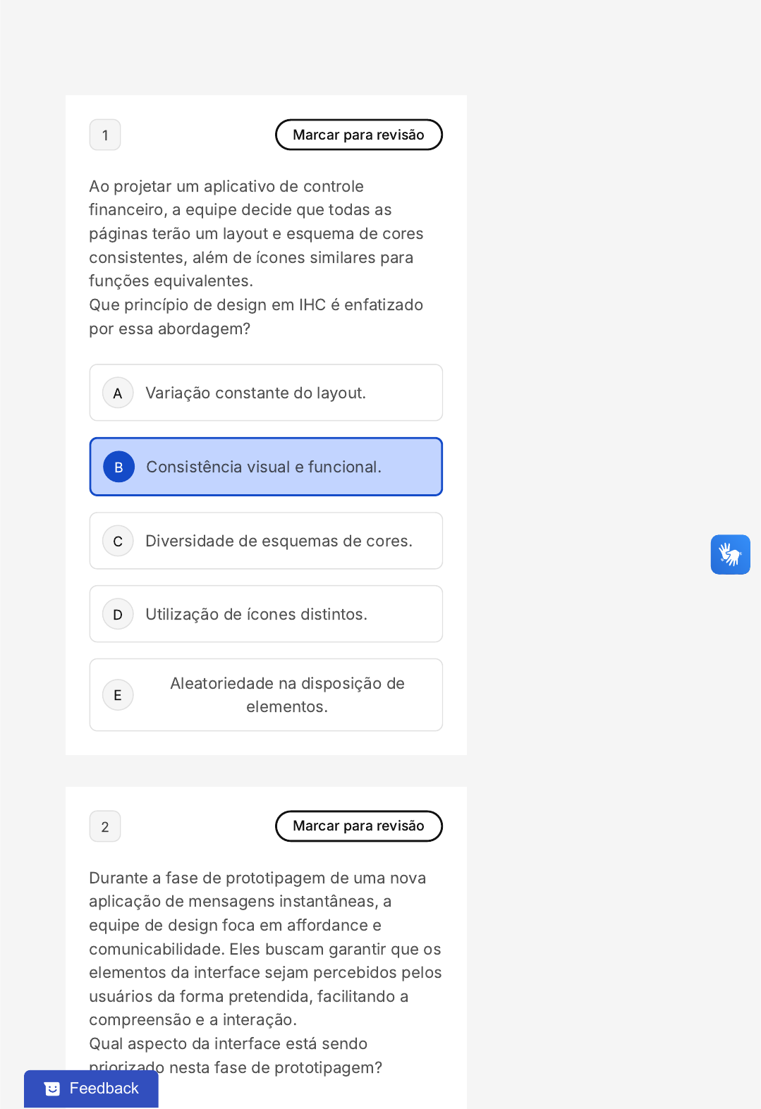 A B C D E 1 Marcar para revisão Ao projetar um aplicativo de controle financeiro, a equipe decide que todas as páginas terão um layout e esquema de cores consistentes, além de ícones similares para funções equivalentes. Que princípio de design em IHC é enfatizado por essa abordagem? Variação constante do layout. Consistência visual e funcional. Diversidade de esquemas de cores. Utilização de ícones distintos. Aleatoriedade na disposição de elementos. 2 Marcar para revisão Durante a fase de prototipagem de uma nova aplicação de mensagens instantâneas, a equipe de design foca em affordance e comunicabilidade. Eles buscam garantir que os elementos da interface sejam percebidos pelos usuários da forma pretendida, facilitando a compreensão e a interação. Qual aspecto da interface está sendo priorizado nesta fase de prototipagem? Feedback A B C D E A B C A estética visual da aplicação. A compatibilidade com diferentes dispositivos. A intuitividade dos elementos da interface. A velocidade de resposta da aplicação. A customização do perfil do usuário. 3 Marcar para revisão Através da comunicação, os seres humanos e os animais partilham diferentes informações entre si, tornando o ato de comunicar uma atividade essencial para a vida em sociedade. Disponível em: https://www.significados.com.br/comunicacao. Acesso em: 23 set. 2022. A melhor definição para comunicabilidade é: A intenção do usuário final. A melhoria das condições da interface. A inclusão de falas na interface. D E A B C D E A transmissão ao usuário das intenções da interação com a interface. A melhoria da linguagem da interface. 4 Marcar para revisão Uma diretriz relacionada à qualidade de interface é uma recomendação ou orientação que visa garantir que a interface do usuário (UI) de um software seja fácil de usar, intuitiva, eficiente e agradável. Nesse sentido, marque a alternativa correta. Alguns autores destacam a importância de manter o usuário no controle da interação. O software deve ser complexo e pouco intuitivo. O sistema deve interromper o usuário o máximo possível, passando a ideia de controle e proteção. O software não deve ser observador e se lembrar de quais ações o usuário realiza em sequência, pois tentar antever o próximo é uma atitude clara de invasão de privacidade. Para melhorar a experiência de uso do sistema, não deve-se adotar medidas mínimas de segurança. A B C D E 5 Marcar para revisão Uma equipe de UX está avaliando um portal de notícias online. Eles utilizam uma lista de verificação para inspecionar elementos como legibilidade, navegação e acessibilidade, visando melhorar a experiência do usuário final. Em uma avaliação de UX de um portal de notícias usando lista de verificação, qual aspecto é crucial? Quantidade de notícias publicadas diariamente. Legibilidade do conteúdo. Frequência de atualizações de notícias. Publicidade e banners promocionais. Disponibilidade de aplicativo móvel. 6 Marcar para revisão Existem diversos tipos de objetos de interação. A Barra de ferramentas é um deles. Assinale a alternativa que indica a melhor definição para uma Barra de Ferramentas: A B C D E Conjunto de opções do sistema. Lista de todas as opções existentes no sistema. Menu com todas as funções do sistema. Conjunto específico de funções escolhidas e mais usadas pelo usuário. Conjunto de controles para acesso rápido a comandos específicos. 7 Marcar para revisão (FADESP/2019 - Adaptada) Usabilidade é um termo muito utilizado para definir o grau de facilidade que as pessoas têm ao utilizar, por exemplo, ferramentas, sites ou até mesmo produtos. Seu objetivo é entender se o usuário consegue localizar as funções e compreender como tudo funciona rapidamente e, caso seja identificado algum problema, os erros são estudados e corrigidos. Disponível em: https://neilpatel.com/br/blog/usabilidade-o- que-e/. Acesso em: 23 set. 2022. Acerca dos conceitos sobre a avaliação de Interface Humano-Computador, qual técnica de usabilidade consiste em solicitar a usuários a realização de tarefas de teste previamente estabelecidas para a avaliação da interface a ser estudada? A B C D E A B C Avaliação heurística. Ensaios de interação. Uso de guidelines e checklists. Uso de questionários e entrevistas. Etnografia. 8 Marcar para revisão As informações que são disponibilizadas livremente para a Web devem ser acessíveis também para usuários que possuem algum tipo de deficiência visual. Nesse caso, há artifícios que facilitam a compreensão do conteúdo; por exemplo, ao utilizar-se de uma imagem, é recomendado ao codificador que insira uma descrição dela no código para que usuários deficientes visuais possam entender o que se passa no local daquela imagem, uma vez que não podem visualizá-la de fato. Acerca dessa descrição, é correto afirmar que ela é inserida em um atributo HTML denominado Display Color Background D E A B C D E Float Alt 9 Marcar para revisão Adaptabilidade é um dos critérios ergonômicos de IHC. Seu principal objetivo é permitir a adaptação do sistema ao contexto. Essa característica possui duas subdivisões. Quais são elas? Flexibilidade e Decisão do Usuário. Decisão do Usuário e Permissão do usuário. Experiência do Usuário e Preferências do Usuário. Preferências do Usuário e Flexibilidade. Flexibilidade e Experiência do usuário. 10 Marcar para revisão Segundo os conceitos do Desenho Universal, a definição correta do Princípio 1: "Uso equitativo" é: A B C D E O uso do produto é fácil de entender O design atende a diferentes preferências e habilidades individuais. O design é útil para pessoas com diferentes habilidades. O produto pode ser usado de forma eficiente e confortável e com um mínimo de fadiga. O produto minimiza os riscos e as consequências geradas por ações acidentais e não intencionais