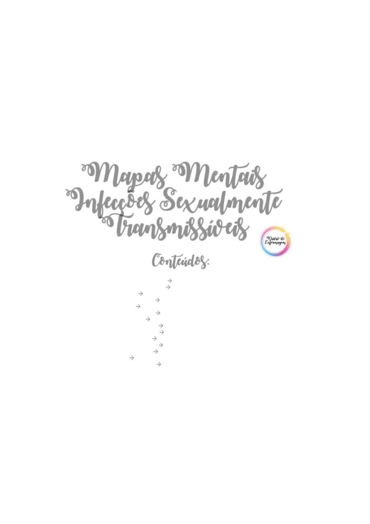 Mapas Mentais Infecções Sexualmente Transmissíveis Aids Sífilis Condiloma Acuminado Cancro Mole Linfogranuloma Venéreo Donovanose Infecção pelo HTLV Gonorreia Clamídia Herpes Genital Hepatite B Tricomoníase Doença Inflamatória Pélvica Candidíase Conteúdos: Aids CONCEITO Aids, ou Síndrome da Imunodeficiência Adquirida, é uma doença infectocontagiosa causada pelo vírus HIV, que leva à perda progressiva da imunidade. TRANSMISSÃO Sexo vaginal, oral e anal sem camisinha; Uso de seringa por mais de uma pessoa; Transfusão de sangue contaminado; Transmissão vertical, no parto e na amamentação; Instrumentos que furam ou cortam não esterilizados. DIAGNÓSTICO Teste Elisa; Coleta de sangue ou por fluido oral. No Brasil, temos os exames laboratoriais e os testes rápidos, que detectam os anticorpos contra o HIV em cerca de 30 minutos. Esses testes são realizados gratuitamente pelo Sistema Único de Saúde (SUS), nas unidades da rede pública e nos Centros de Testagem e Aconselhamento (CTA). PREVENÇÃO O uso da camisinha nas relações sexuais é a forma mais eficaz de prevenção da aids. Use somente seringas descartáveis. Gestantes devem obrigatoriamente fazer o teste de HIV durante o pré-natal. Se estiverem infectadas, é fundamental iniciar logo o tratamento a fim de evitar que o vírus seja transmitido para o feto. Hoje, é perfeitamente possível para uma mulher infectada engravidar e dar à luz um bebê livre do vírus. SINTOMAS Os mais comuns são febre constante, manchas na pele, calafrios, ínguas, dores de cabeça, de garganta e dores musculares, que surgem de 2 a 4 semanas após a pessoa contrair o vírus; Nas fases mais avançadas, é comum o aparecimento de doenças oportunistas como tuberculose e pneumonia, meningite, toxoplasmose, candidíase, etc. TRATAMENTO Não existe cura para a AIDS, mas uma adesão aos regimes antirretrovirais (ARVs) pode retardar significativamente o progresso da doença, bem como prevenir infecções secundárias e complicações ; Crônico: pode durar anos ou a vida inteira; Sempre requer exames laboratoriais ou de imagem; Sífilis CONCEITO Infecção curável e exclusiva do ser humano, causada pela bactéria Treponema pallidum. Pode apresentar várias manifestações clínicas e diferentes estágios (sífilis primária, secundária, latente e terciária). TRANSMISSÃO Transmitida por relação sexual sem camisinha com uma pessoa infectada; Acidentes com perfuro cortantes; Transmissão vertical: da mãe infectada para o feto durante a gestação e o parto (sífilis congênita). DIAGNÓSTICO O teste rápido (TR) de sífilis está disponível nos serviços de saúde do SUS, sendo prático e de fácil execução, com leitura do resultado em, no máximo, 30 minutos, sem a necessidade de estrutura laboratorial. Esta é a principal forma de diagnóstico da sífilis. PREVENÇÃO O uso da camisinha nas relações sexuais é a forma mais eficaz de prevenção da doença; O acompanhamento das gestantes e parcerias sexuais durante o pré- natal de qualidade contribui para o controle da sífilis congênita;TRATAMENTO Penicilina benzatina (benzetacil); A parceria sexual também deverá ser testada e tratada para evitar a reinfecção; Sintomas da SífilisSÍFILIS SECUNDÁRIA Os sinais e sintomas aparecem entre seis semanas e seis meses do aparecimento e cicatrização da ferida inicial. Pode ocorrer manchas no corpo, que geralmente não coçam, incluindo palmas das mãos e plantas dos pés. Essas lesões são ricas em bactérias. Pode ocorrer febre, mal-estar, dor de cabeça e ínguas pelo corpo. LATENTE Não aparecem sinais ou sintomas. É dividida em sífilis latente recente (menos de dois anos de infecção) e sífilis latente tardia (mais de dois anos de infecção). A duração é variável, podendo ser interrompida pelo surgimento de sinais e sintomas da forma secundária ou terciária. COMPLICAÇÕES DA SÍFILIS CONGENITA Aborto espontâneo; Parto prematuro; Má-formação do feto; Surdez; Cegueira; Deficiência mental; Morte ao nascer. SÍFILIS TERCIÁRIA Pode surgir de dois a 40 anos depois do início da infecção. Costuma apresentar sinais e sintomas, principalmente lesões cutâneas, ósseas, cardiovasculares e neurológicas, podendo levar à morte. SÍFILIS PRIMÁRIA Ferida, geralmente única, no local de entrada da bactéria (pênis, vulva, vagina, colo uterino, ânus, boca, ou outros locais da pele), que aparece entre 10 a 90 dias após o contágio. Essa lesão é rica em bactérias. Normalmente não dói, não coça, não arde e não tem pus, podendo estar acompanhada de ínguas (caroços) na virilha. ATENÇÃO Uma pessoa pode ter sífilis e não saber, isso porque a doença pode aparecer e desaparecer, mas continuar latente no organismo; Condiloma Acuminado PREVENÇÃO Vacinar-se contra o HPV é a medida mais eficaz para se prevenir contra a infecção.; Exame preventivo do câncer de colo de útero; Uso do preservativo nas relações sexuais; TRANSMISSÃO A transmissão do HPV se dá por contato direto com a pele ou mucosa infectada. A principal forma de transmissão é pela via sexual, que inclui contato oral-genital, genital- genital ou mesmo manual-genital. Portanto, o contágio com o HPV pode ocorrer mesmo na ausência de penetração vaginal ou anal. Também pode haver transmissão durante o parto TRATAMENTO Os tipos de tratamento são químicos, cirúrgicos e estimuladores da imunidade; Podem ser domiciliares (autoaplicados: imiquimode, podofilotoxina) ou ambulatoriais (aplicados no serviço de saúde: ácido tricloroacético – ATA, podofilina, eletrocauterização, exérese cirúrgica e crioterapia), conforme indicação profissional para cada caso; DIAGNÓSTICO Lesões clínicas –exame clínico urológico (pênis), ginecológico (vulva/vagina/colo uterino), anal (ânus e região perianal) e dermatológico (pele). Lesões subclínicas –exames laboratoriais, como o exame preventivo Papanicolau (citopatologia), co