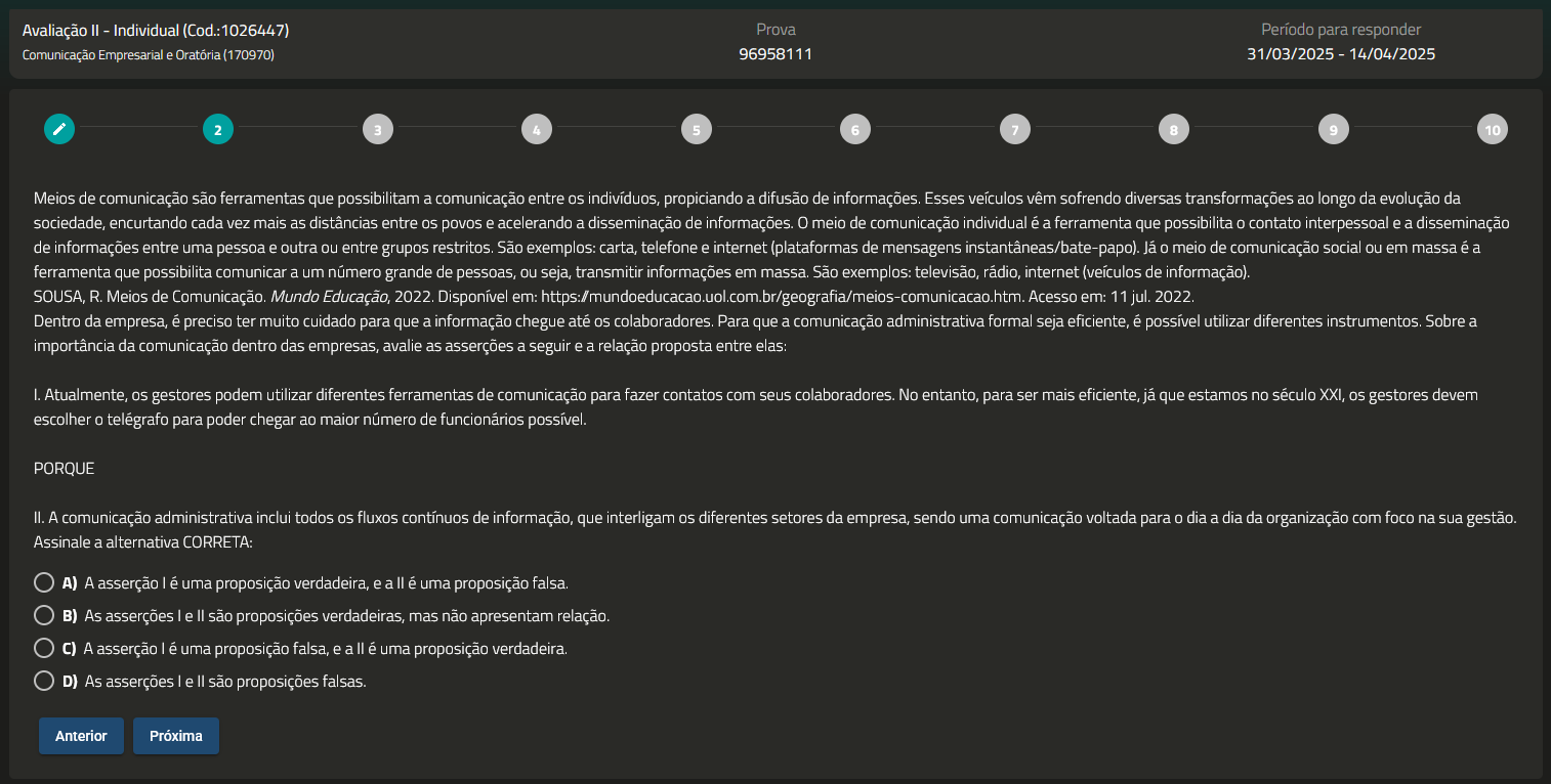 Avaliação II - Individual (Cod.: 1026447) Prova Período para responder Comunicação Empresarial e Oratória (170970) 96958111 31/03/2025 14/04/2025 2 3 5 7 10 Meios de comunicação são ferramentas que possibilitam a comunicação entre os indivíduos, propiciando a difusão de informações. Esses veículos vêm sofrendo diversas transformações ao longo da evolução da sociedade, encurtando cada vez mais as distâncias entre os povos e acelerando a disseminação de informações. meio de comunicação individual é a ferramenta que possibilita contato interpessoal e a disseminação de informações entre uma pessoa e outra ou entre grupos restritos. São exemplos: carta, telefone e internet (plataformas de mensagens instantâneas/bate-papo). lá meio de comunicação social em massa é a ferramenta que possibilita comunicar a um número grande de pessoas, ou seja, transmitir informações em massa. São exemplos: televisão, rádio, internet (veículos de informação). SOUSA, R. Meios de Comunicação. Mundo Educação, 2022. Disponível em: em: 11 jul. 2022. Dentro da empresa, é preciso ter muito cuidado para que a informação chegue até os colaboradores. Para que a comunicação administrativa formal seja eficiente, é possível utilizar diferentes instrumentos. Sobre a importância da comunicação dentro das empresas, avalie as asserções a seguir e a relação proposta entre elas: I. Atualmente, os gestores podem utilizar diferentes ferramentas de comunicação para fazer contatos com seus colaboradores. No entanto, para ser mais eficiente, já que estamos no século XXI, os gestores devem escolher telégrafo para poder chegar ao maior número de funcionários possível. PORQUE II. A comunicação administrativa inclui todos os fluxos contínuos de informação, que interligam os diferentes setores da empresa, sendo uma comunicação voltada para dia a dia da organização com foco na sua gestão. Assinale a alternativa CORRETA: A) A asserção I é uma proposição verdadeira, e a II é uma proposição falsa. B) As asserções I e II são proposições verdadeiras, mas não apresentam relação. C) A asserção I é uma proposição falsa, e a II é uma proposição verdadeira. D) As asserções I e II são proposições Anterior Próxima