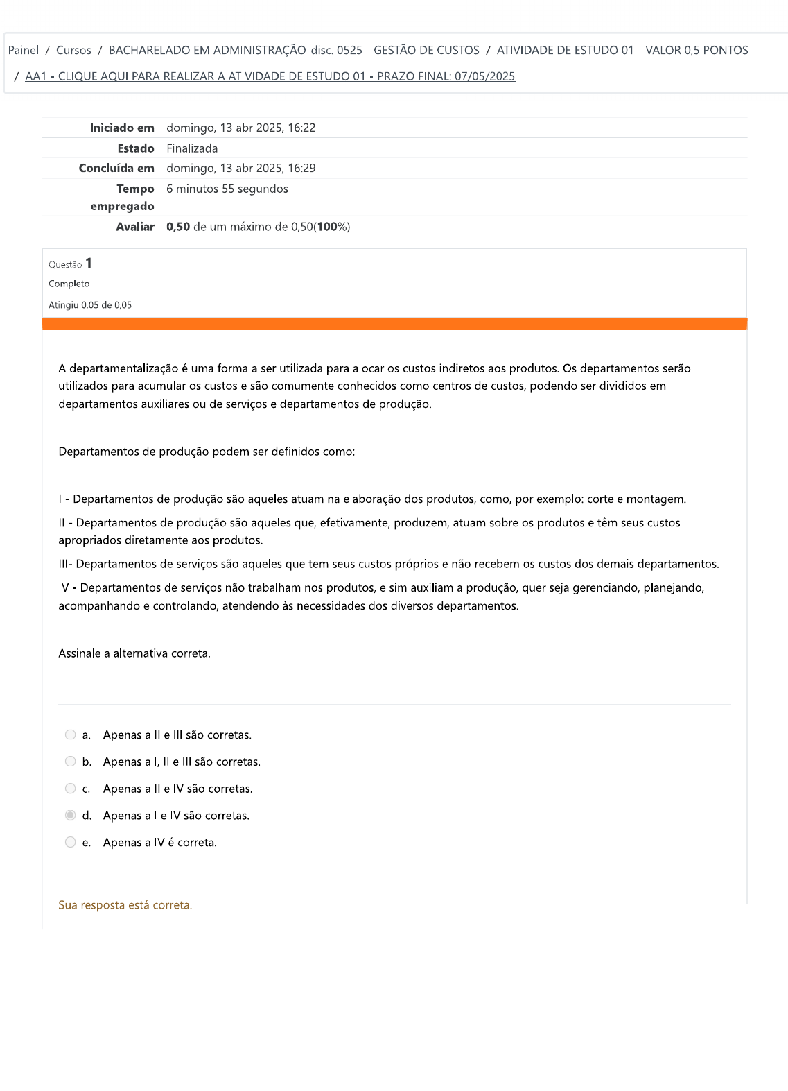 Painel / Cursos / BACHARELADO EM ADMINISTRAÇÃO-dis 0525 - GESTÃO DE CUSTOS / ATIVIDADE DE ESTUDO 01 VALOR 0,5 PONTOS / AA1 - CLIQUE AQUI PARA REALIZAR A ATIVIDADE DE ESTUDO 01 - PRAZO FINAL: 07/05/2025 Iniciado em domingo, 13 abr 2025, 16:22 Estado Finalizada Concluída em domingo, 13 abr 2025, 16:29 Tempo 6 minutos 55 segundos empregado Avaliar 0,50 de um máximo de 0,50(100%) Questão 1 Completo Atingiu 0,05 de 0,05 A departamentalização é uma forma a ser utilizada para alocar os custos indiretos aos produtos. Os departamentos serão utilizados para acumular os custos e são comumente conhecidos como centros de custos, podendo ser divididos em departamentos auxiliares ou de serviços e departamentos de produção. Departamentos de produção podem ser definidos como: - Departamentos de produção são aqueles atuam na elaboração dos produtos, como, por exemplo: corte e montagem. - Departamentos de produção são aqueles que, efetivamente, produzem, atuam sobre os produtos e têm seus custos apropriados diretamente aos produtos. III- Departamentos de serviços são aqueles que tem seus custos próprios e não recebem os custos dos demais departamentos. IV - Departamentos de serviços não trabalham nos produtos, e sim auxiliam a produção, quer seja gerenciando, planejando, acompanhando e controlando, atendendo às necessidades dos diversos departamentos. Assinale a alternativa correta. a. Apenas a e III são corretas. b. Apenas a I, II e III são corretas. C. Apenas a e IV são corretas. d. Apenas a e IV são corretas. e. Apenas a IV é correta. Sua resposta está correta.Questão 2 Completo Atingiu 0,05 de 0,05 Departamentos de produção podem ser definidos como: Assinale a alternativa correta. a. Aqueles que não atuam na produção, mas não suportem aos demais departamentos. b. São aqueles que não recebem os custos demais departamentos. São aqueles que, efetivamente, produzem, atuam sobre os produtos e têm seus custos apropriados diretamente aos produtos. d. Aqueles que, embora sejam indiretos em relação aos produtos fabricados, são diretos em relação à produção. e. É a área ou divisão dentro da empresa. Sua resposta está correta. Questão 3 Completo Atingiu 0,05 de 0,05 Com os dados abaixo, apresente o Lucro bruto da empresa e seu Resultado Operacional, utilizando o método do Custeio por Absorção. Receita: R$ 2.345.000,00 Custo variável: R$ 1245.000,0 Custo fixo: R$ 980.000,00 Despesas Operacionais: R$ 70.000,00 Assinale a alternativa correta. a. Lucro bruto: R$ 120.000,00 - Resultado Operacional: R$ 50.000,00. b. Lucro bruto: R$ 110.000,00 - Resultado Operacional: R$ 10.000,00. C. Lucro bruto: R$ 120.000,00 - Resultado Operacional: R$ 90.000,00. d. Lucro bruto: R$ 110.000,00 - Resultado Operacional: R$ 70.000,00. e. Lucro bruto: R$ 125.000,00 - Resultado Operacional: R$ 80.000,00. Sua resposta está correta.Questão 4 Completo Atingiu 0,05 de 0,05 A classificação dos custos em diretos e indiretos é geralmente feita em relação ao: Assinale a alternativa correta. a. Capacidade de produção. b. Valor total do custo e o volume de atividade. C. Volume de produção. d. Produto. e. Departamento na empresa. Sua resposta está correta. Questão 5 Completo Atingiu 0,05 de 0,05 Uma indústria utiliza o Método de Custeio por Absorção e deseja saber qual será o valor dos Custos dos Produtos Vendidos (CPV) unitário, com os seguintes dados de produção: Produção mensal: 3.500 unidades; Vendas do mês: 3.300 unidades; Preço de Venda: R$ 500,00; Custo variável: R$ 157,00/por unidade; Despesas variáveis: R$ 35,00/por unidade; Custos fixos: R$ $ 343.000,00 por mês. Diante disso, assinale a alternativa correta. a. CPV por unidade: R$ 256,00. b. CPV por unidade: R$ 245,00. C. CPV por unidade: R$ 255,00. d. CPV por unidade: R$ 210,00. e. CPV por unidade: R$ Sua resposta está correta.Questão 6 Completo Atingiu 0,05 de 0,05 A contabilidade pretende a geração de informações para os diversos usuários. Diante deste objetivo, a contabilidade gerencial nasce com qual objetivo? Assinale a alternativa correta. a. A contabilidade gerencial visa apenas a mensuração de estoques. b. objetivo da contabilidade gerencial é fornecer informações aos administradores, dando suporte à tomada de decisão. C. objetivo da contabilidade gerencial é fornecer informações para os administradores de outras empresas, ou seja, de usuários externos. d. A contabilidade gerencial não é ponto primordial nas organizações, servindo como suporte à administração. e. A contabilidade gerencial tem apenas o objetivo de custos da empresa. Sua resposta está correta.Questão 7 Completo Atingiu 0,05 de 0,05 Complete as frases a seguir: I. consistem nos elementos utilizados durante o processo produtivo. II. Todo sacrifício feito à vista ou a prazo para a obtenção de bens ou serviços, independentemente de sua destinação na empresa, são chamados de III. Todos os gastos que não são incluídos como custos dos produtos, mas sim como recursos consumidos fora do processo de produção ou da prestação de serviços para a obtenção de receita, são chamados de Marque a opção que completa corretamente as frases: a. Gastos, custos e despesas. b. Custos, despesas e gastos. C. Custos, gastos e despesas. d. Despesas, custos e gastos. e. Gastos, despesas e custos. Sua resposta está correta.Questão 8 Completo Atingiu 0,05 de 0,05 Em relação aos produtos fabricados, analise as afirmativas abaixo: I. Os custos diretos são distribuídos aos produtos por meio de um critério de rateio. II. Os custos diretos compreendem os gastos com materiais, mão de obra e gastos gerais de fabricação aplicados diretamente na fabricação dos produtos. III. Custos indiretos compreendem os gastos com materiais, mão de obra e gastos de fabricação aplicados indiretamente na fabricação dos produtos. IV. A impossibilidade de identificação de um gasto em relação aos produtos ocorre po