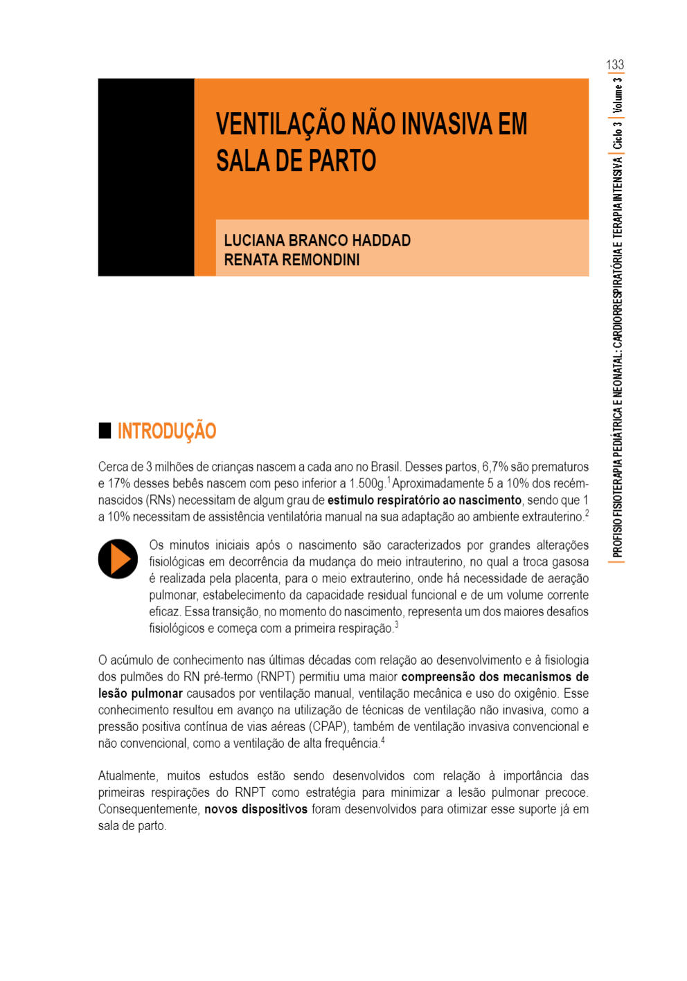 133 VENTILAÇÃO NÃO INVASIVA EM SALA DE PARTO LUCIANA BRANCO HADDAD RENATA REMONDINI INTRODUÇÃO Cerca de 3 milhões de crianças nascem a cada ano no Brasil. Desses partos, 6,7% são prematuros e 17% desses bebês nascem com peso inferior a 1.500g. Aproximadamente 5 a 10% dos recém- nascidos (RNs) necessitam de algum grau de respiratório ao nascimento, sendo que 1 a 10% necessitam de assistência ventilatória manual na sua adaptação ao ambiente Os minutos iniciais após nascimento são caracterizados por grandes alterações fisiológicas em decorrência da mudança do meio intrauterino, no qual a troca gasosa é realizada pela placenta, para o meio extrauterino, onde há necessidade de aeração pulmonar, estabelecimento da capacidade residual funcional e de um volume corrente eficaz. Essa no momento do nascimento, representa um dos maiores desafios fisiológicos e começa com a primeira acúmulo de conhecimento nas últimas décadas com relação ao desenvolvimento e à fisiologia dos pulmões do RN pré-termo (RNPT) permitiu uma maior compreensão dos mecanismos de lesão pulmonar causados por ventilação manual, ventilação mecânica e uso do oxigênio. Esse conhecimento resultou em avanço na utilização de técnicas de ventilação não invasiva, como a pressão positiva contínua de vias aéreas (CPAP), também de ventilação invasiva convencional e não convencional, como a ventilação de alta frequência.4 Atualmente, muitos estudos estão sendo desenvolvidos com relação à importância das primeiras respirações do RNPT como estratégia para minimizar a lesão pulmonar precoce. Consequentemente, novos dispositivos foram desenvolvidos para otimizar esse suporte já em sala de parto.134 OBJETIVOS Após a leitura deste artigo, espera-se que o leitor seja capaz de: demonstrar os benefícios da ventilação não invasiva (VNI) na sala de parto como prevenção de lesão pulmonar no RN prematuro. ESQUEMA CONCEITUAL Reanimação do prematuro Balão autoinflável Dispositivos utilizados para Balão autoinflável a fluxo ventilação manual em sala de parto Peça T Reanimação do prematuro Pressão positiva contínua de vias aéreas como estratégia para minimizar a lesão pulmonar Posicionamento do Oxigenação dos recém-nascidos Interfaces de ventilação não em sala de parto invasiva em recém-nascidos Rotina para instalação de pressão positiva contínua de vias aéreas em sala de parto Caso clínico Conclusão135 REANIMAÇÃO DO PREMATURO Diversas morbidades podem acometer o RN de muito baixo peso (entre 500 e 1.500g), como, por exemplo, asfixia perinatal, síndrome do desconforto respiratório, infecções, enterocolite necrosante e hemorragia intra/periventricular. Além de serem submetidos a um tempo de hospitalização prolongado, os RNs podem evoluir com algumas complicações, como doença pulmonar crônica, sequelas neurológicas, distúrbios do crescimento e retinopatia da prematuridade.5 Nos últimos anos, a incidência de displasia broncopulmonar (DBP) tem aumentado, assim como a sobrevida de prematuros extremos. Em RNs com peso entre 500 a 1.000g, a incidência de DBP é de aproximadamente A DBP é resultante de vários fatores, como a imaturidade pulmonar e a ineficiência da musculatura e da caixa torácica, ocasionando tempo mais prolongado de ventilação mecânica e maior possibilidade de infecção e inflamação de vias A lesão pulmonar aguda e suas complicações, como a DBP, podem ser minimizadas através do adequado cuidado com o RN prematuro nas primeiras horas de vida.6 As tecnologias de suporte avançado de vida foram aprimoradas e, com isso, o limite de viabilidade de idade gestacional tem sido cada vez mais baixo, sendo de 30 a 31 semanas em 1960 e 23 a 24 semanas na última desenvolvimento de novos equipamentos e tecnologias tem proporcionado inovações ventilatórias e de monitorização. Estas, juntamente com o uso de corticosteroide pré-natal e surfactante exógeno, têm contribuído para a melhora do prognóstico de prematuros extremos." Na sala de parto, após avaliação integrada de respiração, frequência cardíaca e con do RN, são realizados os seguintes procedimentos na reanimação fornecimento de calor para manutenção da temperatura corpórea; posicionamento adequado da cabeça e do pescoço para manutenção das vias aéreas pérvias; aspiração da boca, nariz e traqueia se necessário; ventilação com pressão positiva através de balão e máscara ou balão e cânula traqueal; manutenção da circulação por meio de massagem cardíaca; administração de medicações ou fluidos. Na reanimação neonatal, a administração de oxigênio inalatório é indicada quando o RN prematuro apresenta respiração espontânea, frequência cardíaca maior que 100bpm e cianose central. Após a administração de oxigênio, quando RN apresenta apneia, gasping, frequência cardíaca menor do que 100bpm ou cianose persistente, é indicada a ventilação com pressão Para iniciar uma respiração espontânea, aproximadamente 10% dos RNs recebem assistência, sendo que 1% necessita de reanimação mais avançada, incluindo ventilação com pressão Em estudo recente, foi analisada a mortalidade intra-hospitalar de 360 RNs de muito baixo peso. A taxa de mortalidade foi de 32,5%, sendo a reanimação em sala de parto uma das variáveis associadas ao óbito. A reanimação com balão e máscara ocorreu em mais da metade dos RNs e a intubação, em um terço. A ventilação mecânica foi relatada como fator associado ao risco de morte em outros estudos. A utilização de CPAP foi considerada fator de proteção para a sobrevida.5136 DISPOSITIVOS UTILIZADOS PARA VENTILAÇÃO MANUAL EM SALA DE PARTO EM Dentre os dispositivos utilizados para ventilação manual em sala de parto estão balão autoinflável, o balão autoinflável a fluxo e a peça T. BALÃO AUTOINFLÁVEL O balão autoinflável é o equipamento mais conhecido e mais ut