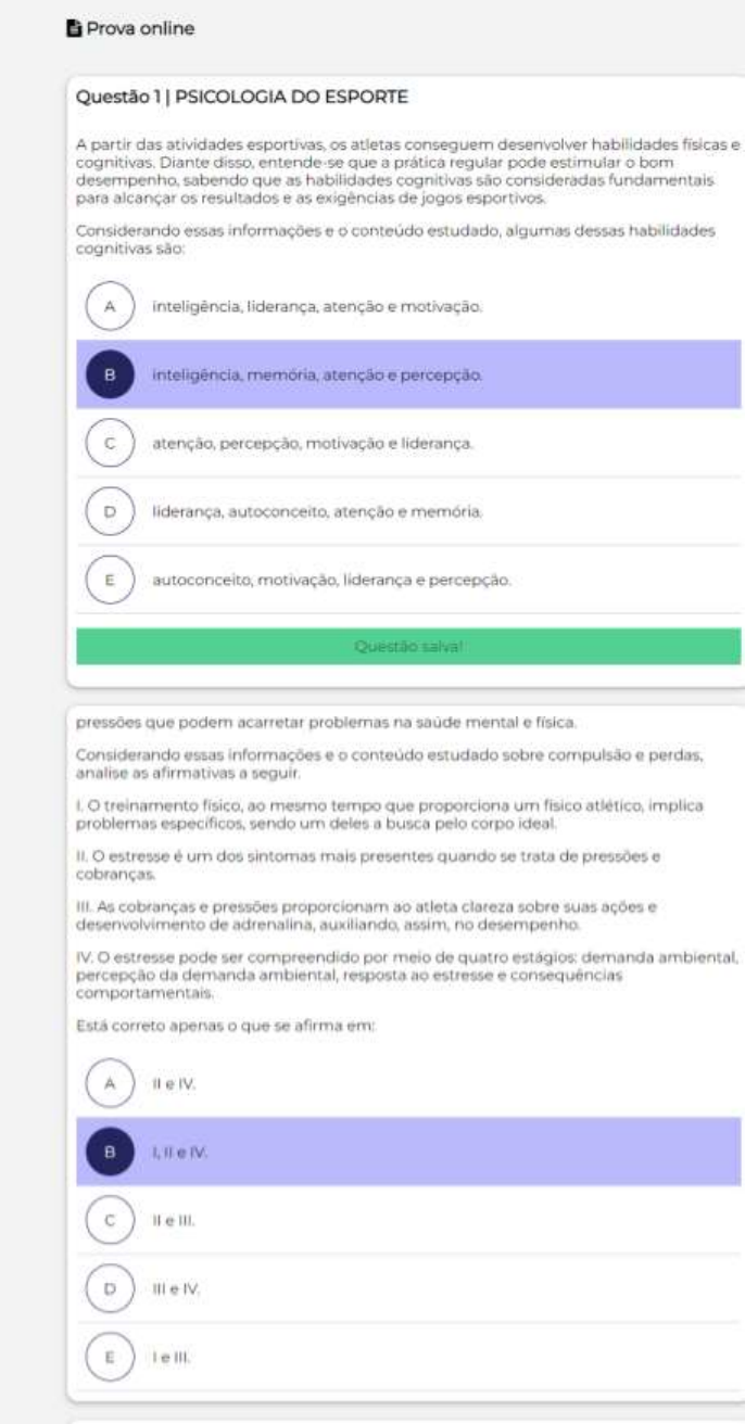 Prova online Questão PSICOLOGIA DO ESPORTE A partir das atividades esportivas, os atletas conseguem desenvolver habilidades e cognitivas. Diante entende-se que a prática regular pode estimular o bom sabendo que as habilidades cognitivas são consideradas fundamentais para alcançar resultados e as exigências de jogos Considerando essas informações e conteúdo algumas dessas habilidades cognitivas são: A atenção e B atenção e percepção. C motivação e D atenção e E liderança e Questão pressões que acarretar problemas na saúde mental e Considerando essas informações e o conteúdo estudado sobre compulsão e perdas, analise as afirmativas seguir. treinamento ao mesmo tempo que proporciona um fisico implica problemas sendo um deles a busca pelo corpo estresse é um dos sintomas mais presentes quando se trata de pressões e III. As cobranças e pressões proporcionam ao atleta clareza sobre suas ações e desenvolvimento de adrenalina, assim, no estresse pode ser compreendido por meio de quatro demanda percepção da demanda ambiental, resposta ao estresse e consequências Está correto apenas que se afirma em: A D III E IConsiderando essas informações e conteúdo sobre feedback intrinseco e analise as afirmativas a seguir e assinale para a(s) verdadeira(s) F para a(s) L ) feedback intrinseco pode ser separado em conhecimento de performance e conhecimento de ) feedback extrinseco envolve informações que o atleta recebe por meio de fontes sendo o uma ( ) As transmissões do feedback acontecer de forma verbal ou visual IV. ) feedback intrinseco precisa de fontes auxiliares para que o atleta perceba suas evoluções e assinale a alternativa que apresenta a sequência correta A B D V.V.F.V E Questão 4 PSICOLOGIA DO ESPORTE A prática do com decorrer dos anos, exige que o atleta tenha treinos intensos, além de excessos de cobranças provocadas pelo próprio por patrocinadores, pelos familiares e até mesmo por parte do próprio essas situações causam problemas emocionais que levam ao desgaste ou estresse e, em casos mais ao abandono e à aposentadoria Considerando essas pode-se afirmar que desgaste a desistência da prática esportiva e estresse estão associados A B desvalorização e desmotivação. estratégias de D sindrome de Burnout E Questão 5 PSICOLOGIA DO ESPORTE No a sindrome de muitas vezes não é identificada em curto prazo em árbitros ou em outros membros dentro do contexto podendo ocasionar consequências mais como abandono daNo a de Burnout muitas vezes não é identificada em curto prazo em atletas, árbitros ou em outros membros dentro do contexto podendo ocasionar consequências mais graves, como abandono da prática Considerando essas informações e conteúdo estudado sobre a sindrome de Burnout no analise as seguintes A dificuldade de avaliar o Burnout no esporte se da pela falta de medidas para avaliar a variável dentro desse A exaustão emocional é uma das dimensões que parte do Burnout III. Entre as dimensões que fazern parte do conjunto de é possível citar a IV. A redução da satisfação profissional está relacionada ao Burnout correto apenas o que se afirma em: A IV. B III IV. C D E III e IV. Considerando essas informações e o conteúdo estudado sobre reforçamento e a analise conceitos a seguir e associe-os com suas respectivas 2) 3) 4) Auxilia atletas a obter equilibrio mental e aumentando energia e Fornece dados sobre comportamentos e atitudes a serem Associa-se a respostas que os atletas recebem por suas podendo ser positivas ou Envolve níveis diferentes de sendo importante para contexto da aprendizagem das assinale a alternativa que apresenta a sequência correta A B D EQuestão 7 I PSICOLOGIA DO ESPORTE A pode ser considerada uma das principais características que um atleta deve uma vez que auxilia que ele desempenhe resultados melhores em competições por ter confiança e não duvidar de suas habilidades e Considerando essas informações e o conteúdo estudado sobre autoeficácia no esporte e a performance analise as afirmativas e assinale V para a(s) verdadeira(s) e F para a(s) autoeficácia acontece em momentos sendo desenvolvida quando a competição exige do atleta maior A autoeficácia geral engloba todos participantes sendo necessário atentar-se para habilidades e capacidades em A específica é demonstrada a partir do vínculo entre percepção e IV. ) A geral vai além das situações compreendendo tanto uma variável global como um traço de assinale a alternativa que apresenta a sequência A B D V. Questão 8 PSICOLOGIA DO ESPORTE esporte competitivo cria ambientes que proporcionam a formação e a personalidade dos Nesse sentido, os lideres devem motivar e inspirar os A liderança é identificada como uma das causas principais para o sucesso ou fracasso de um atleta ou Considerando essas informações e o conteúdo estudado sobre autoconceito e crenças, pode-se afirmar que as características de lider estão relacionadas A punição e B observação e agressividade, inspiração e D inspiração, aprendizagem e E agressividade e Questão 9 PSICOLOGIA DO ESPORTE A motivação tem relação com o feedback sendo uma forma de complemento para estimular inicio no além da permanência e do prazer pela Sabe-se que uma fatoresA motivação tem relação com sendo uma forma de complemento para estimular no além da permanência e do prazer pela Sabe-se que a motivação depende de uma série de que podem vir de fontes internas ou Considerando essas informações e o conteúdo estudado sobre a motivação intrinseca e analise as afirmativas a seguir. I motivo pela permanência inerente ao objeto de aprendizagem caracteriza uma motivação como postura corporal, controle de peso e alcance de metas são consideradas motivações III A motivação é um dos fatores que afetam rendimento dos A regulação externa, interiorizada e identificada são tipos de motivação correto apenas que se afirma em: A III e IV. B III.