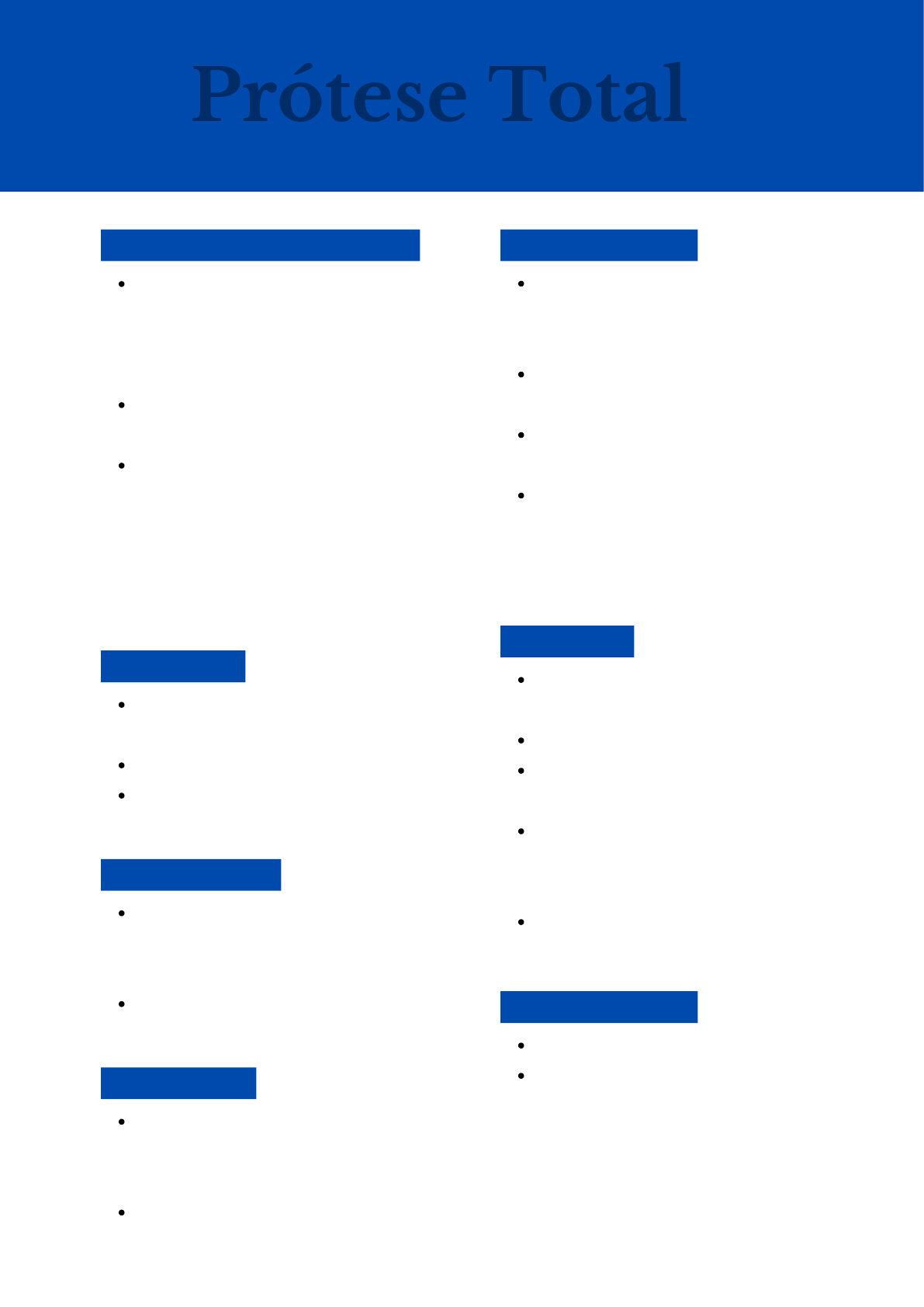 Prótese TotalPrótese Total Ajustes dos Planos de Orientação Referência para colocar os dentes, recuperar contorno do plano de orientação e sustentação dos tecidos do 1/3 inferior da face. Plano de cera superior: obedece parâmetros estéticos O que precisa?: Suporte do lábio;1. Altura incisal;2. Linha de sorriso;3. Formato do rebordo;4. Corredor bucal.5. Terços da face Inferior: mento à base do nariz (papel significativo na aparência); Médio: nariz à sobrancelha; Superior: Sobrancelha à base do cabelo. Proporções faciais Medidas com o compasso de willis para determinar se os terços são proporcionais; Base do nariz mento deve ser = comissura labial canto do olho. Linhas de referência O reposicionamento correto dos músculos orbiculares é essencial para a recuperação da estética; Sem suporte fica côncavo (nariz e queixo pra frente); Ref p/ posicionar dentes: base do nariz; Ângulo da base do nariz e lábio deve ser no máximo 90º (nas mulheres, menos que 90º para projetar mais o lábio.) Altura incisal Porção visível dos dentes com lábios em repouso; + Cera aparente = - Dente aparente Idosos: musculatura do lábio desce, difícil ver os dentes; Incisivo C em homens deve aparecer pelo menos 2mm em repouso; Incisivo C em mulheres deve aparecer 3-5mm em repouso. Corredor Bucal Espaço entre a VESTIBULAR dos superiores e a mucosa interna da bochecha. Se não tiver, dá a impressão de muitos dentes na boca. Linhas de referência Ajudam a posicionar os dentes; Horizontais e verticais; Linha Bipupilar;1. Curva de Spee;2. Linha do sorriso;3. Linha média;4. Linha dos caninos;5. Linha alta do sorriso.6. Linhas de ReferênciaLinhas de Referência Linha Bipupilar Passa ao centro das duas pupilas; Borda do Incisivo central deve ser paralela à ela; Paciente com plano de cera em boca, já aumentada em volume e comprimento; Uso da régua de fox. Curva de Spee É ascendente; Deve ser paralela ao plano de camper (asa do nariz ao trágus); Uso da régua de fox; Se o molar aparece + que o central, ela está errada. Linha do sorriso Suavemente ascendente, acompanha o lábio inferior; Deve aparecer mais o Incisivo Central; !!!!!! Quando os dentes posteriores aparecem + que anteriores, o sorriso está invertido !!!!!! Linha dos caninos A largura dos 6 anteriores deve ser = à largura da boca (comissura à comissura); As distais do 13 e 23 geralmente são as medidas. Linha Média Incisivos centrais devem estar alinhados à ela; Geralmente coincide com o filtrum (sulco acima do lábio superior). Linha alta do sorriso Marca o máximo sorriso, sorriso forçado; Acompanha lábio superior quando paciente força sorriso; Referência p/ o tamanho do ICS e largura dos anteriores; Em casos de paralisia/avc/etc um lado do sorriso pode subir + que o outro. Prótese TotalPrótese Total Plano de cera INFERIOR Acompanha o superior; Reestabelecer posição da mandíbula em relação à maxila nos planos H e V; Precisa achar DVO na hora de ajustar; Relação central ajuda a determinar a posição de mandíbula no sentido HORIZONTAL; DVO ajuda no sentido VERTICAL. Relação maxilo-mandibular Dimensão vertical (DV):1. Altura do 1/3 inferior em relação à maxila ou a relação espacial da mandíbula no sentido VERTICAL; Plano de cera superior e inferior darão a DV. Dimensão Vertical de Repouso (DVR): 2. Paciente em repouso, lábio selado sem tocar dentes; Uso do compasso de Willis. Espaço funcional livre (EFL):3. Entre as oclusais dos dentes com mandíbula em repouso; Tem em média 3mm Dimensão Vertical de Oclusão:4. Superiores e inferiores ocluindo; Não dá pra achar em desdentado; DVR - EFL = DVO. Método métrico Só usado em paciente com dentes; Distância entre a comissura palpebral e a comissura labial = distância entre a base do nariz e o mento. Pode usar com as duas bases de prova ocluindo. Método Fisiológico Faz em desdentado; Base do nariz ao mento, em repouso. DVO Aumentada Redução do EFL, contatos prematuros, danos em ATM, mastigação e fonação alteradas, distorção facial. Método Fonético Paciente precisa falar para conferir a fonética, caso esteja alterada, foi invadido o EFL. DVO Diminuída Aumento exagerado do EFL, redução da eficiência mastigatória, alteração dos movim. mandibulares, perda no tônus muscular, aspecto flácido, rugas e sulcos acentuados, lesões comissurais, dor nos músculos e ATM. Prótese TotalPrótese Total Relação Central Buscar posição terapêutica de equilíbrio neuromuscular com o sist. estomatognático e côndilos estabilizados nas fossas articulares. Formas de encontrar: Manipulação - língua pra trás, fecha a boca devagar, antes de tocar o primeiro dente é a RC 1. Fisiológico - quando a cera superior toca a inferior (enconstou, registra. 2. Seleção e Montagem dos Dentes A prótese é feita com dentes de estoque, comprados prontos. 2. Resina: VANTAGENS Mais mole que um dente (ajuste oclusal fácil); Ausência de ruído; Adere à base da PT; Melhor absorção das forças mastigatórias; DESVANTAGENS Instabilidade de cor; Alteração gradual da DVO; Higiene criteriosa. Desgasta com o tempo. Cerâmica:1. VANTAGENS Melhor manutenção da DVO; Estabilidade de cor; Higiene facilitada. DESVANTAGENS Não se utiliza mais; Custo elevado; Material duro, DIFICULTA AJUSTE OCLUSAL; Presença de ruído (dentes tocam o tempo todo); Espaço interoclusal diminuído; Produz abrasão se ocluir com dente natural; Não adere à resina; Risco de fratura. Seleção dos DentesSeleção dos Dentes Características Femininas Ausência de ângulos vivos; IL menores que os IC; IL e CS rotacionados para dentro, dando um ar de suavidade. Dentes mais arredondados. Características Senis Dentes mais escuros; Menor translucidez incisal; Cúspides caninas desgastadas; Recessões gengivais; Pequenos diastemas. Características Masculinas Prevalência de ângulos vivos; ILS com comprimento semelhante aos ICS; Dentes mais quadrados e proeminentes. Caracte