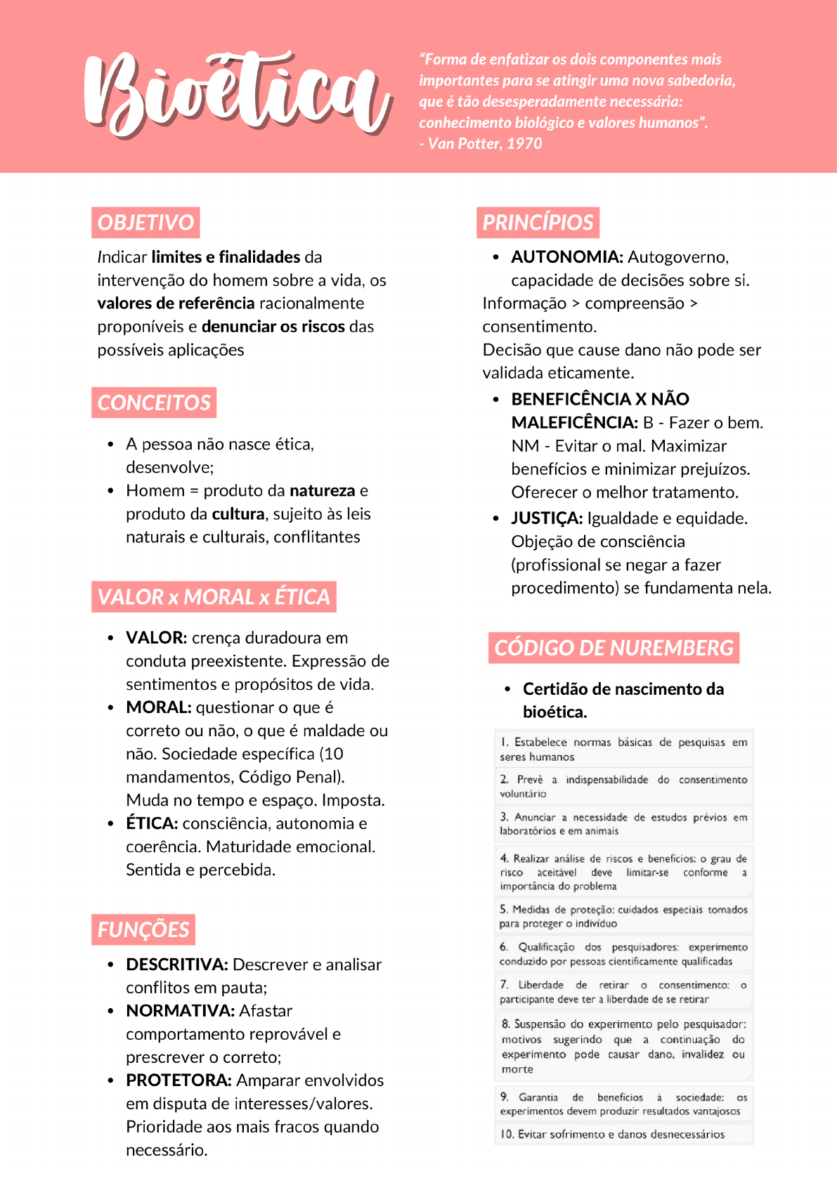 "Forma de enfatizar os dois componentes mais importantes para se atingir uma nova sabedoria, que é tão desesperadamente necessária: conhecimento biológico e valores humanos". Van Potter, 1970 OBJETIVO PRINCÍPIOS Indicar limites e finalidades da AUTONOMIA: Autogoverno, intervenção do homem sobre a vida, os capacidade de decisões sobre si. valores de referência racionalmente Informação > compreensão > proponíveis e denunciar os riscos das consentimento. possíveis aplicações Decisão que cause dano não pode ser validada eticamente. CONCEITOS BENEFICÊNCIA X NÃO MALEFICÊNCIA: B Fazer o bem. A pessoa não nasce ética, NM Evitar o mal. Maximizar desenvolve; benefícios e minimizar prejuízos. Homem = produto da natureza e Oferecer o melhor tratamento. produto da cultura, sujeito às leis JUSTIÇA: Igualdade e equidade. naturais e culturais, conflitantes Objeção de consciência (profissional se negar a fazer VALOR X MORAL X ÉTICA procedimento) se fundamenta nela. VALOR: crença duradoura em CÓDIGO DE NUREMBERG conduta preexistente. Expressão de sentimentos e propósitos de vida. Certidão de nascimento da MORAL: questionar o que é bioética. correto ou não, o que é maldade ou Estabelece normas básicas de pesquisas em não. Sociedade específica (10 seres humanos mandamentos, Código Penal). 2. Prevê a indispensabilidade do consentimento voluntário Muda no tempo e espaço. Imposta. ÉTICA: consciência, autonomia e 3. Anuncian a necessidade de estudos prévios em laboratórios e em animais coerência. Maturidade emocional. 4. Realizar análise de riscos e o grau de Sentida e percebida. risco aceitável deve limitar-se conforme a importância do problema 5. Medidas de proteção: cuidados especiais tomados FUNÇÕES para proteger o indivíduo 6. Qualificação dos pesquisadores: experimento DESCRITIVA: Descrever e analisar conduzido por pessoas cientificamente qualificadas conflitos em pauta; 7. Liberdade de retirar o consentimento: participante deve a liberdade de se retirar NORMATIVA: Afastar 8. Suspensão do experimento pelo pesquisador: comportamento reprovável e motivos sugerindo que a continuação do prescrever o correto; experimento pode causar dano. invalidez ou morte PROTETORA: Amparar envolvidos 9. Garantia de à sociedade: os em disputa de interesses/valores. experimentos devem produzir resultados vantajosos Prioridade aos mais fracos quando 10. Evitar sofrimento e danos desnecessários necessário.Etica em com humanos BANCO DE DENTES DECLARAÇÃO DE HELSINQUE DIRETRIZES ÉTICAS Falhas em nuremberg; INTERNACIONAIS 1964 aprovada (revisão); 1980 > OMS + Conselho para Bem-estar do ser humano > Organizações Internacionais de interesses da ciência/sociedade; Ciências Médicas (CIOMS) PRINCÍPIOS BÁSICOS P/ PRINCÍPIOS ÉTICOS REALIZAÇÃO DE PESQUISAS: FUNDAMENTAIS: 1. Proj. de pesq. antes deve ter 1. Princípio do respeito à pessoa, da avaliação dos riscos; autonomia ou do consentimento; 2. Precaução c/ personalidade da 2. Beneficência; pessoa ser alterada (drogas, 3. Justiça. procedimento); 3. Pesq. deve se adaptar aos princ. morais e científicos (experiências CNS 1/1998 de laboratório). 1° documento que regulamenta 4. Condução por pessoas normas das pesquisas em saúde. qualificadas; 5. Só faz se a importância do objetivo for proporcional ao risco. CNS N° 196/96 Estabelece normas de pesquisa PRIMEIRA REVISÃO DECLARADA envolvendo seres humanos. (1975): 1. Proj. e execução claramente PESQUISA EM SERES HUMANOS: formulados; 1. Envolvem indivíduos ou 2. Avaliação dos riscos comparando coletividades; c/ benefícios (interesses do 2. Entrevistas, aplicações de indivíduo prevalecem); questionários, banco de dados e 3. Direito de integridade e respeito revisões de prontuários. do sujeito da pesquisa (privacidade, NECESSIDADE DE REVISÃO minimizar impacto); PERIÓDICA; 4. Pesquisa só se seguros dos riscos; PRINCÍPIOS DA BIOÉTICA; 5. Publicação com exatidão dos ASSEGURAR DIREITOS E resultados; DEVERES À PARTICIPANTES, 6. Indivíduos informados sobre tudo e COMUNIDADE CIENTÍFICA E livres p/ retirar consentimento; ESTADO; 7. Pesquisador ter atenção c/ relação AMPLA ABRANGÊNCIA; de dependência; 8. Menores e incapazes consentimento do tutor legal;Etica em com BANCO DE DENTES CNS 466/12 PROIBIDO REMUNERAÇÃO; 5. Metodologia descrição breve, RESPEITO À DIGNIDADE; completa e clara das técnicas e PROTEÇÃO À IMAGEM E processos empregados; PRIVACIDADE; 6. TCLE Termo de consentimento livre RESPEITO À VALORES e esclarescido elaborado pelo CULTURAIS; pesquisador, de linguagem acessível e RISCO: obtido após o esclarescimento de todos 1. Possibilidade de danos físicos, os possíveis benefícios, riscos e psíquicos, morais, intelectuais, sociais, procedimentos; culturais ou espirituais. OBRIGADO APRESENTAR AO UTILIZAÇÃO DE MATERIAL COMITÊ DE ÉTICA EM PESQUISA BIOLÓGICO E DADOS só P/ (CEP); FINALIDADE PREVISTA NO OBRIGADO ACOMPANHAMENTO PROTOCOLO; DA EXECUÇÃO COM CONSENTIMENTO LIVRE E RELATÓRIOS; ESCLARESCIDO; CRIAÇÃO DA COMISSÃO ANÁLISE DOS RISCOS E NACIONAL DE ÉTICA EM BENEFÍCIOS; PESQUISA (CONEP); APRESENTAÇÃO DO PROJ. DE RESPONSABILIDADE DO CONEP PESQUISA; EM INSTAURAR SINDICÂNCIAS E PROTOCOLO DE PESQUISA INTERROMPER PESQUISAS. (PLATAFORMA BRASIL): 1. Informações preliminares termo de TCLE TERMO DE compromisso do pesquisador e da CONSENTIMENTO LIVRE E instituição, identificação do pesquisador responsável, membros ESCLARECIDO da equipe, instituição e CEP; Respeito à autonomia > sem 2. Área de estudo áreas temáricas e influência; de conhecimento do proj. de pesq., Respeito à dignidade; propósito do estudo, título da Confirmação de consentimento pesquisa e contato do pesquisador; voluntária e consciente; 3. Desenho de estudo/Apoio Paciente pode revogar; Financeiro identificar tipo de Validade e eficácia do abordagem, definir características consentimento: até os limites da básicas