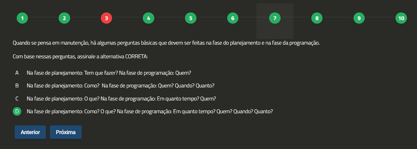 1 2 3 4 5 6 7 8 9 10 Quando se pensa em manutenção, há algumas perguntas básicas que devem ser feitas na fase do planejamento e na fase da programação. Com base nessas perguntas, assinale a alternativa CORRETA: A Na fase de planejamento: Tem que fazer? Na fase de Quem? B Na fase de planejamento: Como? Na fase de Quem? Quando? Quanto? Na fase de planejamento: que? Na fase de programação: Em quanto tempo? Quem? D Na fase de planejamento: Como? que? Na fase de programação: Em quanto tempo? Quem? Quando? Quanto? Anterior Próxima