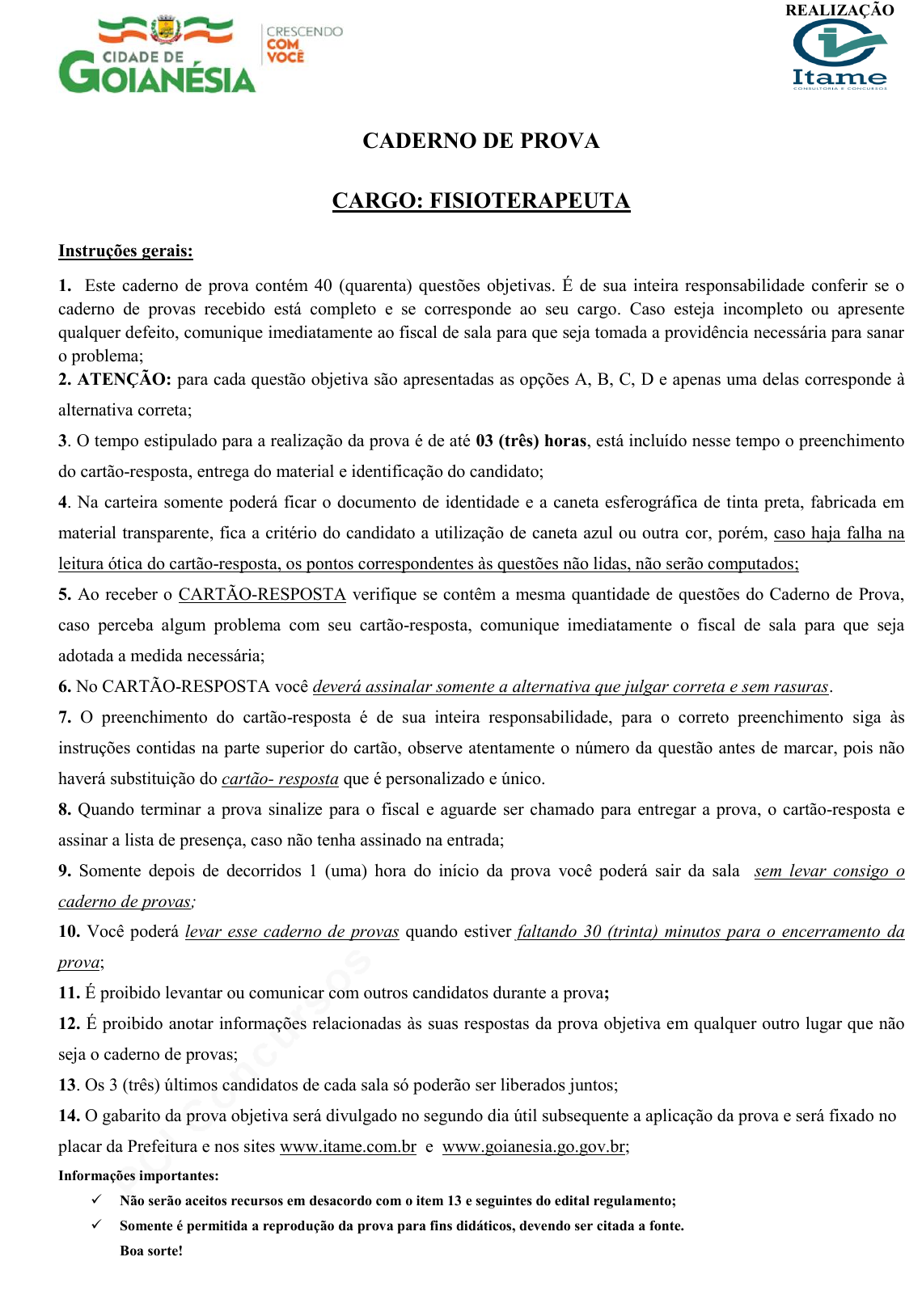 pcimarkpci MDAwMDowMDAwOjAwMDA6MDAwMDowMDAwOmZmZmY6Y2U1MTowMDky:V2VkLCAxOSBKdW4gMjAyNCAxMjozNjo1MCAtMDMwMA== www.pciconcursos.com.br REALIZAÇÃO CADERNO DE PROVA CARGO: FISIOTERAPEUTA Instruções gerais: 1. Este caderno de prova contém 40 (quarenta) questões objetivas. É de sua inteira responsabilidade conferir se o caderno de provas recebido está completo e se corresponde ao seu cargo. Caso esteja incompleto ou apresente qualquer defeito, comunique imediatamente ao fiscal de sala para que seja tomada a providência necessária para sanar o problema; 2. ATENÇÃO: para cada questão objetiva são apresentadas as opções A, B, C, D e apenas uma delas corresponde à alternativa correta; 3. O tempo estipulado para a realização da prova é de até 03 (três) horas, está incluído nesse tempo o preenchimento do cartão-resposta, entrega do material e identificação do candidato; 4. Na carteira somente poderá ficar o documento de identidade e a caneta esferográfica de tinta preta, fabricada em material transparente, fica a critério do candidato a utilização de caneta azul ou outra cor, porém, caso haja falha na leitura ótica do cartão-resposta, os pontos correspondentes às questões não lidas, não serão computados; 5. Ao receber o CARTÃO-RESPOSTA verifique se contêm a mesma quantidade de questões do Caderno de Prova, caso perceba algum problema com seu cartão-resposta, comunique imediatamente o fiscal de sala para que seja adotada a medida necessária; 6. No CARTÃO-RESPOSTA você deverá assinalar somente a alternativa que julgar correta e sem rasuras. 7. O preenchimento do cartão-resposta é de sua inteira responsabilidade, para o correto preenchimento siga às instruções contidas na parte superior do cartão, observe atentamente o número da questão antes de marcar, pois não haverá substituição do cartão- resposta que é personalizado e único. 8. Quando terminar a prova sinalize para o fiscal e aguarde ser chamado para entregar a prova, o cartão-resposta e assinar a lista de presença, caso não tenha assinado na entrada; 9. Somente depois de decorridos 1 (uma) hora do início da prova você poderá sair da sala sem levar consigo o caderno de provas; 10. Você poderá levar esse caderno de provas quando estiver faltando 30 (trinta) minutos para o encerramento da prova; 11. É proibido levantar ou comunicar com outros candidatos durante a prova; 12. É proibido anotar informações relacionadas às suas respostas da prova objetiva em qualquer outro lugar que não seja o caderno de provas; 13. Os 3 (três) últimos candidatos de cada sala só poderão ser liberados juntos; 14. O gabarito da prova objetiva será divulgado no segundo dia útil subsequente a aplicação da prova e será fixado no placar da Prefeitura e nos sites www.itame.com.br e www.goianesia.go.gov.br; Informações importantes: Não serão aceitos recursos em desacordo com o item 13 e seguintes do edital regulamento; Somente é permitida a reprodução da prova para fins didáticos, devendo ser citada a fonte. Boa sorte! pcimarkpci MDAwMDowMDAwOjAwMDA6MDAwMDowMDAwOmZmZmY6Y2U1MTowMDky:V2VkLCAxOSBKdW4gMjAyNCAxMjozNjo1MCAtMDMwMA== www.pciconcursos.com.br Prefeitura Municipal de Goianésia-Go – Fisioterapeuta 1 Leia o texto e responda as questões de 1 a 6. Trecho de A Filha Perdida. Elena Ferrante Eu estava dirigindo havia pouco menos de uma hora quando comecei a passar mal. A queimação na lateral do corpo reapareceu, mas de início decidi não dar importância àquele sinal. Só me preocupei quando percebi que não tinha mais forças para segurar o volante. Em poucos minutos, minha cabeça ficou pesada, os faróis me pareceram cada vez mais fracos e logo esqueci até que estava dirigindo. Em vez disso, tive a impressão de que estava no mar, em pleno dia. A praia estava vazia, e a água, calma, mas em um mastro a poucos metros da orla tremulava a bandeira vermelha. Quando eu era pequena, minha mãe me colocava muito medo, dizendo: Leda, você nunca deve entrar no mar se vir a bandeira vermelha, pois significa que o mar está muito agitado e que pode se afogar. O medo perdurou ao longo dos anos e, ainda hoje, mesmo que a água parecesse uma folha de papel translúcida que se esticava até o horizonte, eu não ousava mergulhar. Sentia-me ansiosa. Dizia a mim mesma: vá, mergulhe; devem ter esquecido a bandeira no mastro. E, enquanto isso, eu ficava na beirada testando cuidadosamente a água com a ponta do pé. [...] No hospital, quando eu abri os olhos, me vi novamente, por uma fração de segundo, incerta diante do mar calmo. Talvez por isso, mais tarde, tenha me convencido de que não se tratava de um sonho, mas de um devaneio de pavor, que durou até que eu acordasse na enfermaria. Soube pelos médicos que eu havia batido na barra de proteção da estrada, mas sem graves consequências. [...] Falei que o sono é o que me fizera sair da estrada. Mas eu sabia perfeitamente que esse não fora o verdadeiro motivo. O motivo havia sido um gesto sem sentido, sobre o qual, justamente por ser sem sentido, decidi não contar a ninguém. As coisas mais difíceis de falar são as que nós mesmo não conseguimos entender. 1. No início do texto, a personagem Leda relata o momento em que antecede um acidente de carro sofrido por ela. Entre o acidente e o hospital, a personagem também relata algumas lembranças de infância que a fizeram ter medo de entrar no mar. A quem ela atribui esse trauma? (A) À mãe. (B) Ao mar. (C) À bandeira. (D) Ao acidente. 2. Analise o trecho retirado do texto e marque a alternativa correta quanto ao tipo de discurso usado. “Quando eu era pequena, minha mãe me colocava muito medo, dizendo: Leda, você nunca deve entrar no mar se vir a bandeira vermelha, pois significa que o mar está muito agitado e que pode se afogar”. (A) A mudança da voz da narradora para a voz da personagem é indicada pelo uso de vírgula, dois pontos e letra maiúscula. (B) A narradora uti