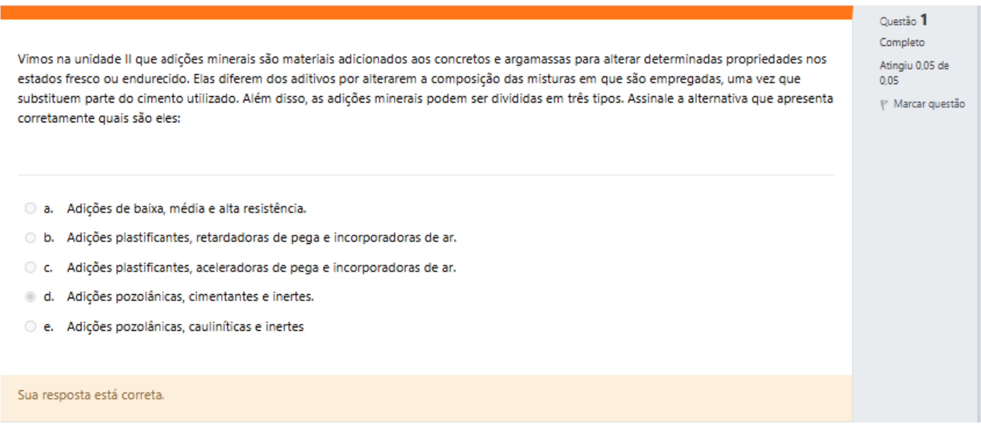 Questão 1 Completo Vimos na unidade que adições minerais são materiais adicionados aos concretos e argamassas para alterar determinadas propriedades nos Atingiu 0,05 de estados fresco ou endurecido. Elas diferem dos aditivos por alterarem a composição das misturas em que são empregadas, uma vez que 0,05 substituem parte do cimento utilizado. Além disso, as adições minerais podem ser divididas em três tipos. Assinale a alternativa que apresenta Marcar questão corretamente quais são eles: a. Adições de baixa, média e alta resistência. b. Adições plastificantes, retardadoras de pega e incorporadoras de ar. Adições plastificantes, aceleradoras de pega e incorporadoras de ar. d. Adições pozolânicas, cimentantes e inertes. e. Adições pozolânicas, cauliníticas e inertes Sua resposta está correta.Questão 2 Completo A brita consiste em um agregado oriundo da britagem de uma rocha maior, que pode ser do tipo basalto, granito, calcário, gnaisse, entre Atingiu 0,05 de outras. processo de britagem resulta em diferentes tamanhos de pedras que podem ser utilizadas em diversas aplicações. 0,05 Marcar questão Em relação às britas, analise as afirmativas a seguir e assinale a alternativa correta: - A pedra britada é dividida em quatro categorias, conforme o diâmetro médio dos grãos: brita 1, brita 2, brita 3 e brita 4. - Britas são bons exemplos de agregados graúdos utilizados nas construções. III - Rachão é o nome dado ao material que passa no britador primário e passa pela peneira de 76 mm. IV - A brita tipo 4 pode ser utilizada na produção de concreto massa e ciclópico. a. II, III e IV estão corretas. b. e estão e IV estão corretas. d. I, II, III e IV estão corretas. e. I, e III estão corretas. Sua resposta está correta.Questão 3 Completo Em relação à trabalhabilidade do concreto, analise as afirmativas a seguir e assinale a alternativa correta: Atingiu 0,05 de 0,05 P Marcar questão - A trabalhabilidade está diretamente relacionada à fluidez e à coesão do concreto. - No Brasil, a trabalhabilidade deve ser avaliada exclusivamente a partir do ensaio do abatimento de tronco de cone. III - tronco de cone utilizado no ensaio para avaliação da trabalhabilidade possui 20 cm de altura, 10 cm de diâmetro no topo e 30 cm de diâmetro na base. IV - tronco de cone é preenchido com três camadas de concreto e cada uma é compactada com 25 golpes. a. Apenas I, III e IV estão corretas. b. Apenas III e IV estão corretas Apenas e IV estão corretas. d. Todas as alternativas estão corretas. Apenas e estão corretas. Sua resposta está correta.Questão 4 Completo Material obtido a partir da calcinação de rochas calcárias, compostas principalmente por óxidos de cálcio e pequenas quantidades de Atingiu 0,05 de impurezas como sílica, óxidos de ferro e óxidos de alumínio. 0,05 Marcar questão Assinale a alternativa que indica o material ao qual corresponde à definição apresentada acima: a. Escória de alto forno. b. Gesso. d. Cimento Portland. Cal. Sua resposta está correta.Questão 5 Completo processo de produção do concreto inclui as etapas de mistura, transporte, lançamento, adensamento e cura. Em relação a essas etapas, Atingiu 0,05 de classifique as assertivas a seguir em verdadeiras (V) ou falsas (F) e assinale a alternativa correta: 0,05 Marcar questão ( ) A mistura do concreto deve ser feita necessariamente de forma mecanizada, com o auxílio de ( ) Na etapa de adensamento, as armaduras devem ser vibradas para favorecer a aderência com o concreto. ( ) processo de cura do concreto pode ser feito por meio do recobrimento da superfície com papéis ( ) A altura máxima de lançamento em concretagens comuns é de 2,50 metros. a. F, F, F, F. b. V, F, V. V, F, V, V. d. F, F, e. V, F, F, V. Sua resposta está correta.Questão 6 Completo Trata-se de um aglomerante simples obtido a partir da calcinação de uma rocha chamada gipsita. processo de obtenção desse material Atingiu 0,05 de consiste em três etapas básicas: extração, redução de tamanho e calcinação. Na construção civil, é comumente utilizado na fabricação de 0,05 ornamentos, painéis para paredes, e na execução de revestimentos. Marcar questão Assinale a alternativa que indica o material ao qual corresponde à definição apresentada acima: a. Cal. b. Gesso. Cimento branco. d. Argila expandida. e. Sua resposta está correta.Questão 7 Completo As adições têm o objetivo de melhorar características físicas, químicas e mecânicas das misturas em que o cimento será empregado. Em Atingiu 0,00 de relação a essas substâncias, classifique as assertivas a seguir em verdadeiras (V) ou falsas (F) e assinale a alternativa correta: 0,05 P Marcar questão ( ) o cimento com adição de material pozolânico é representado pela sigla CP II - P. ( ) Cimentos com adição de escória granulada de alto forno são indicados para estruturas que exijam rápida liberação de calor. cimento Portland comum pode possuir adições, sendo representado, nestes casos, pela sigla CP - S. ( ) A adição de material pozolânico reduz a permeabilidade da pasta em que é empregado. a. F, F, V. b. V. F, F, V. d. F, F, V, F. e. V, V. Sua resposta está incorreta.Questão 8 Completo Sedimento fluvial de rocha ígnea, formado de grãos de diâmetro em geral superior a 5 mm, e cujos maiores grãos podem atingir diâmetros Atingiu 0,05 de de até 100 mm. Os grãos apresentam formato arredondado devido à ação das águas, razão pela qual também são chamados de seixos 0,05 rolados. Marcar questão Assinale a alternativa que indica o material ao qual corresponde a definição apresentada a. Escória de alto forno. b. d. Brita. e. Cascalho Sua resposta está correta.Questão 9 Completo concreto é o material de construção mais utilizado. Apesar de não ser tão resistente quanto o aço, ele possui vantagens como a sua elevada Atingiu 0,05 de resistência à água, a facilidade de mol