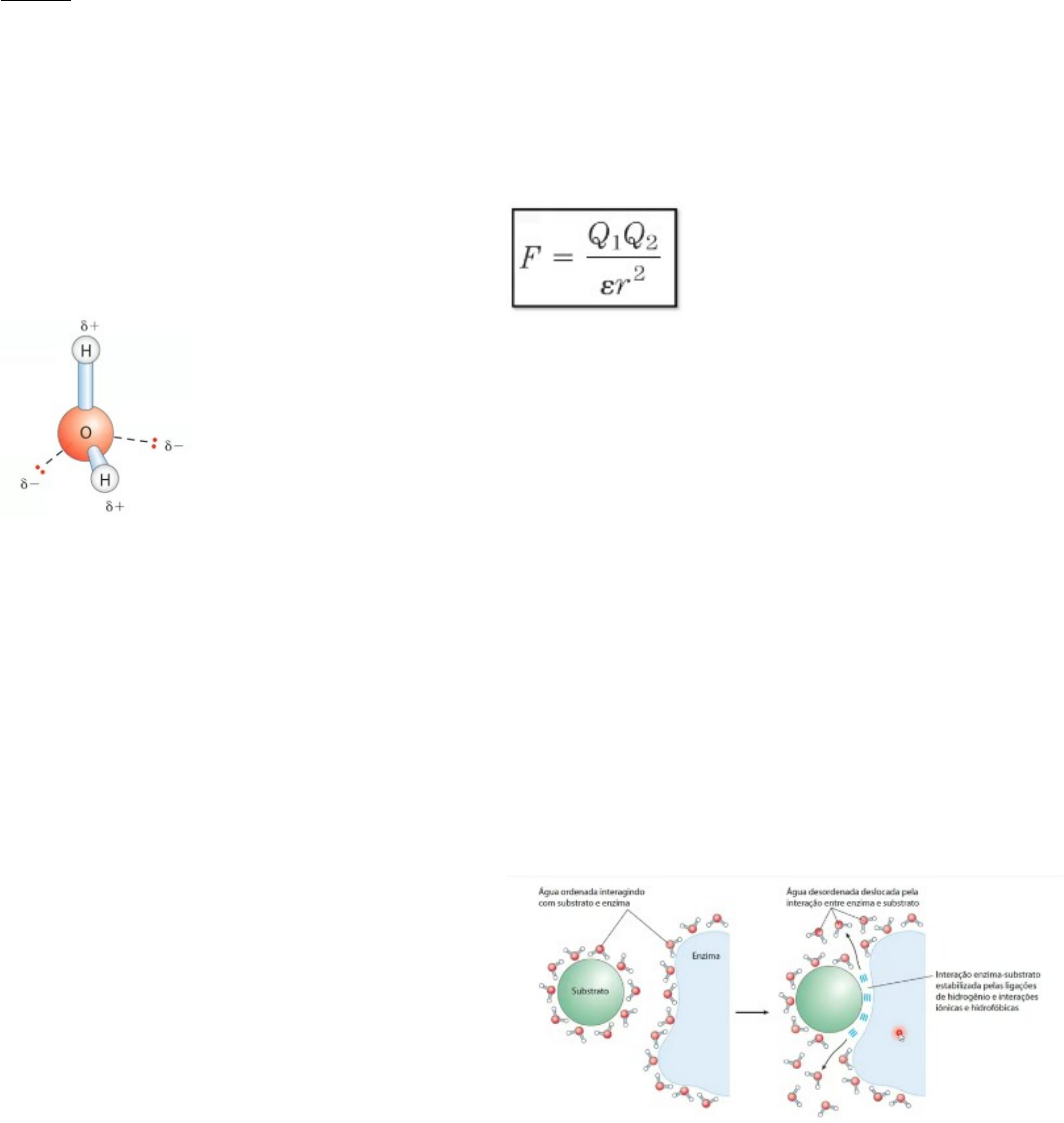 DATA: 01/06/2021 FISIOTERAPIA UNIFAL PROFESSOR: Marina BIOQUÍMICA Água, PH eTampões Biológicos ÁGUA: - As célular tem 70% de água - Solvente das células - As interações que a água faz com as moléculas interferem nas conformações das reações ° Estrutura da molécula de água: - Molécula polar Dois H ( densidade de carga + ) ligados a um O ( densidade de carga - ) Ligação de Hidrogênio: FON - A água pode fazer ligação de hidrogênio com outras moléculas de água ou com outras moléculas diferentes que possuem aceptores de hidrogênio 10% de compartilhamento de elétron e 90% de aproximação de cargas - As ligações de hidrogênio são responsáveis pelas propriedades incomuns da água, como seu ponto de fusão de 0°C e ponto de ebulição de 100°C. Esses pontos são dirigidos pelo aumento da entropia - No gelo as ligações de hidrogênio são máximas ( molécula tem menos mobilidade de movimentação ) - Densidade do gelo é menor, por conta da organização das moléculas ( ficam maiores ) e com isso o volume aumenta - A medidade que o ângulo da ligação diminui de 180° ela se torna mais fraca - A medida que se rompe ou forma ligações, mais fácil se torna de romper ou formar as próximas ° O oléo se junta (porções apolares interagem) para diminuir a superfície de contato com a água Polares: OH livres para fazer ligações de hidrogênio Apolares: grande cadeia e não possuem O para ligação Anfipática: possue cadeia apolar e partes polares F= força da interação iônica € = constante dielétrica do meio ( da água é maior, então a força de interação é menor, ou seja, mais fácil de dissolver compsotos ) Estratégias dos sistemas biológicos para transporte do O2: - É necessário que a molécula esteja interagindo com uma porção Hidrofóbica e uma porção Hidrofílica ( para se ligar com a água ) Ex: a hemoglobina A ligação de um substrato polar ( reagente ) a uma superfície polar complementar de uma enzima: aumento da entropia! A enzima utiliza a energia de ligação liberada na reação para diminuir a energia de ativação da reação esperada. Ligações de hidrogênio, iônicas, hidrofóbicas e de van der Waals: Interações de van der Waals: os átomos são atraidos e as nuvens eletrônicas interagem entre si até certo ponto, no qual ocorre a repulsão dos átomos ( energia aumenta ) - Raio atomico de van der Waals é a distância ideal As interações fracas: - Para macromoléculas, a estrutura mais estável é aquela em que as interações fracas são maximizadas ( de forma a manter uma mobilidade da molécula ) - Estabilizam e determinam a especificidade da ligação de pequenas moléculas a proteínas (possuem um núcleo hidrofóbico e um contorno hidrofílico) Osmose e pressão osmótica: ° Osmose é o movimento da água através de uma membrana smipermeável ocasionado por diferenças na pressão osmótica ° A pressão osmótica é a medida como a força que deve ser aplicada para que a solução no tubo retorne ao nível que estava no béquer, sendo proporcional à altura, h Ic= osmolaridade da solução ( quantidade de glicose na solução ) R= constante dos gases T= temperatura absoluta Participação da água em reações biológicas: Água pura é levemente ionizada: A ionização da água é expressa por: Kc= constante de equilíbrio [H2O] = 55,5m [H+] = [OH-] = 10-7 ESCALA DE PH: pH= -log[H+] pOH= -log [OH-] Ácidos e bases fracos são comuns nos sistemas biológicos e desempenham papéis importantes no metabolismo e sua regulação Ácidos: Ácidos fracos não se dissociam completamente Ácidos fortes se dissociam completamente em meio aquoso pKa= capacidade de perder um próton pKa= -logKa As curvas de titulação revelam o pKa de ácidos fracos: Ponto onde o valor de pH é igual ao valor de pKa Faixa de tamponação: quando o pH está um ponto acima do pKa, tem 10x mais da base conjugada e quando o pH está um ponto abaixo do pKa, tem 10x mais do ácido TAMPÕES: - São misturas de ácidos fracos e suas bases conjugadas - Sistemas aquosos que tendem a resistir a mudanças de pH quando pequenas quantidades de ácido ou base são adicionadas Equação de Henderson-Hasselbalch: Concentração de base igual a concentração de ácido o pH é igual ao pKa Por que controlar o pH em sistemas biológicos? - organismos vivos estão em ambiente aquoso - o estado de protonação dos grupos funcionais nas biomoléculas influencia a estrutura e a função - atividade enzimática é fortemente influenciada pelo pH pH ótimo das enzimas é relativo, por ser específico de suas funções: Efeito de Bohr: o estado de protonação determina a afinidade de hemoglobina por O2 e CO2 4 image5.png image6.png image7.png image8.png image9.png image10.png image11.png image12.png image13.png image14.png image15.png image16.png image17.png image1.png image2.png image3.png image4.png