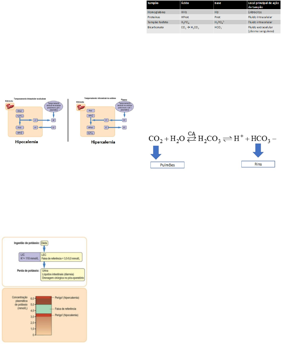 DATA: 07/06/2021 FISIOTERAPIA UNIFAL PROFESSOR: Marina BIOQUÍMICA Desordens do equilíbrio ácido-básico O pH em sistemas biológicos: ° É essencial o controle do pH dos sistemas biológicos - O pH tecidual pode estar relacionado à função do órgão ou tecido - Nos tecidos, o pH do líquido intersticial pode afetar o transporte de íons pela membrana ( precisa ser controlado ) Ex: trocador de K+ e H+ -> afeta a contrabilidade muscular Hipocalemia redução do transporte de potássio da célula para fora dela Hipercalemia aumento do transporte de potássio da célula para fora dela ° Alterações na concentração plasmática de potássio afetam a contrabilidade do músculo cardíaco e oferecem risco à vida Tampões biológicos: ácidos ou bases fracas tamponam células e tecidos contra as mudanças de pH A protonação ou desprotonação de grupos ionizáveis nas cadeias laterais dos resíduos de aminoácidos nas proteínas contribuem para o tamponamento intracelular O sistema tampão bicarbonato no plasma sanguíneo ( pH 7,4 ) : - Sistema mais resistente à variações de H+ do que a de OH- No pH disiológico, a [HCO3] é 20 vezes superior à [CO2] fazendo com que de imediato, o sistema tampão bicarbonato seja mais efetivo para resistir à acidificação Os eritrócitos e as célular tubulares renais possuem uma enzima que contém zinco, a anidrase carbônica (CA), que converte CO2 dissolvido em ácido carbônico. Este se dissocia, produzindo íons hidrogênio e bicarbonato. É dessa forma que as células tubulares renais e os eritrócitos produzem bicarbonato. -Os rins regulam a reabsorção e síntese de bicarbonato -Os eritrócitos ajustam a concentração de bicarbonato em resposta a alterações na Pco2 Distúrbios do sistema ácido-básico: definições: ° Acidemia – é um excesso de íon hidrogênio no sangue ° Alcalemia – é a concentração diminuída de íon hidrogênio no sangue ° Acidose – é o processo que leva à acumulação do íon hidrogênio ( fora dos valores de pH normais ) ° Alcalose – é o processo que diminui a quantidade de íon hidrogênio ( fora dos valores de pH normais) Acidose respiratória: causada por doenças pulmonares que afetam as trocas gasosas Alcalose respiratória:causada por hiperventilação, reduz a pCO2 Acidose metabólica: resulta tanto da produção em excesso como da retenção de ácidos não voláteis na circulação Alcalose metabólica: causada por vômitos e aspiração gástrica, ambas causam perde de íon hidrogênio do estômago ° Diabetes não tratada produz acidose, ameaça a vida 2 image5.png image6.png image7.png image8.png image9.png image1.png image2.png image3.png image4.png
