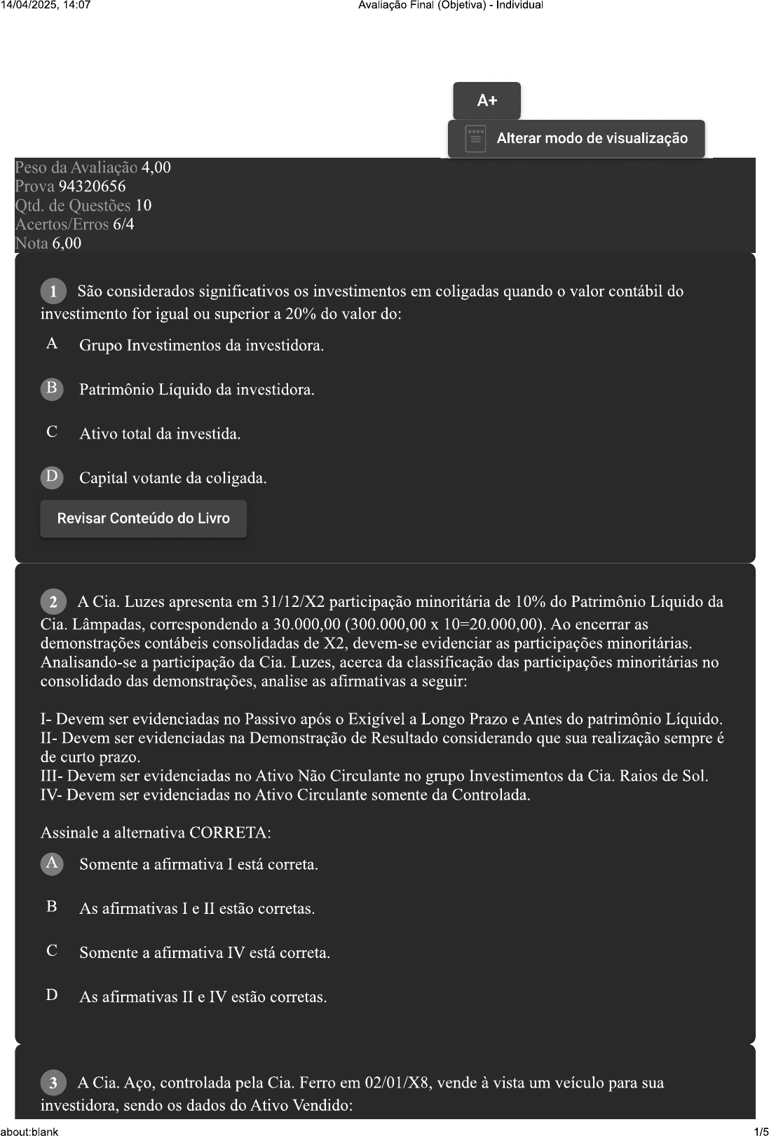 14/04/2025, 14:07 Avaliação Final (Objetiva) - Individual A+ Alterar modo de visualização Peso da Avaliação 4,00 Prova 94320656 Qtd. de Questões 10 Acertos/Erros 6/4 Nota 6,00 1 São considerados significativos os investimentos em coligadas quando valor contábil do investimento for igual ou superior a 20% do valor do: A Grupo Investimentos da investidora. B Patrimônio Líquido da investidora. C Ativo total da investida. D Capital votante da coligada. Revisar Conteúdo do Livro 2 A Cia. Luzes apresenta em 31/12/X2 participação minoritária de 10% do Patrimônio Líquido da Cia. correspondendo a 30.000,00 (300.000,00 X 10=20.000,00). Ao encerrar as demonstrações contábeis consolidadas de X2, devem-se evidenciar as participações minoritárias. Analisando-se a participação da Cia. Luzes, acerca da classificação das participações minoritárias no consolidado das demonstrações, analise as afirmativas a seguir: I- Devem ser evidenciadas no Passivo após Exigível a Longo Prazo e Antes do patrimônio Líquido. II- Devem ser evidenciadas na Demonstração de Resultado considerando que sua realização sempre é de curto prazo. III- Devem ser evidenciadas no Ativo Não Circulante no grupo Investimentos da Cia. Raios de Sol. IV- Devem ser evidenciadas no Ativo Circulante somente da Controlada. Assinale a alternativa CORRETA: A Somente a afirmativa I está correta. B As afirmativas I e II estão corretas. C Somente a afirmativa IV está correta. D As afirmativas II e IV estão corretas. 3 A Cia. Aço, controlada pela Cia. Ferro em 02/01/X8, vende à vista um veículo para sua investidora, sendo os dados do Ativo Vendido: about:blank 1/514/04/2025, 14:07 Avaliação Final (Objetiva) Individual Custo histórico: $ 70.000,00. Depreciação Acumulada 30.000,00. Valor da Venda: $ 35.000,00. A taxa anual de depreciação: O período contábil das empresas é encerrado ao final de dezembro, ambas são Cias. abertas e pertencem ao mesmo conglomerado. Diante desse cenário, classifique V para as sentenças verdadeiras e F para as falsas: ( ) O valor a ser ajustado na consolidação para a conta de Máquinas e Equipamentos é $ 40.000,00. ( ) O valor registrado na consolidação na Conta de Veículos será $ ( ) O valor líquido apurado como resultado não realizado na consolidação corresponde a $ ( ) O lucro apurado na consolidação será de Assinale a alternativa que apresenta a sequência CORRETA: A B F-V-V-V C F-F-V-V D Revisar Conteúdo do Livro 4 Está ligada ao grau de satisfação que ser humano tem ao suprir determinada necessidade. Quanto maior número de pessoas que tendem a adquirir determinado produto ou serviço, consequentemente estes podem se tornar escassos. Do que estamos falando? A Teoria da utilidade. B Teoria da oportunidade. C Teoria da D Teoria da lógica. 5 Conforme Iudícibus et conceito básico do método de equivalência patrimonial é fundamentado no fato de que resultado e quaisquer outras variações patrimoniais da investida sejam reconhecidos na investidora no momento de sua geração na investida, independente dessa variação ser ou não distribuída. Partindo desse pressuposto, classifique V para as sentenças verdadeiras e F para as falsas: ( ) O período de abrangência das demonstrações contábeis da coligada e controlada deverá ser idêntico ao da investidora, independentemente das respectivas datas de encerramento. ( ) Não se admite a utilização de períodos não idênticos, ainda que esse represente melhoria na qualidade da informação. about:blank 2/514/04/2025, 14:07 Avaliação Final (Objetiva) - Individual ( ) Quando forem utilizados períodos não idênticos entre os balanços da investidora e investida, fato deverá ser informado em notas explicativas. ( ) Quando aumento do investimento tiver como origem Lucro Líquido apurado pela investida, será contabilizado como Receita Operacional na investidora. ( ) Quando a redução do investimento tiver como origem Prejuízo apurado pela investida, será contabilizado na investidora como Despesa Operacional. Agora, assinale a alternativa que apresenta a sequência CORRETA: FONTE: IUDÍCIBUS, Sérgio de et al. Manual de contabilidade das sociedades por ações: aplicável a todas as sociedades de acordo com as normas internacionais e do CPC. São Paulo: Atlas, 2010. A F-F-V-F-F B V-F-V-V-V D 6 Entende-se que EVA é um instrumento que se propõe a medir a criação de valor (ou destruição) centrada num período determinado. Sua base de cálculo é lucro operacional da empresa menos custo do capital investido. Suponhamos uma situação em que lucro operacional líquido da empresa seja de $ 250, capital $ 1.000, e C* (custo de oportunidade arbitrado pelo investidor), 15%. O valor calculado do EVA seria: EVA Lucro operacional líquido C* X capital. Assinale a alternativa CORRETA que apresenta resultado do EVA dessa empresa: A B 150. C 200. D 7 A empresa Margarida Ltda, em 31/12/2009, apresentou seguinte valor do Patrimônio Líquido: Capital Social 2.000.000,00 Reservas de Capital 400.000,00 Reservas de Reavaliação 500.000,00 Reservas de Lucros 1.600.000,00 Total 4.500.000,00 Obs.: Lucro no ano de 2008 antes dos impostos: 150.000,00. A Taxa de Juros de Longo Prazo (TJLP) de 2008 é de 10% (valor hipotético). O valor dos juros sobre próprio capital que poderá ser deduzido na apuração do Lucro Real pela Cia. PVSN, em 31/12/2008. e valor do Imposto de Renda na Fonte sobre ele incidente, são, respectivamente (em R$): about:blank 3/514/04/2025, 14:07 Avaliação Final (Objetiva) Individual A O valor dos juros sobre capital próprio é de R$ 600.000,00 e do Imposto de Renda na Fonte é de R$ 60.000,00. B O valor dos juros sobre capital próprio é de R$ 400.000,00 e do Imposto de Renda na Fonte é de R$ 40.000,00. O valor dos juros sobre capital próprio é de R$ 400.000,00 e do Imposto de Renda na Fonte é de 60.000,00. D O valor dos juros sobre capital próprio é de R$ 60.000,00 e do 