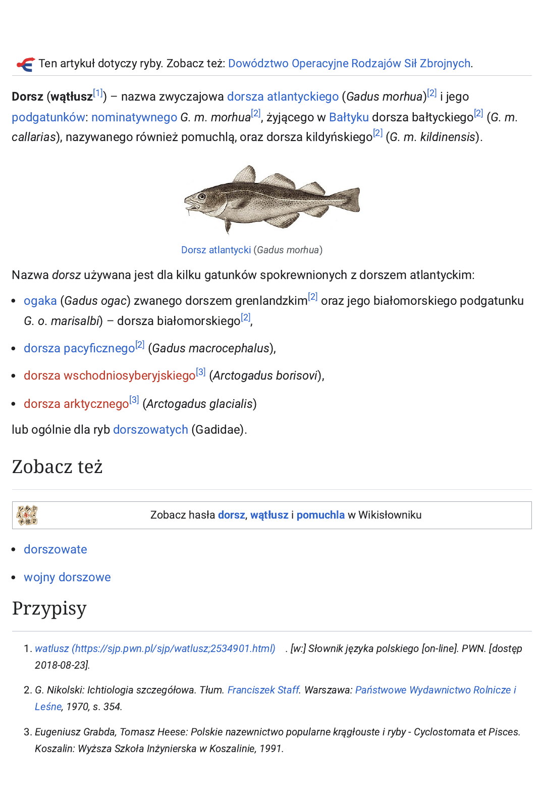 Dorsz Ten artykuł dotyczy ryby. Zobacz też: Dowództwo Operacyjne Rodzajów Sił Zbrojnych. Dorsz (wątłusz[1]) – nazwa zwyczajowa dorsza atlantyckiego (Gadus morhua)[2] i jego podgatunków: nominatywnego G. m. morhua[2], żyjącego w Bałtyku dorsza bałtyckiego[2] (G. m. callarias), nazywanego również pomuchlą, oraz dorsza kildyńskiego[2] (G. m. kildinensis). Dorsz atlantycki (Gadus morhua) Nazwa dorsz używana jest dla kilku gatunków spokrewnionych z dorszem atlantyckim: ogaka (Gadus ogac) zwanego dorszem grenlandzkim[2] oraz jego białomorskiego podgatunku G. o. marisalbi) – dorsza białomorskiego[2], dorsza pacyficznego[2] (Gadus macrocephalus), dorsza wschodniosyberyjskiego[3] (Arctogadus borisovi), dorsza arktycznego[3] (Arctogadus glacialis) lub ogólnie dla ryb dorszowatych (Gadidae). Zobacz hasła dorsz, wątłusz i pomuchla w Wikisłowniku dorszowate wojny dorszowe 1. watlusz (https://sjp.pwn.pl/sjp/watlusz;2534901.html) . [w:] Słownik języka polskiego [on-line]. PWN. [dostęp 2018-08-23]. 2. G. Nikolski: Ichtiologia szczegółowa. Tłum. Franciszek Staff. Warszawa: Państwowe Wydawnictwo Rolnicze i Leśne, 1970, s. 354. 3. Eugeniusz Grabda, Tomasz Heese: Polskie nazewnictwo popularne krągłouste i ryby - Cyclostomata et Pisces. Koszalin: Wyższa Szkoła Inżynierska w Koszalinie, 1991. Zobacz też Przypisy https://pl.m.wikipedia.org/wiki/Wikipedia:Strona_ujednoznaczniaj%C4%85ca https://pl.m.wikipedia.org/wiki/Wikipedia:Strona_ujednoznaczniaj%C4%85ca https://pl.m.wikipedia.org/wiki/Dow%C3%B3dztwo_Operacyjne_Rodzaj%C3%B3w_Si%C5%82_Zbrojnych https://pl.m.wikipedia.org/wiki/Dorsz_atlantycki https://pl.m.wikipedia.org/wiki/Podgatunek https://pl.m.wikipedia.org/wiki/Podgatunek_nominatywny https://pl.m.wikipedia.org/wiki/Morze_Ba%C5%82tyckie https://pl.m.wikipedia.org/wiki/Plik:Atlantic_cod.jpg https://pl.m.wikipedia.org/wiki/Plik:Atlantic_cod.jpg https://pl.m.wikipedia.org/wiki/Dorsz_atlantycki https://pl.m.wikipedia.org/wiki/Ogak https://pl.m.wikipedia.org/wiki/Dorsz_pacyficzny https://pl.m.wikipedia.org/w/index.php?title=Dorsz_wschodniosyberyjski&action=edit&redlink=1 https://pl.m.wikipedia.org/w/index.php?title=Dorsza_arktycznego&action=edit&redlink=1 https://pl.m.wikipedia.org/wiki/Dorszowate https://pl.wiktionary.org/wiki/dorsz https://pl.wiktionary.org/wiki/w%C4%85t%C5%82usz https://pl.wiktionary.org/wiki/pomuchla https://pl.m.wikipedia.org/wiki/Dorszowate https://pl.m.wikipedia.org/wiki/Wojny_dorszowe https://sjp.pwn.pl/sjp/watlusz;2534901.html https://pl.m.wikipedia.org/wiki/Franciszek_Staff https://pl.m.wikipedia.org/wiki/Powszechne_Wydawnictwo_Rolnicze_i_Le%C5%9Bne https://pl.m.wikipedia.org/wiki/Powszechne_Wydawnictwo_Rolnicze_i_Le%C5%9Bne