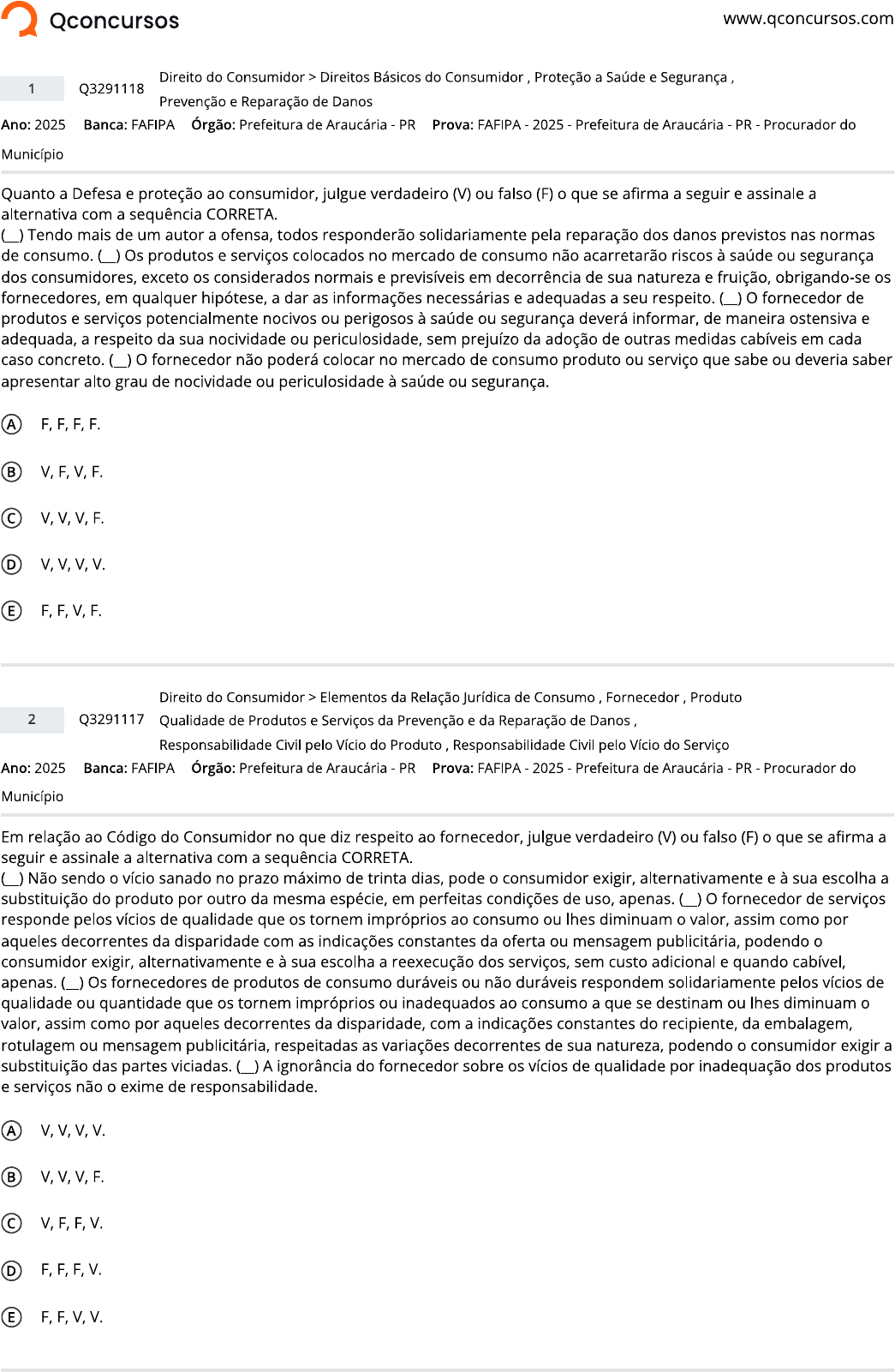 Qconcursos Direito do Consumidor > Direitos Básicos do Consumidor Proteção a Saúde e Segurança, 1 Q3291118 Prevenção e Reparação de Danos Ano: 2025 Banca: FAFIPA Órgão: Prefeitura de Araucária - PR Prova: FAFIPA 2025 Prefeitura de Araucária PR Procurador do Município Quanto a Defesa e proteção ao consumidor, julgue verdadeiro (V) ou falso (F) o que se afirma a seguir e assinale a alternativa com a sequência CORRETA. Tendo mais de um autor a ofensa, todos responderão solidariamente pela reparação dos danos previstos nas normas de consumo. Os produtos e serviços colocados no mercado de consumo não acarretarão riscos à saúde ou segurança dos consumidores, exceto os considerados normais e previsíveis em decorrência de sua natureza e fruição, obrigando-se os fornecedores, em qualquer hipótese, a dar as informações necessárias e adequadas a seu respeito. (__) fornecedor de produtos e serviços potencialmente nocivos ou perigosos à saúde ou segurança deverá informar, de maneira ostensiva e adequada, a respeito da sua nocividade ou periculosidade, sem prejuízo da adoção de outras medidas cabíveis em cada caso concreto. (__) fornecedor não poderá colocar no mercado de consumo produto ou serviço que sabe ou deveria saber apresentar alto grau de nocividade ou periculosidade à saúde ou segurança. A F, F, F, F. B V, F, V, F. C V, V, V, F. D V, V, V, V. E F, F, V, F. Direito do Consumidor > Elementos da Relação Jurídica de Fornecedor Produto 2 Q3291117 Qualidade de Produtos e Serviços da Prevenção e da Reparação de Danos Responsabilidade Civil pelo Vício do Produto Responsabilidade Civil pelo Vício do Serviço Ano: 2025 Banca: FAFIPA Órgão: Prefeitura de Araucária PR Prova: FAFIPA 2025 Prefeitura de Araucária PR Procurador do Município Em relação ao Código do Consumidor no que diz respeito ao fornecedor, julgue verdadeiro (V) ou falso (F) o que se afirma a seguir e assinale a alternativa com a sequência Não sendo o vício sanado no prazo máximo de trinta dias, pode o consumidor exigir, alternativamente e à sua escolha a substituição do produto por outro da mesma espécie, em perfeitas condições de uso, apenas. fornecedor de serviços responde pelos vícios de qualidade que os tornem impróprios ao consumo ou lhes diminuam o valor, assim como por aqueles decorrentes da disparidade com as indicações constantes da oferta ou mensagem publicitária, podendo o consumidor exigir, alternativamente e à sua escolha a reexecução dos serviços, sem custo adicional e quando cabível, apenas. Os fornecedores de produtos de consumo duráveis ou não duráveis respondem solidariamente pelos vícios de qualidade ou quantidade que os tornem impróprios ou inadequados ao consumo a que se destinam ou lhes diminuam o valor, assim como por aqueles decorrentes da disparidade, com a indicações constantes do recipiente, da embalagem, rotulagem ou mensagem publicitária, respeitadas as variações decorrentes de sua natureza, podendo o consumidor exigir a substituição das partes viciadas. (__) A ignorância do fornecedor sobre os vícios de qualidade por inadequação dos produtos e serviços não o exime de responsabilidade. A V, V, V, V. B V, V, V, F. C V, F, F, V. D F, F, F, V. E F, F, V, V.Direito do Consumidor > Práticas Comerciais Proteção Contratual do Consumidor 3 Q3260385 Bancos de Dados e Cadastros de Consumidores Ano: 2025 Banca: MPE-SP Órgão: MPE-SP Prova: MPE-SP 2025 MPE-SP Promotor de Justiça Uma pessoa (A) teve sua Carteira Nacional de Habilitação (CNH) furtada por um terceiro (B). Posteriormente, A descobriu que seu nome havia sido negativado devido a um empréstimo realizado por B junto a uma instituição bancária para a aquisição de veículo. Diante da inadimplência e da comprovação da fraude evidenciada pela divergência entre a foto e a assinatura da CNH apresentada e as originais o consumidor (A) tem direito de exigir a retirada de seu nome do cadastro de inadimplentes, a declaração de nulidade do contrato e a A reparação pelos danos experimentados. As instituições bancárias respondem objetivamente pelos prejuízos decorrentes de fortuito interno (fraude praticada por terceiros). não pode pleitear indenização da instituição financeira, salvo se comprovar que o banco foi negligente na verificação B da autenticidade do documento apresentado pelo contratante. não pode responsabilizar a instituição financeira, pois a cobrança indevida e a fraude bancária foram ocasionadas por terceiros. pode requerer a exclusão de seu nome do cadastro de inadimplentes, mas não tem direito à indenização pelos danos D sofridos, uma vez que a instituição financeira agiu dentro da legalidade. não tem direito à indenização da instituição financeira, pois esta agiu no exercício regular de seu direito ao buscar a E satisfação de uma obrigação inadimplida. Direito do Consumidor > Práticas Comerciais Bancos de Dados e Cadastros de Consumidores 4 Q3260384 Lei 12.414 de 2011 Lei do Cadastro Positivo dos Bons Pagadores Ano: 2025 Banca: MPE-SP Órgão: MPE-SP Prova: MPE-SP 2025 MPE-SP Promotor de Justiça Sobre a criação e manutenção de bancos de dados destinados a registrar o cumprimento de obrigações financeiras por pessoas físicas ou jurídicas, com o objetivo de compor um histórico de crédito (cadastro positivo), assinale a alternativa correta. A A inclusão de dados no banco de informações requer o consentimento expresso do cadastrado. A formação do banco de dados deve ser acompanhada de documentação que comprove o histórico de pagamentos B adimplidos nos últimos cinco anos, fornecida pelo próprio cadastrado. gestor do banco de dados pode compartilhar as informações cadastrais e de adimplemento armazenadas com C outras instituições que possuam a mesma finalidade, desde que haja consentimento expresso do cadastrado. cadastrado tem o direito de acessar, gratuitamente, as informaç