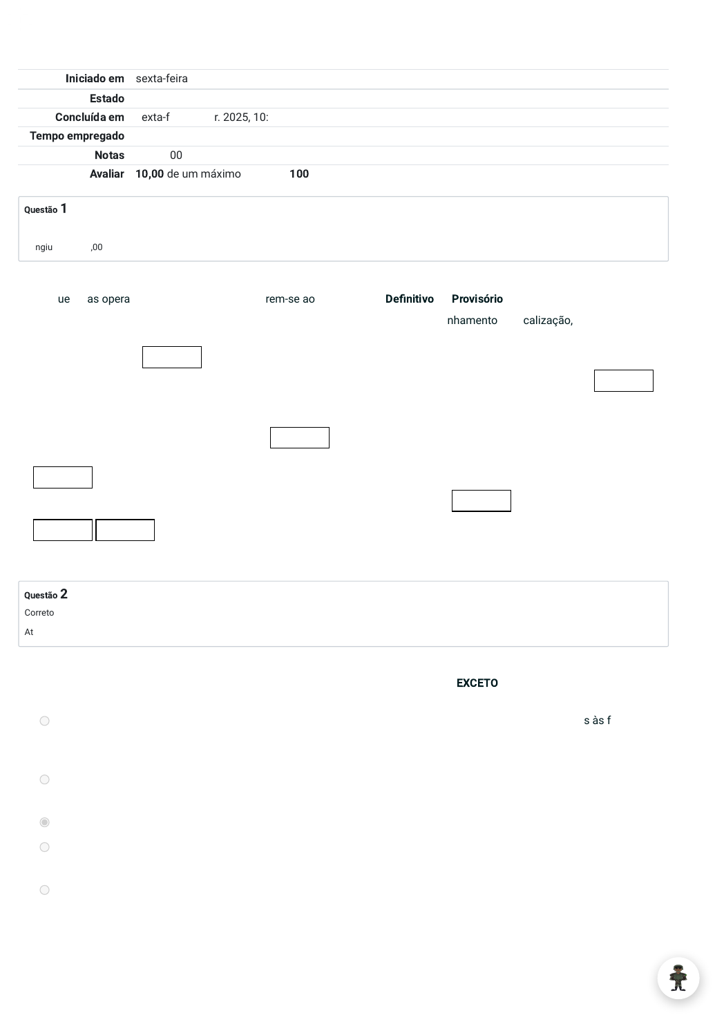 Iniciado em sexta-feira, 4 abr. 2025, 10:05 Estado Finalizada Concluída em sexta-feira, 4 abr. 2025, 10:26 Tempo empregado 20 minutos 42 segundos Notas 4,00/4,00 Avaliar 10,00 de um máximo de 10,00(100%) Questão 1 Correto Atingiu 1,00 de 1,00 Questão 2 Correto Atingiu 1,00 de 1,00 Indique se as operações realizadas abaixo referem-se ao Recebimento Definitivo ou Provisório: a) No caso de obras e serviços, o recebimento pelo responsável por seu acompanhamento e fiscalização, de acordo com legislação específica, mediante termo circunstanciado, assinado pelas partes em até 15 (quinze) dias da comunicação escrita do contratado Provisório ✓ b) Conferência realizada pelo Gestor de Contratos ou Fiscal Administrativo, liberando o processo para liquidação Definitivo ✓ c) No caso de materiais e locação de equipamentos, o recebimento é realizado para efeito de posterior verificação da conformidade do material com a especificação Provisório ✓ d) Conferência realizada pelo Fiscal de Contratos ou pelo Almoxarife, no caso de não existir Fiscal de Contatos designado Provisório ✓ e) Conferência realizada por uma CREM, conforme preconizado pelo art. 58 do RAE Definitivo ✓ Definitivo Provisório Acerca da distribuição do material para as unidades consumidoras, é correto afirmar, EXCETO: a. Os setores de material (almoxarifados) e depósitos da OM farão entregas dos suprimentos necessários às frações e dependências internas, mediante ordem de distribuição publicada em boletim administrativo da OM ou, em casos excepcionais, ordem verbal do comandante. b. No âmbito da OM, a distribuição de material para emprego e uso individual é feita pelas SU, sob a responsabilidade dos encarregados de material e a fiscalização dos seus respectivos comandantes. c. A ordem para distribuição deve recair sempre nos itens mais novos em estoque. ✓ d. Em caso de ordem verbal, o responsável pelo recebimento do material emitirá, a critério do OD, o pedido, devendo a ordem de distribuição ser confirmada em boletim administrativo da OM. e. No caso de indisponibilidade do sistema corporativo de controle patrimonial em uso no Comando do Exército, a distribuição de material poderá ser realizada mediante pedido provisório, devendo tal ato ser registrado em até 8 (oito) dias úteis, após cessarem os motivos do impedimento de lançamento no sistema. 04/04/2025, 10:28 Teste de Conhecimento Essencial: Revisão da tentativa | EBAula https://avaebaula.eb.mil.br/mod/quiz/review.php?attempt=3784655&cmid=447255 1/2 Questão 3 Correto Atingiu 1,00 de 1,00 Questão 4 Correto Atingiu 1,00 de 1,00 Sobre os conceitos básicos relacionados ao patrimônio, assinale a alternativa que apresenta definição de Ativo de uma entidade. a. São itens do patrimônio que possuem a capacidade de gerar benefícios econômicos futuros para entidade. b. Um recurso controlado no passado pela entidade como resultado de evento futuro. c. Compreende as origens de recursos representados pelas obrigações para com terceiros. d. São os bens e direitos de uma entidade que podem ser convertidos em meios monetários. ✓ Sobre o SIAFI, quanto ao controle patrimonial, pode-se afirmar que: a. Ao realizar a conciliação entre o SIAFI e o SISCOFIS, o agente responsável deve verificar se os números de patrimônio e ficha estão de acordo com os lançados no SIAFI. b. Os lançamentos realizados no SIAFI são incorporados ao sistema pelo seu valor total, sem discriminar a quantidade ou o número de tombamento dos bens movimentados. ✓ c. No SIAFI não é possível identificar os atos que causaram modificação na estrutura patrimonial, isto é, todos os lançamentos de entrada, saída e transferência de material. d. Todo material em estoque deve estar registrado no sistema, com algumas exceções. 04/04/2025, 10:28 Teste de Conhecimento Essencial: Revisão da tentativa | EBAula https://avaebaula.eb.mil.br/mod/quiz/review.php?attempt=3784655&cmid=447255 2/2