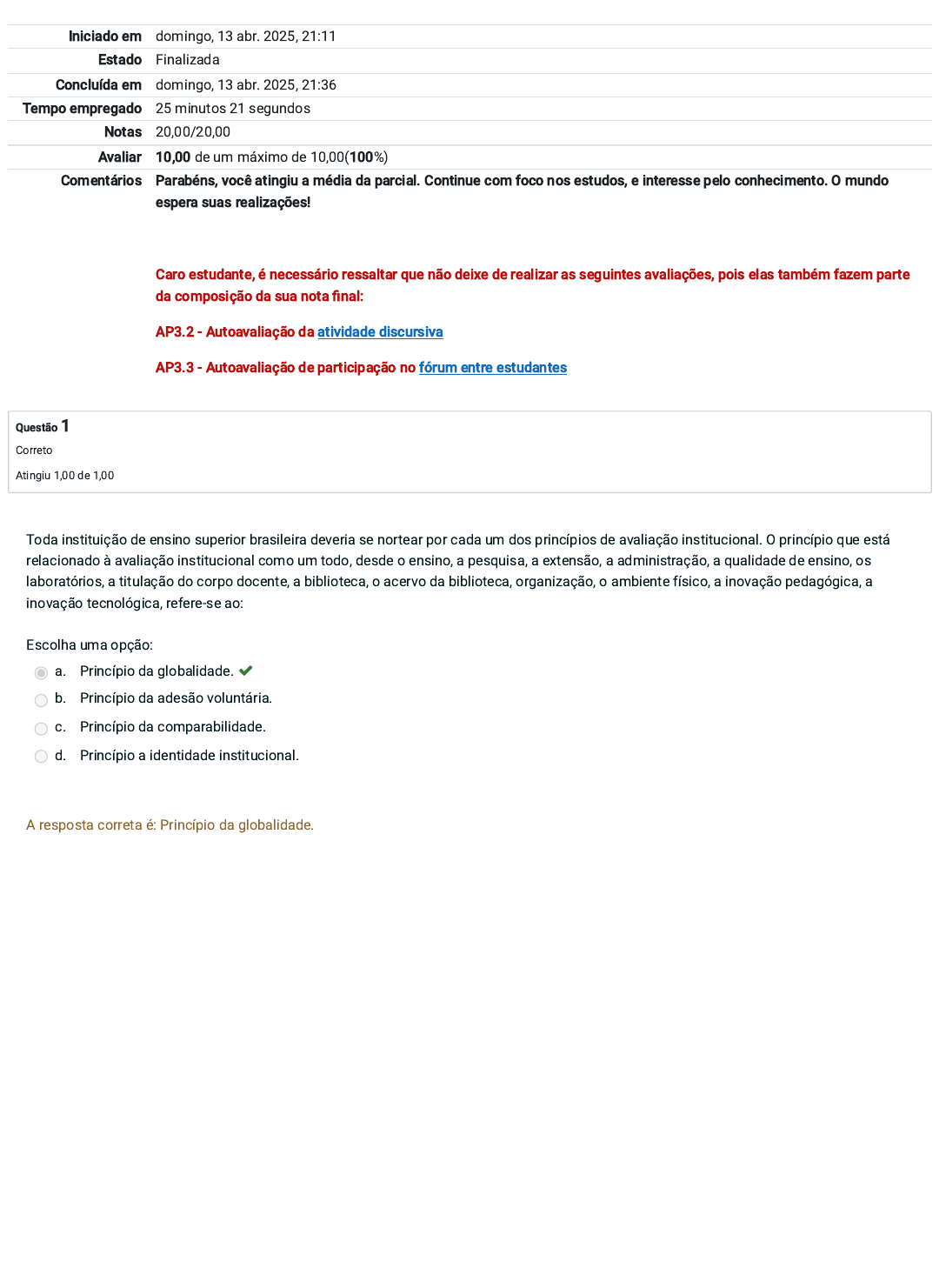 Iniciado em domingo, 13 abr. 2025, 21:11 Estado Finalizada Concluída em domingo, 13 abr. 2025, 21:36 Tempo empregado 25 minutos 21 segundos Notas 20,00/20,00 Avaliar 10,00 de um máximo de 10,00(100%) Comentários Parabéns, você atingiu a média da parcial. Continue com foco nos estudos, e interesse pelo conhecimento. O mundo espera suas realizações! Caro estudante, é necessário ressaltar que não deixe de realizar as seguintes avaliações, pois elas também fazem parte da composição da sua nota final: AP3.2 - Autoavaliação da atividade discursiva AP3.3 - Autoavaliação de participação no fórum entre estudantes Questão 1 Correto Atingiu 1,00 de 1,00 Toda instituição de ensino superior brasileira deveria se nortear por cada um dos princípios de avaliação institucional. O princípio que está relacionado à avaliação institucional como um todo, desde o ensino, a pesquisa, a extensão, a administração, a qualidade de ensino, os laboratórios, a titulação do corpo docente, a biblioteca, o acervo da biblioteca, organização, o ambiente físico, a inovação pedagógica, a inovação tecnológica, refere-se ao: Escolha uma opção: a. Princípio da globalidade. b. Princípio da adesão voluntária. c. Princípio da comparabilidade. d. Princípio a identidade institucional. A resposta correta é: Princípio da globalidade. https://virtual.uninta.edu.br/mod/assign/view.php?id=1082554 https://virtual.uninta.edu.br/mod/forum/view.php?id=1082556 Questão 2 Correto Atingiu 1,00 de 1,00 Questão 3 Correto Atingiu 1,00 de 1,00 A grandiosidade do sistema da educação brasileira e a pretensão do MEC de controlar tudo fizeram a Lei do SINAES ser reduzida à simples determinação de índices ENADE, IDD, CPC e IGC, e acabou por gerar grandes distorções. Qual a função do CPC? Escolha uma opção: a. Tem a função de avaliar todo o corpo docente e a infraestrutura de uma instituição de ensino. b. É um exame com a função de avaliar o desempenho dos estudantes com relação aos conteúdos previstos nas diretrizes curriculares, cuja função é medir as competências e habilidades acumuladas com o curso. Para seu cálculo compara-se o desempenho médio dos estudantes do curso no ENADE com o desempenho médio de todos os estudantes brasileiros do mesmo curso e na mesma condição socioeconômica. c. É um indicador composto pelo conceito ENADE, pelo IDD e por outros insumos, como titulação e regime de dedicação do corpo docente. Informações estas extraídas do Censo da Educação Superior do MEC e pela concepção dos estudantes com relação a infraestrutura e à organização didático-pedagógica, avaliada previamente, por intermédio do questionário socioeconômico que antecede o ENADE. d. Tem a função de avaliar a qualidade da instituição com base nos cálculos da média ponderada dos CPC de todos os cursos de graduação e das avaliações da CAPES. A resposta correta é: É um indicador composto pelo conceito ENADE, pelo IDD e por outros insumos, como titulação e regime de dedicação do corpo docente. Informações estas extraídas do Censo da Educação Superior do MEC e pela concepção dos estudantes com relação a infraestrutura e à organização didático-pedagógica, avaliada previamente, por intermédio do questionário socioeconômico que antecede o ENADE. Como possibilidades são elencados alguns aspectos norteadores para uma pauta de discussão sobre a avaliação da aprendizagem na educação superior, que podem contribuir para a mobilização do debate, fornecendo elementos aos professores universitários para discutir e criar alternativas a partir do seu próprio contexto, visto que a alteração das práticas avaliativas não se dá de exógena, mas, a partir dos interesses e necessidades de seus protagonistas, de forma endógena. No que diz respeito aos aspectos sobre a avaliação da aprendizagem: I) Valorizar os processos não só para os resultados; definir as regras avaliativas desde o início do processo. II) Dar possibilidades aos alunos de se expressarem e de se avaliarem; agir, com base nas informações obtidas via avaliação, em favor da superação das dificuldades detectadas. III) Utilizar procedimentos e instrumentos variados para avaliar a aprendizagem; configurar a avaliação a serviço da aprendizagem, como ameaça aos avaliados e não como estímulo. IV) Contextualizar e integrar a avaliação ao processo ensino aprendizagem; deixar de respeitar as diferenças e as dificuldades manifestadas em sala de aula. Analisando as afirmativas são corretos os itens: Escolha uma opção: a. Somente as alternativas I e IV estão corretas. b. Somente as alternativas I, e II estão corretas. c. As alternativas I, II, III e IV estão corretas. d. Somente as alternativas II e III estão corretas. A resposta correta é: Somente as alternativas I, e II estão corretas. Questão 4 Correto Atingiu 1,00 de 1,00 Questão 5 Correto Atingiu 1,00 de 1,00 Nas últimas décadas, ocorreram mudanças socioeconômicas e culturais, especialmente no que se refere ao desenvolvimento de tecnologias da informação, levando a busca constante de conhecimentos, que acabou por impulsionar a educação superior. No que diz respeito à Educação Superior é correto afirmar que: I) É através da educação que a sociedade pode resgatar sua formação, assim contribuir para o desenvolvimento social mais justo. Nessa perspectiva as Instituições de Ensino Superior tem o objetivo de proporcionar conhecimento com a intenção de assegurar o desenvolvimento social. II) A Educação Superior tem muitos desafios para enfrentar, além de fazer parte do desenvolvimento econômico e social da sociedade, porém os caminhos são longos como produzir conhecimentos, participar de pesquisas e na formação de profissionais. III) As Instituições de Ensino Superior tem o objetivo de proporcionar conhecimento com a intenção de visar apenas lucros. IV) A Educação S