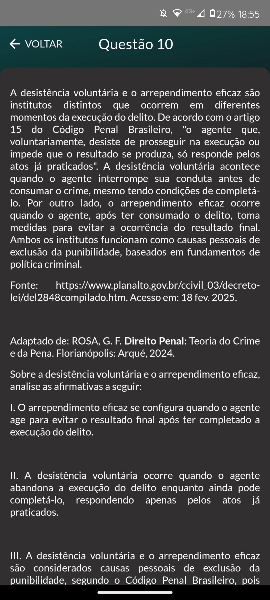 4G+ 27% 18:55 VOLTAR Questão 10 A desistência voluntária e O arrependimento eficaz são institutos distintos que ocorrem em diferentes momentos da execução do delito. De acordo com O artigo 15 do Código Penal Brasileiro, "o agente que, voluntariamente, desiste de prosseguir na execução ou impede que O resultado se produza, só responde pelos atos já praticados". A desistência voluntária acontece quando O agente interrompe sua conduta antes de consumar O crime, mesmo tendo condições de completá- lo. Por outro lado, O arrependimento eficaz ocorre quando O agente, após ter consumado delito, toma medidas para evitar a ocorrência do resultado final. Ambos os institutos funcionam como causas pessoais de exclusão da punibilidade, baseados em fundamentos de política criminal. Fonte: https://www.planalto.gov.br/ccivil_03/decreto- Acesso em: 18 fev. 2025. Adaptado de: ROSA, G. F. Direito Penal: Teoria do Crime e da Pena. Florianópolis: Arqué, 2024. Sobre a desistência voluntária e O arrependimento eficaz, analise as afirmativas a seguir: I. O arrependimento eficaz se configura quando O agente age para evitar O resultado final após ter completado a execução do delito. II. A desistência voluntária ocorre quando O agente abandona a execução do delito enquanto ainda pode completá-lo, respondendo apenas pelos atos já praticados. III. A desistência voluntária e O arrependimento eficaz são considerados causas pessoais de exclusão da punibilidade, segundo O Código Penal Brasileiro, pois