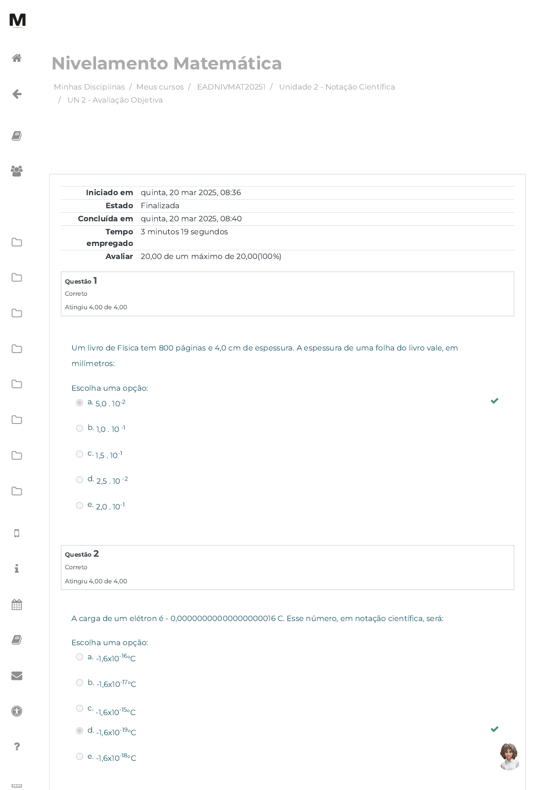 Minhas Disciplinas / Meus cursos / EADNIVMAT20251 / Unidade 2 - Notação Científica / UN 2 - Avaliação Objetiva Nivelamento Matemática Iniciado em quinta, 20 mar 2025, 08:36 Estado Finalizada Concluída em quinta, 20 mar 2025, 08:40 Tempo empregado 3 minutos 19 segundos Avaliar 20,00 de um máximo de 20,00(100%) Questão 1 Correto Atingiu 4,00 de 4,00 Questão 2 Correto Atingiu 4,00 de 4,00 Um livro de Física tem 800 páginas e 4,0 cm de espessura. A espessura de uma folha do livro vale, em milímetros: Escolha uma opção: a. 5,0 . 10 b. 1,0 . 10 c. 1,5 . 10 d. 2,5 . 10 e. 2,0 . 10 -2 -1 -1 -2 -1 A carga de um elétron é - 0,00000000000000000016 C. Esse número, em notação científica, será: Escolha uma opção: a. -1,6x10 °C b. -1,6x10 °C c. -1,6x10 °C d. -1,6x10 °C e. -1,6x10 °C -16 -17 -15 -19 -18 https://avap.multivix.edu.br/my/ https://avap.multivix.edu.br/course/view.php?id=30862 https://avap.multivix.edu.br/course/view.php?id=30862§ion=3 https://avap.multivix.edu.br/mod/quiz/view.php?id=1766015 https://avap.multivix.edu.br/my/ https://avap.multivix.edu.br/course/view.php?id=30862 https://avap.multivix.edu.br/user/index.php?id=30862 https://avap.multivix.edu.br/course/view.php?id=30862§ion=1 https://avap.multivix.edu.br/course/view.php?id=30862§ion=2 https://avap.multivix.edu.br/course/view.php?id=30862§ion=3 https://avap.multivix.edu.br/course/view.php?id=30862§ion=4 https://avap.multivix.edu.br/course/view.php?id=30862§ion=5 https://avap.multivix.edu.br/course/view.php?id=30862§ion=6 https://avap.multivix.edu.br/course/view.php?id=30862§ion=7 https://avap.multivix.edu.br/course/view.php?id=30862§ion=8 https://avap.multivix.edu.br/hooks/portal/ https://avap.multivix.edu.br/mod/page/view.php?id=1252%2F%22%20target%3D%22_blank https://avap.multivix.edu.br/calendar/view.php/ https://avap.multivix.edu.br/local/staticpage/view.php?page=biblioteca https://multivix.edu.br/office-365/ https://multivix.edu.br/acessibilidade/ https://avap.multivix.edu.br/mod/page/view.php?id=7%2F%22%20target%3D%22_blank https://docs.google.com/forms/d/e/1FAIpQLSfyH1O0KRhpI8B0cFqDv3aXT41lziF0mULzRNTBk2x0miNkNA/viewform https://avap.multivix.edu.br/ https://avap.multivix.edu.br/ https://avap.multivix.edu.br/ https://avap.multivix.edu.br/ Questão 3 Correto Atingiu 4,00 de 4,00 Questão 4 Correto Atingiu 4,00 de 4,00 Um adulto humano saudável abriga cerca de 100 bilhões de bactérias, somente em seu trato digestivo. Esse número de bactérias pode ser escrito como Escolha uma opção: a. 10 b. 10 c. 10 d. 10 e. 10 10 8 11 9 7 A nossa galáxia, a Vía Láctea, contém cerca de 400 bilhões de estrelas. Suponha que 0,05% dessas estrelas possuam um sistema planetário onde exista um planeta semelhante à Terra. O número de planetas semelhantes à Terra, na Vía Láctea, é: Escolha uma opção: a. 2,0 . 10 b. 2,0 . 10 c. 2,0. 10 d. 2,0 . 10 e. 2,0 . 10 8 11 12 4 6 https://avap.multivix.edu.br/my/ https://avap.multivix.edu.br/course/view.php?id=30862 https://avap.multivix.edu.br/user/index.php?id=30862 https://avap.multivix.edu.br/course/view.php?id=30862§ion=1 https://avap.multivix.edu.br/course/view.php?id=30862§ion=2 https://avap.multivix.edu.br/course/view.php?id=30862§ion=3 https://avap.multivix.edu.br/course/view.php?id=30862§ion=4 https://avap.multivix.edu.br/course/view.php?id=30862§ion=5 https://avap.multivix.edu.br/course/view.php?id=30862§ion=6 https://avap.multivix.edu.br/course/view.php?id=30862§ion=7 https://avap.multivix.edu.br/course/view.php?id=30862§ion=8 https://avap.multivix.edu.br/hooks/portal/ https://avap.multivix.edu.br/mod/page/view.php?id=1252%2F%22%20target%3D%22_blank https://avap.multivix.edu.br/calendar/view.php/ https://avap.multivix.edu.br/local/staticpage/view.php?page=biblioteca https://multivix.edu.br/office-365/ https://multivix.edu.br/acessibilidade/ https://avap.multivix.edu.br/mod/page/view.php?id=7%2F%22%20target%3D%22_blank https://docs.google.com/forms/d/e/1FAIpQLSfyH1O0KRhpI8B0cFqDv3aXT41lziF0mULzRNTBk2x0miNkNA/viewform https://avap.multivix.edu.br/ https://avap.multivix.edu.br/ https://avap.multivix.edu.br/ https://avap.multivix.edu.br/ Questão 5 Correto Atingiu 4,00 de 4,00 Se x = 3200000 e y = 0,00002, então xy vale: Escolha uma opção: a. 640 b. 64 c. 0,64 d. 6,4 e. 6400 ◄ Unidade 2 - Vídeo 01 Seguir para... Unidade 3 - Vídeo 01 ► https://avap.multivix.edu.br/mod/page/view.php?id=1766014&forceview=1 https://avap.multivix.edu.br/mod/page/view.php?id=1766016&forceview=1 https://avap.multivix.edu.br/my/ https://avap.multivix.edu.br/course/view.php?id=30862 https://avap.multivix.edu.br/user/index.php?id=30862 https://avap.multivix.edu.br/course/view.php?id=30862§ion=1 https://avap.multivix.edu.br/course/view.php?id=30862§ion=2 https://avap.multivix.edu.br/course/view.php?id=30862§ion=3 https://avap.multivix.edu.br/course/view.php?id=30862§ion=4 https://avap.multivix.edu.br/course/view.php?id=30862§ion=5 https://avap.multivix.edu.br/course/view.php?id=30862§ion=6 https://avap.multivix.edu.br/course/view.php?id=30862§ion=7 https://avap.multivix.edu.br/course/view.php?id=30862§ion=8 https://avap.multivix.edu.br/hooks/portal/ https://avap.multivix.edu.br/mod/page/view.php?id=1252%2F%22%20target%3D%22_blank https://avap.multivix.edu.br/calendar/view.php/ https://avap.multivix.edu.br/local/staticpage/view.php?page=biblioteca https://multivix.edu.br/office-365/ https://multivix.edu.br/acessibilidade/ https://avap.multivix.edu.br/mod/page/view.php?id=7%2F%22%20target%3D%22_blank https://docs.google.com/forms/d/e/1FAIpQLSfyH1O0KRhpI8B0cFqDv3aXT41lziF0mULzRNTBk2x0miNkNA/viewform https://avap.multivix.edu.br/ https://avap.multivix.edu.br/ https://avap.multivix.edu.br/ https://avap.multivix.edu.br/