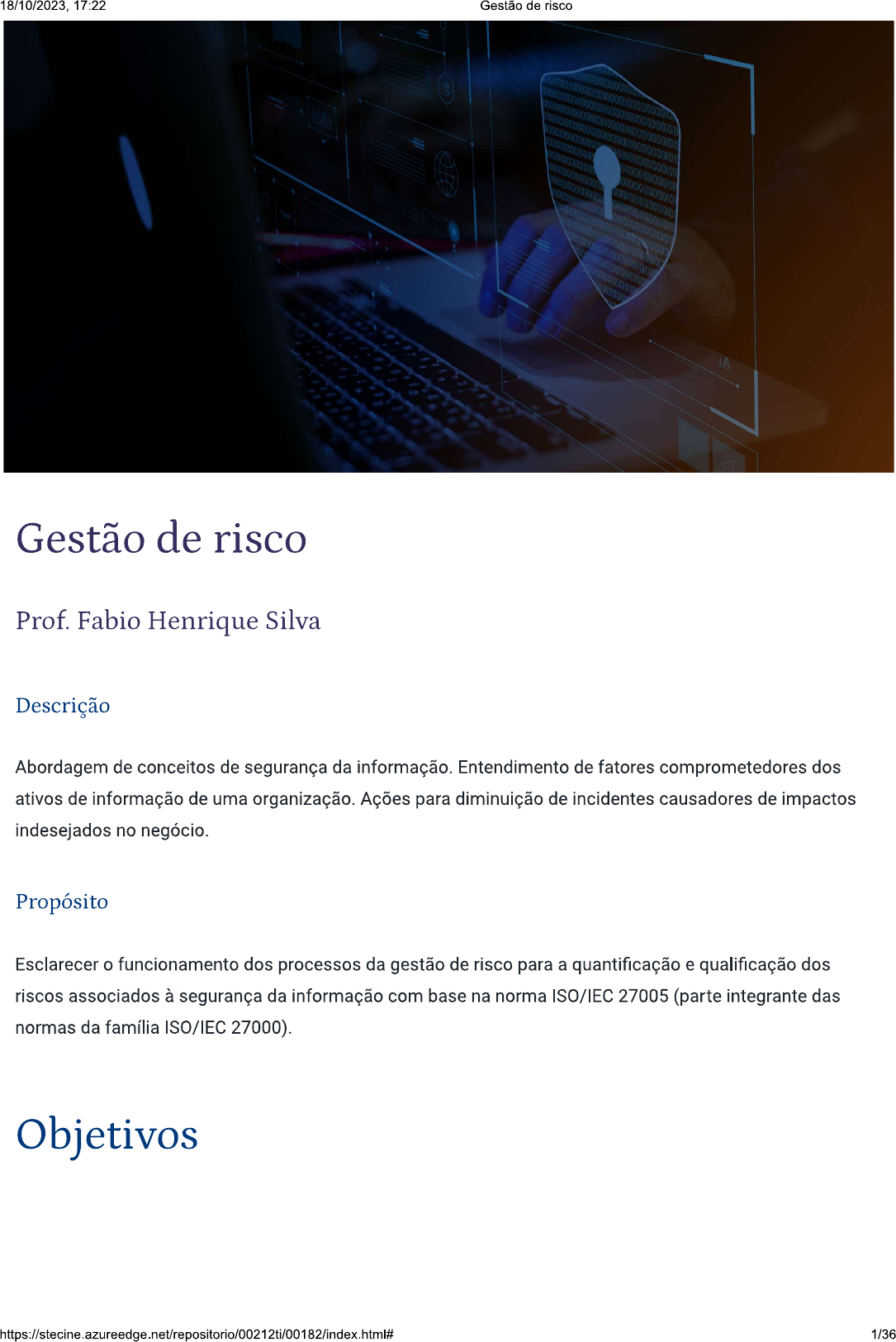 18/10/2023, 17:22 Gestão de risco Gestão de risco Prof. Fabio Henrique Silva Descrição Abordagem de conceitos de segurança da informação. Entendimento de fatores comprometedores dos ativos de informação de uma organização. Ações para diminuição de incidentes causadores de impactos indesejados no negócio. Propósito Esclarecer o funcionamento dos processos da gestão de risco para a quantificação e qualificação dos riscos associados à segurança da informação com base na norma ISO/IEC 27005 (parte integrante das normas da família ISO/IEC 27000). Objetivos 1/3618/10/2023, 17:22 Gestão de risco Módulo 1 Vulnerabilidades, ameaças, ataques Definir vulnerabilidades, ameaças, ataques e termos relacionados à preservação da confidencialidade, integridade e disponibilidade (CID). Módulo 2 Processos da gestão de riscos Identificar as etapas da gestão de riscos (GR) de segurança da informação. Introdução Você já ouviu falar em segurança da informação? Atualmente, há cada vez mais informações valiosas disponíveis no computador e na internet. Por isso, a cada dia que passa, surgem novas e mais elaboradas formas de ameaça à segurança da informação - e elas estão mais perto de nós do que imaginamos. Alguns elementos associados à segurança da informação são: vulnerabilidades (pontos fracos), ameaças (como vírus e cavalos de Troia), riscos (a chance de um ataque ocorrer e um dano ser causado). Compreender esses elementos é fundamental para que qualquer usuário aprenda a se proteger. Obter tal conhecimento se revela ainda mais importante para os estudantes de computação. Assim sendo, percebemos a importância do estudo sobre os elementos associados à segurança da informação para os envolvidos em gestão de dados e áreas afins https://stecine.azureedge.net/repositorio/00212ti/00182/index.html# 2/3618/10/2023, 17:22 Gestão de risco Para assistir a um vídeo sobre assunto, acesse a versão online deste conteúdo. -0- 1 - Vulnerabilidades, ameaças, ataques Ao final deste módulo, você será capaz de definir vulnerabilidades, ameaças, ataques e termos relacionados à preservação da confidencialidade, integridade e disponibilidade (CID). Segurança da informação Pilares https://stecine.azureedge.net/repositorio/00212ti/00182/index.html# 3/3618/10/2023, 17:22 Gestão de risco Para identificarmos a quais riscos um ativo de informação pode estar submetido, precisaremos, antes disso, estudar alguns termos e conceitos relacionados à preservação dos seguintes pilares da segurança da informação: Confidencialidade Disponibilidade CID Integridade No CID, minimiza-se o risco da ocorrência de incidentes que: Disponibilizem uma informação para pessoas, entidades ou processos não autorizados (confidencialidade). Afetem a exatidão e a integralidade de ativos (integridade). + Tornem os recursos inacessíveis e inutilizáveis sob demanda (disponibilidade). Esmiuçaremos a seguir todos os elementos a seguir: Medidas de proteção (controle) Ameaças? Risco? Impacto à Vulnerabilidades organização https://stecine.azureedge.net/repositorio/00212ti/00182/index.html# 4/3618/10/2023, 17:22 Gestão de risco Ativos Toda empresa possui seus ativos, ou seja, algo que possui valor para a organização. Exibiremos a seguir alguns de seus exemplos: 1. Ativos de informação: Base de dados, arquivos, contratos e acordos. 2. Ativos de software: Aplicativos e sistemas. 3. Ativos físicos: Equipamentos computacionais e de comunicação. 4. Serviços: Eletricidade e refrigeração. 5. Pessoas: Suas qualificações, habilidades e experiências. 6. Intangíveis: Aqueles que não podemos tocar, como a reputação e a imagem da organização. Ameaças Em seu item 3.74, a norma ISO/IEC 27000:2018 define ameaça como "a causa potencial de um incidente indesejado que pode resultar em dano para um sistema ou organização por meio da quebra de segurança". Nenhuma organização deseja que qualquer tipo de ativo sofra algum dano ou furto. No entanto, justamente pelo fato de possuírem uma percepção de valor, os ativos estão sujeitos a ameaças de várias naturezas. Elas podem ser: 5/3618/10/2023, 17:22 Gestão de risco Físicas Falhas de equipamentos e instalações, como relâmpagos, terremotos, ataques a bombas, deterioração dos meios de armazenamento, fraude, roubo, invasão etc. VIRUS DETECTED Lógicas Vulnerabilidades em softwares, como bugs, vírus, malwares etc. Note que o contrário de ameaça é oportunidade, cujo significado é: "Ocasião favorável; circunstância oportuna e propícia para a realização de alguma coisa; ensejo" (MICHAELIS, 2020, n. p.). Podemos então reescrever o conceito de oportunidade como a causa potencial de um incidente desejado que pode resultar em ganho para um sistema ou uma organização. Medidas de proteção (controle) Certas ameaças rondam os ativos a todo instante. Como uma organização deseja mantê-los a salvo, deve adotar medidas de proteção (controle) para esconder ou diminuir o acesso ou a exposição às vulnerabilidades deles. Segundo o item 3.14 da norma ISO/IEC 27000:2018, controle é uma medida que pode modificar o risco por meio de processo, política, dispositivo, prática ou outras ações que modifiquem a ameaça e/ou a vulnerabilidade e, consequentemente, o risco. 6/3618/10/2023, 17:22 Gestão de risco Vulnerabilidades A vulnerabilidade "é uma fragilidade de um ativo ou grupo de ativos que pode ser explorada por uma ou mais ameaças e, por consequência, comprometer a segurança de sistemas ou informações". A identificação dela em um ativo, porém, não é um processo trivial. Desse modo, deve-se inicialmente realizar uma análise de vulnerabilidades, que é o processo de levantar falhas ou ausências em um conjunto de proteções adotadas. Em seguida, a avaliação de vulnerabilidades é feita com uma lista de ameaças no intuito de avaliar sua probabilidade de ocorrência. A tabela a segu