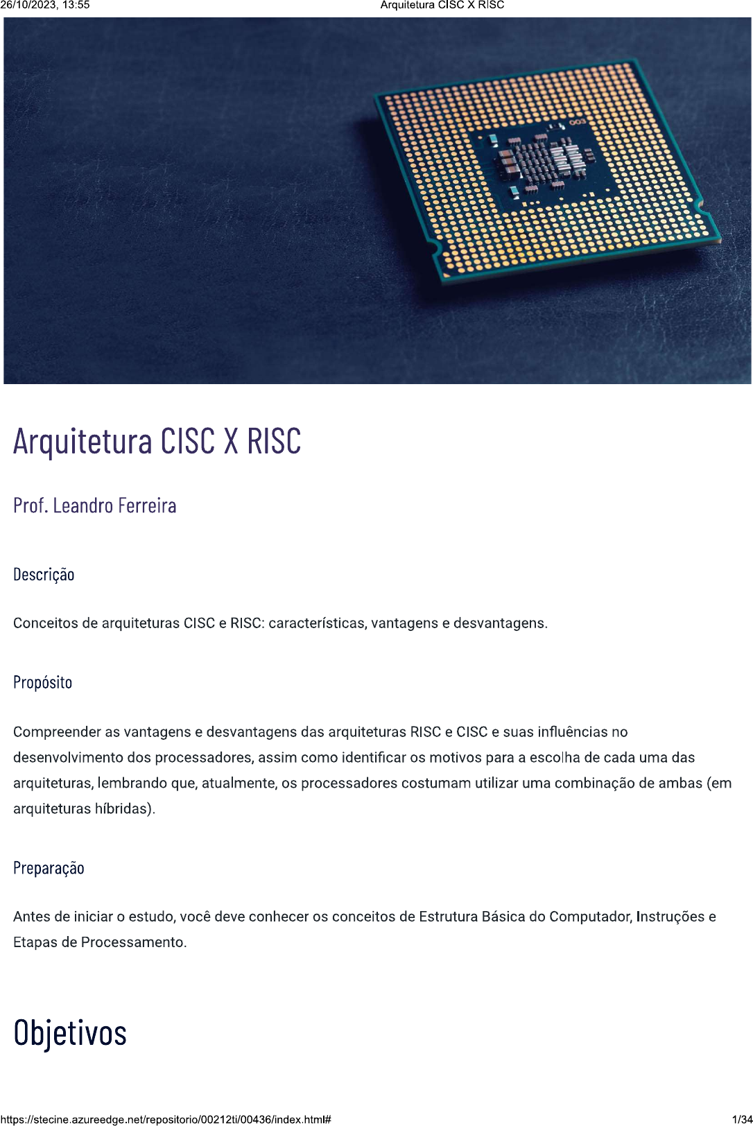 26/10/2023, 13:55 Arquitetura X RISC Arquitetura CISC X RISC Prof. Leandro Ferreira Descrição Conceitos de arquiteturas CISC e RISC: características, vantagens e desvantagens. Propósito Compreender as vantagens e desvantagens das arquiteturas RISC e CISC e suas influências no desenvolvimento dos processadores, assim como identificar os motivos para a escolha de cada uma das arquiteturas, lembrando que, atualmente, os processadores costumam utilizar uma combinação de ambas (em arquiteturas híbridas). Preparação Antes de iniciar o estudo, você deve conhecer os conceitos de Estrutura Básica do Computador, Instruções e Etapas de Processamento. Objetivos 1/3426/10/2023, 13:55 Arquitetura CISC X RISC Módulo 1 Características da arquitetura CISC Identificar características e propriedades da arquitetura CISC. Módulo 2 Características da arquitetura RISC Identificar características e propriedades da arquitetura RISC. Introdução Os termos RISC e CISC podem ser compreendidas como tipos de conjuntos de instruções de máquinas que fazem parte da arquitetura de computadores desenvolvidas pela indústria de computação. Conhecer o tipo de arquitetura RISC e CISC é importante, pois é esse conjunto de instruções que dará a ordem para que o computador execute determinada operação. Assim, o projeto de um processador é centrado no conjunto de instruções de máquina elabodado para que ele execute, ou seja, do conjunto de operações primitivas que ele pode executar. Cada arquitetura tem sua forma de ser implementada, suas vantagens e desvantagens que acabam norteando a escolha de uma ou de outra, ou de ambas, a chamada arquitetura híbrida. Aqui você compreenderá bem o que são as arquiteturas CISC, RISC e híbrida, bem como suas características e principais diferenças. Bons estudos! 2/3426/10/2023, 13:55 Arquitetura CISC X RISC Para assistir a um vídeo sobre o assunto, acesse a versão online deste conteúdo. -0- 1 - Características da arquitetura CISC Ao final deste módulo, você será capaz de identificar características e propriedades da arquitetura CISC. Vamos começar! Revisões sobre 0 funcionamento do computador 3/3426/10/2023, 13:55 Arquitetura CISC X RISC Veja alguns conceitos importantes para o funcionamento do computador. Para assistir a um vídeo sobre assunto, acesse a versão online deste conteúdo. -0- Arquitetura CISC 0 conceito da arquitetura Abordagem CISC na arquitetura de processadores Para assistir a um vídeo sobre assunto, acesse a versão online deste conteúdo. -0- A abordagem CISC (Complex Instruction Set Computer - Computador com Conjunto Complexo de Instruções) está relacionada às possibilidades na hora de se projetar a arquitetura de um processador, com instruções específicas para o maior número de funcionalidades possível. Além disso, essas instruções realizam operações com diferentes níveis de complexidade, buscando, muitas vezes, operandos na memória principal e retornando a ela os resultados. Isso faz com que a quantidade de instruções seja extensa e que a Unidade de Controle do processador seja bastante complexa para decodificar a instrução a ser executada. Entretanto, a complexidade é compensada por poucos acessos à memória e soluções adequadas para problemas específicos. Veja um esquema que ilustra a arquitetura CISC: https://stecine.azureedge.net/repositorio/00212ti/00436/index.html# 4/3426/10/2023, 13:55 Arquitetura CISC X RISC Unidade de Controle Memória de dados Memória de programa Registradores Unidade de entrada e saída Esquema ilustrativo da arquitetura CISC. Origem A abordagem CISC surgiu de uma evolução dos processadores. Essa sigla só começou a ser usada após a criação do conceito de RISC no início da década de 1980 (a ser visto no próximo módulo), quando os processadores anteriores passaram a ser chamados de CISC de forma retroativa. Conforme a tecnologia de fabricação e a capacidade computacional evoluíam, problemas mais complexos puderam ser resolvidos pelos processadores. Para esses problemas, foram sendo criadas novas instruções específicas. Exemplo É possível adicionar uma instrução específica para multiplicar números reais em vez de realizar repetidas somas (instrução mais simples). Características Veja na tabela exemplos de processadores CISC, sua evolução no que diz respeito à quantidade e ao tamanho das instruções. Tamanho da Quantidade de Tam Processador Ano instrução instruções regis IBM 370 1970 2 a 6 bytes 208 VAX11 1978 2 a 57 bytes 303 32 bi Intel 8008 1972 1 a 3 bytes 49 8 bits https://stecine.azureedge.net/repositorio/00212ti/00436/index.html# 5/3426/10/2023, 13:55 Arquitetura CISC X RISC Tamanho da Quantidade de Tam Processador Ano instrução instruções regis Intel 286 1982 2 a 5 bytes 175 Intel 386 1985 2 a 16 bytes 312 32 bi Tabela: Exemplos de processadores CISC. Leandro Ferreira. Múltiplo endereçamento Observando a última coluna da tabela anterior, é possível o conceito principal e uma das definições mais usuais de arquitetura com abordagem CISC: diversos tipos de endereçamento. Dessa forma, temos: R-R Para instruções que usam registradores como entrada e saída. R-M Quando um dos elementos (operandos ou resultado) deve ser buscado/escrito na memória e ao menos um em registrador. M-M Para instruções em que os operandos e o resultado estão na memória. princípio fundamental da abordagem CISC é a realização de operações complexas, que envolvem buscar operandos na memória principal, operar sobre eles (na ULA) e guardar o resultado já na memória. 6/3426/10/2023, 13:55 Arquitetura CISC X RISC Nesses casos, o código de máquina é mais simples de se gerar pelo compilador, pois, geralmente, há relação direta entre uma linha de código em alto nível e uma instrução da arquitetura, veja: ódigo de máquina A linguagem de máquina é o conjunto de instruções (em binário) que determinado processador consegue e