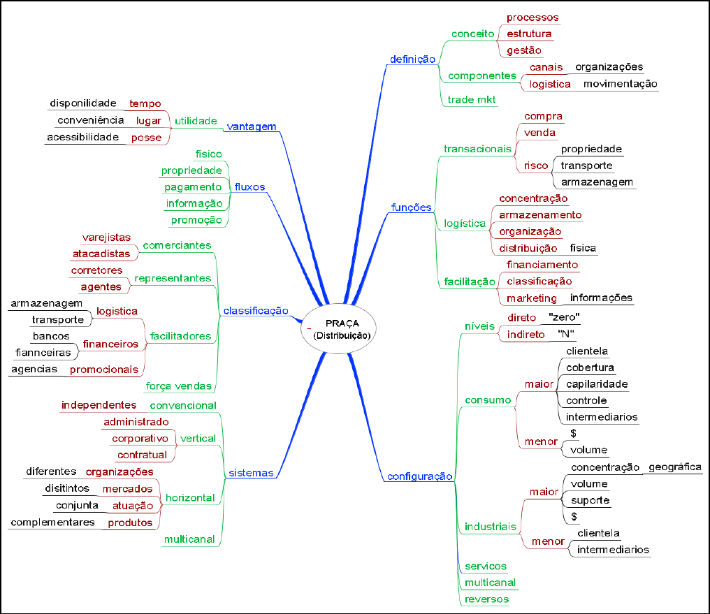 GESTÃO DE MARKETING – Memória 7 (Profa. Paula Busko) PRAÇA (Distribuição) � DEFINIÇÕES Conceito Um canal de marketing ou distribuição é um conjunto de organizações interdependentes envolvidas no processo de oferecimento de um produto (bem, serviço, experiência, etc.) para uso ou consumo por parte de um consumidor final ou usuário organizacional. Essa estrutura é formada por unidade internas de uma firma e agentes e distribuidores externos. (LAS CASAS, 2009; CROCCO et al, 2010) Componentes (LAS CASAS, 2009) Canal de distribuição é o caminho que as mercadorias seguem desde o produtor até o consumidor; é o complexo de empresas que existe para distribuir produtos, desde o fabricante até o consumidor. Logística são as atividades relativas a movimentação eficiente de produtos do final da linha de produção até o consumidor final. Inclui atividades como fretamento, armazenamento, manuseio, controle de estoques, localização de fábrica, processamento de pedidos, etc. Trade marketing é o planejamento e controle das ações de venda, de mercado e dos benefícios oferecidos ao consumidor (marketing), por meio do gerenciamento e controle das relações de vendas e marketing estabelecidas com canal de distribuição (trade). (ALVAREZ, 1999) VANTAGEM a distribuição visa essencialmente maximizar três utilidades (DIAS et al, 2003) Tempo para o consumidor, pois permite atender à sua decisão de compra no momento em que ela se manifesta; para o fabricante, porque quanto maior o giro de estoques, melhor o seu resultado. Lugar para o consumidor, pois o produto precisa estar acessível, e deve ser facilmente adquirido no momento em que ele decide comprá-lo; para o fabricante, pois otimiza o esforço de cobertura. Posse tornar o produto acessível ao cliente, por meio do melhor uso de precificação, descontos e financiamentos, etc. FUNÇÕES os canais de marketing exercem um grande número de funções, muito importantes, que podem ser classificadas em (CROCCO et al, 2010) Transacionais atividades associadas à compra e venda, envolvendo risco na operação, por propriedade, transporte, armazenagem e administração; Logística são atividades de concentração, armazenamento, organização, distribuição física de produtos; Facilitação atividades de estímulo e favorecimento dos processos de compra e venda, da produção ao consumo, como financiamento de transações, classificação de produtos e troca ou fornecimento de informações de mercado. FLUXOS o processo de distribuição pode ser mais bem compreendido ao se reconhecerem os diferentes fluxos presentes e associados a essa operação Físico constituído pelas operações de deslocamento do produto entre os agentes (organizações), incluindo armazenagem, transporte e acondicionamento do produtor aos clientes. Propriedade seqüência encadeada de negócios de compra e venda entre organizações que efetivamente assumem a propriedade do produto e, portanto, o risco decorrente da condição de proprietário, ou seja, o ônus por potenciais extravios, perdas, roubos, encalhes ou deterioração. Pagamento transferências de recursos financeiros (moeda ou crédito) que compensam/remuneram as operações dos agentes, produtores e intermediários, no sentido do cliente/consumidor para o produtor, portanto, em sentido inverso ao fluxo físico ou de produto. Informação é o movimento de trocas de conhecimento, registros, expectativas, dados e compreensão de variáveis, padrões e mudanças do setor, do mercado e do ambiente estabelecido entre intermediários, produtores e clientes. Promoção interação combinada de esforços de reconhecimento do produto e estímulo à venda para clientes/consumidores, desenvolvida por duas ou mais organizações participantes do canal, objetivando ampliação do mercado ou do nível de vendas. CLASSIFICAÇÃO Comerciante intermediário que assume a propriedade pelo produto - assumindo, portanto, o risco associado a essa condição - para posteriormente revendê-Io. Exemplos: atacadistas e varejistas. Atacadista intermediário que vende produtos para revenda (varejistas, por exemplo) ou para usuários empresariais (industriais). Exemplos: Martins e Makro. Varejista intermediário que vende produtos para o consumidor final (indivíduos, casais e famílias) para uso pessoal (não-empresarial). Exemplos: Pão de Açúcar e Carrefour. Representantes intermediários que atuam em nome do comprador ou do vendedor, sem assumir propriedade, riscos ou despesas de armazenagem Corretor intermediário que tem por finalidade aproximar vendedores e compradores; Agente: intermediário que realiza prospecção e negócios em nome de um vendedor ou produtor; Representante de vendas: intermediário que representa e vende produtos de uma ou mais organizações. Força de vendas conjunto de indivíduos contratados e administrados por uma organização para a venda de seus produtos (força de vendas interna). CONFIGURAÇÃO Níveis os canais podem envolver, ou não, intermediários, dependendo de variáveis do negócio. Nível 0 (canal direto ou venda direta) onde o produtor vende diretamente ao consumidor; existe zero intermediário entre produtor e cliente Indiretos onde existe a participação de um ou mais intermediários; seu nível é determinado pelo número de intermediários presentes. Consumo o número de compradores de consumo é maior que o número de compradores de bens vendidos a empresas, instituições e governo. a distribuição desses bens envolve um grau de complexidade superior ao dos bens empresariais, por demandar maior cobertura (abrangência geográfica), maior capilaridade (acesso a PDVs de uma dada região), necessidade de controle mais preciso dos fluxos no canal e, em geral, maior número de intermediários. os canais de marketing de bens de consumo tendem a ser longos. Industriais bens organizacionais (ou empresariais) possuem, em geral, um pequeno número de compradore