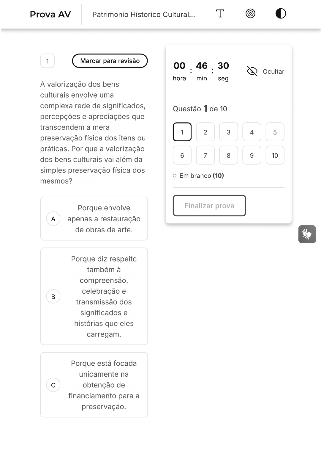 Prova AV Patrimonio Historico Cultural... T 1 Marcar para revisão 00 : 46 : 30 Ocultar hora min seg A valorização dos bens culturais envolve uma complexa rede de significados, Questão 1 de 10 percepções e apreciações que transcendem a mera 1 2 3 4 5 preservação física dos itens ou práticas. Por que a valorização 6 7 8 9 10 dos bens culturais vai além da simples preservação física dos Em branco (10) mesmos? Porque envolve Finalizar prova A apenas a restauração de obras de arte. Porque diz respeito também à compreensão, celebração e B transmissão dos significados e histórias que eles carregam. Porque está focada unicamente na C obtenção de financiamento para a preservação.Porque está relacionada apenas à D popularidade de um bem cultural. Porque envolve E apenas a preservação de bens materiais. 2 Marcar para revisão Em uma pequena cidade do interior, a população local luta pela preservação de uma antiga estação ferroviária, que, apesar de abandonada, representa um marco histórico e cultural importante para os moradores e tem potencial turístico. Considerando o texto, analise as afirmativas abaixo: I. A preservação do patrimônio cultural está atrelada apenas a fatores históricos, não possuindo relevância para a identidade local atual. II. A valorização do patrimônio cultural pode potencializar o turismo e a economia local. III. O conceito de patrimônio cultural está restrito a bens materiais, excluindo práticas e manifestações culturais.Assinale a opção que apresenta somente as alternativas corretas. Apenas a afirmativa A está correta. Apenas a afirmativa B está correta. Apenas as afirmativas C e III estão corretas. Apenas as afirmativas D e III estão corretas. As afirmativas I, e III E estão corretas. 3 Marcar para revisão Uma cidade planeja desenvolver o turismo cultural, focando em seus bens culturais materiais e imateriais. O projeto inclui rotas turísticas que destacam a arquitetura histórica e a culinária local. Qual aspecto é crucial para o sucesso deste projeto de turismo cultural?Promoção de eventos A esportivos. Enfoque em B tecnologias modernas. Educação patrimonial C dos visitantes. Priorização de D construções novas. Foco exclusivo em E bens materiais. 4 Marcar para revisão A participação da iniciativa privada, na construção da memória social, pautou-se pela organização de acervos de documentos corporativos, o que atendia também à competição natural entre empresas e a criação de imagens positivas junto à sociedade. Assinale a opção que confirma essa afirmação.A implantação de centro de documentação nas empresas não possibilitou apenas a produção da história empresarial, como também a ampliação A de trabalhos historiográficos, uma vez que muitos acervos foram colocados à disposição de pesquisadores externos. Os centros de memória de empresas B não estavam abertos ao público externo. Os documentos empresariais não C fazem parte da memória histórica da sociedade. As opções b e C se D completam. Apenas a opção b E corresponde à afirmação inicial.5 Marcar para revisão Uma pequena cidade no Nordeste brasileiro, rica em edificações do período colonial, busca estratégias para preservar e valorizar seu patrimônio histórico e cultural, considerando os desafios contemporâneos e a importância de manter viva a identidade local. Considerando o texto, analise as afirmativas abaixo. I. A preservação do patrimônio cultural colonial é vital para manter a identidade e a história local viva. II. modernismo desconsiderou o valor do patrimônio colonial brasileiro, buscando apenas inspiração internacional. III. As edificações coloniais brasileiras não possuem influência da mão de obra e materiais locais. Assinale a opção que apresenta somente as alternativas corretas Apenas a afirmativa A está correta Apenas a afirmativa B está correta Apenas a afirmativa III C está corretaAs afirmativas I, e III D estão corretas Apenas as afirmativas E e III estão corretas 6 Marcar para revisão A cidade de Pedra Antiga, reconhecida por sua rica história, foi incluída no Programa de Cidades Históricas. governo local busca entender melhor a coordenação e a trajetória desse programa. Com base no estudo de caso e no conteúdo apresentado, qual afirmação correta sobre a coordenação e a trajetória do Programa de Cidades Históricas (PCH) no Brasil? PCH esteve sob a coordenação A exclusiva do IPHAN desde sua criação. Entre 1973 e 1979, o PCH foi coordenado pela Secretaria de B Planejamento da Presidência da República.programa foi desenvolvido apenas C por entidades estaduais e municipais. PCH foi criado e D administrado por ONGs internacionais. A coordenação do E PCH nunca envolveu o governo federal. 7 Marcar para revisão instrumento jurídico criado por intelectuais, artistas e autoridades para tombar e, assim, proteger os bens de caráter extraordinário, reconhecidos como patrimônio no Brasil é: Decreto no 22 A 928/33. B Decreto-Lei 25/37. C Lei no 3.924/61.D Lei 6.292/75. Decreto no E 3.551/2000. 8 Marcar para revisão (UNAMA - SECULT/PA - 2007 - Adaptada) A relação turismo e cultura é intrínseca. Desde os primeiros registros de deslocamentos. tendo a cultura como motivação principal, em meados do século XVIII, nas viagens denominadas grand tours até a atualidade, as preferências e os gostos dos turistas alteraram-se. Foram incorporadas novas formas de ocupação do tempo livre e, especialmente, de relacionamento com a cultura dos visitados, levando à caracterização do segmento denominado turismo cultural (EMBRATUR, 2005). Sobre o turismo cultural, é correto afirmar:Compreende as atividades turísticas relacionadas à vivência do conjunto de elementos significativos do A patrimônio histórico e cultural e dos eventos culturais, valorizando e promovendo os bens materiais e imateriais da cultura. Está ligado diretamente aos B as