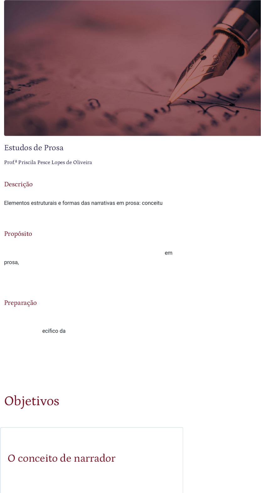 20/03/2024, 02:00 Estudos de Prosa https://stecine.azureedge.net/repositorio/00212hu/00669/index.html# 1/58 Estudos de Prosa Prof.ª Priscila Pesce Lopes de Oliveira Descrição Elementos estruturais e formas das narrativas em prosa: conceituação, evolução histórica e ferramental analítico. Propósito Compreender os elementos estruturais e as formas das narrativas em prosa, além do sistema da enunciação e dos elementos do enunciado como produtores de sentidos, a fim de contribuir para a realização de análises críticas de textos literários e outras manifestações narrativas. Preparação Tenha à mão um dicionário de Literatura para compreender o vocabulário específico da área. Na internet, você acessa gratuitamente o E-dicionário de termos literários, de Carlos Ceia, e o Dicionário de cultura básica, de Salvatore D’Onofrio. No portal Domínio público, na internet, você pode ter acesso a algumas obras literárias de autores consagrados. Objetivos Módulo 1 O conceito de narrador 20/03/2024, 02:00 Estudos de Prosa https://stecine.azureedge.net/repositorio/00212hu/00669/index.html# 2/58 Identificar as implicações do conceito e da função do narrador. Módulo 2 Estrutura da narrativa em prosa Definir os elementos estruturantes das narrativas em prosa. Módulo 3 Formas de narratividade Relacionar as classificações de gêneros literários com a prosa literária. Introdução "[...] não existe experiência humana que não seja mediada por sistemas simbólicos, e entre eles pelas narrativas." Paul Ricoeur (2012, p. 308) Estamos imersos em narrativas praticamente o tempo todo: quando relatamos um incidente a um amigo, relembramos um momento da infância, assistimos a filmes e séries, jogamos videogame ou lemos quadrinhos - e até quando dormimos e sonhamos. Certas abordagens da Psicologia consideram que a própria identidade, nossa ideia de quem somos, é uma narrativa que construímos continuamente ao longo de nossas vidas. Todas essas narrativas têm pontos em comum, ou o que se poderia chamar, em termos mais técnicos, de elementos estruturantes: personagens, tempo, espaço, trama ou enredo. Contudo, elas serão diferentes se pensarmos no tipo de relação que propõem ter com a realidade (compare, por exemplo, um testemunho em tribunal e um filme de ficção científica), na intenção de quem as elabora e nos mecanismos e nas estratégias utilizados em sua construção. 20/03/2024, 02:00 Estudos de Prosa https://stecine.azureedge.net/repositorio/00212hu/00669/index.html# 3/58 Aqui nossa atenção estará voltada para as narrativas literárias escritas, como romances e contos. A proposta é que você conheça seus principais componentes e aguce o olhar para perceber como eles produzem efeitos e sentidos. 1 - O conceito de narrador Ao �nal deste módulo, você será capaz de identi�car as implicações do conceito e da função do narrador. Distinguindo autor, escritor e narrador Assim começa o livro A morte e a morte de Quincas Berro D’água: Esse livro traz na capa o nome de Jorge Amado (1912-2001) e narra a curiosa história das últimas horas de um homem que abandonou a 20/03/2024, 02:00 Estudos de Prosa https://stecine.azureedge.net/repositorio/00212hu/00669/index.html# 4/58 respeitável posição de pai de família para levar uma vida boêmia. Após alguns parágrafos apresentando a situação de Quincas e sua família, há uma promessa: Não sei se esse mistério da morte (ou das sucessivas mortes) de Quincas Berro D’água pode ser completamente decifrado. Mas eu o tentarei, como ele próprio aconselhava, pois o importante é tentar, mesmo o impossível. (AMADO, 2008, p. 17) Para você, quem é essa pessoa que tentará decifrar o mistério? De quem é essa voz que fala conosco ao longo de toda a narrativa, descrevendo, explicando e duvidando? Essa pergunta tem várias respostas possíveis, assim como em tantas outras obras na Literatura - e de forma particular no caso da morte de Quincas. Uma das respostas é “Jorge Amado”: quem se dirige ao leitor é a pessoa que escreveu a narrativa. Jorge Amado retratado por Gilberto Gomes, 1997. Resposta 20/03/2024, 02:00 Estudos de Prosa https://stecine.azureedge.net/repositorio/00212hu/00669/index.html# 5/58 Foi com base nesse tipo de resposta que, em 1857, o escritor francês Gustave Flaubert (1821-1880) sofreu um processo de ofensa à moral por haver escrito um romance (Madame Bovary) no qual a “voz” narrativa não condenava claramente o adultério cometido pela protagonista. A morte de Madame Bovary, pintura de Albert Fourié, 1883. Uma acusação como essa se sustenta no entendimento do escritor como aquele que é a origem de suas criações e, portanto, detém a propriedade e a responsabilidade sobre elas. Subentendida está a crença de que escrever seria expressar-se, isto é, dizer aquilo que se pensa com total controle do processo. Entretanto, como bem sabe qualquer pessoa que já redigiu uma mensagem de texto, não é nada simples dizer com exatidão aquilo que estamos pensando. Essas ideias de responsabilidade e origem estão na base de abordagens críticas (ou modos de ler) que consideram o texto como uma via de acesso a outra coisa. Nessa concepção, a leitura consiste em descobrir o que o texto “quer dizer”: uma mensagem, uma intenção, um retrato social ou psicológico, uma crítica, um medo coletivo, uma pergunta etc. Já a tarefa do leitor, que se vê como um intérprete hermeneuta, é reconstituir essa outra coisa em novas frases mais inteligíveis ou menos cifradas que as do texto interpretado. Hermeneuta Hermenêutica é a técnica que utiliza instrumentos conceituais para interpretar e explicar um texto, partindo de um conteúdo manifesto para decifrar um significado velado. Segundo Bosi (1988), a ação de interpretar pretende, com base no exame de estruturas textuais e contextuais, (re)dizer o que o texto teria dito sem dizer ou dito indiretamente nas entrelinhas. Tr