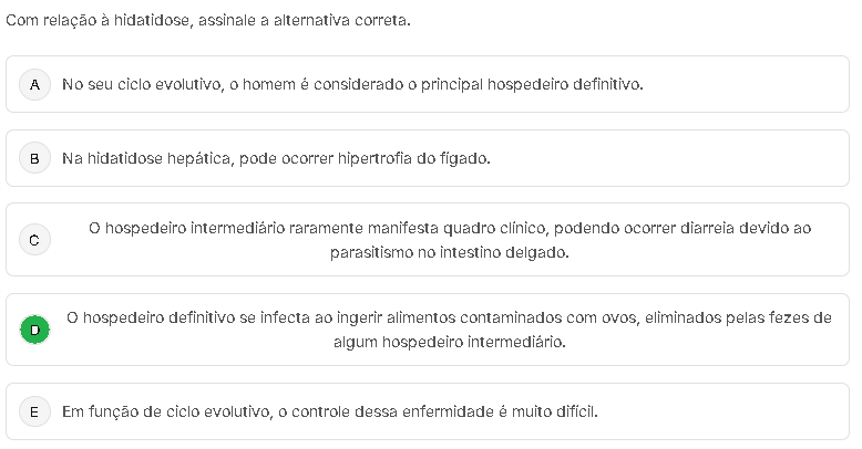 Com relação à hidatidose, assinale a alternativa correta. A No seu ciclo evolutivo, 0 homem é considerado 0 principal hospedeiro definitivo B Na hidatidose hepática, pode ocorrer hipertrofia do fígado. hospedeiro intermediário raramente manifesta quadro clínico, podendo ocorrer diarreia devido ao C parasitismo no intestino delgado. hospedeiro definitivo se infecta ao ingerir alimentos contaminados com ovos, eliminados pelas fezes de algum hospedeiro E Em função de ciclo evolutivo, 0 controle dessa enfermidade é muito