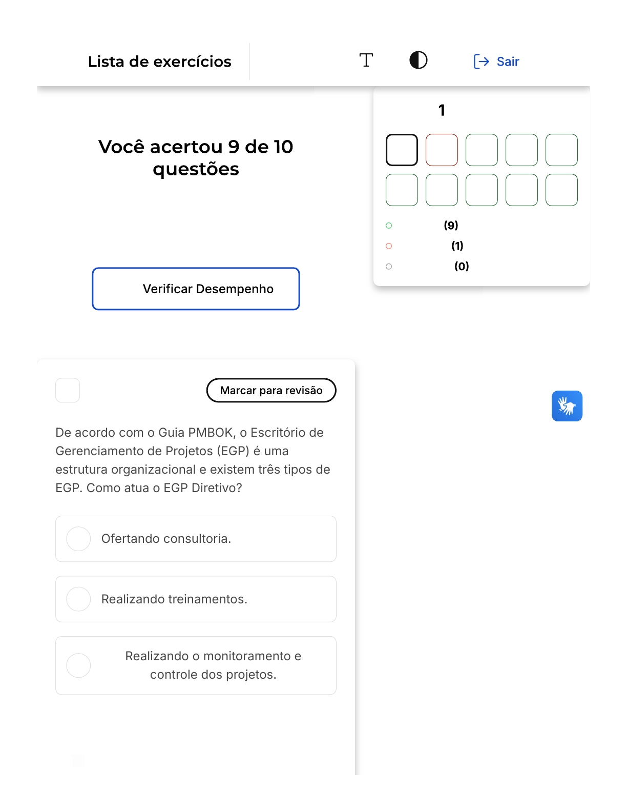 Verifique o seu desempenho e continue treinando! Você pode refazer o exercício quantas vezes quiser. A B C 1 De acordo com o Guia PMBOK, o Escritório de Gerenciamento de Projetos �EGP) é uma estrutura organizacional e existem três tipos de EGP. Como atua o EGP Diretivo? Ofertando consultoria. Realizando treinamentos. Realizando o monitoramento e controle dos projetos. Questão de 10 Corretas Incorretas Em branco 1 2 3 4 5 6 7 8 9 10 O Projeto e … Feedback Firefox https://estacio.saladeavaliacoes.com.br/exercicio/67e7c723696171df94... 1 of 14 29/03/2025, 07:18 D E Fornecendo modelos de documentos e ferramentas. Realizando o gerenciamento dos projetos. Parabéns, você selecionou a alternativa correta. Confira o gabarito comentado! O EGP Diretivo é responsável por fornecer orientação e suporte aos gerentes de projetos, bem como por garantir que os projetos sejam executados de acordo com os padrões e procedimentos estabelecidos. Para isso, o EGP Diretivo pode realizar consultoria, treinamentos, monitoramento e controle dos projetos, bem como fornecer modelos de documentos e ferramentas. 2 Feedback Firefox https://estacio.saladeavaliacoes.com.br/exercicio/67e7c723696171df94... 2 of 14 29/03/2025, 07:18 A B C D E Segundo as boas práticas do gerenciamento de projetos, delineadas pelo Guia PMBOK, os grupos de processos são um agrupamento lógico de entrada, ferramentas, técnicas e saídas. Dessa forma, o grupo de processos de Monitoramento e Controle, além de possuir processos para monitorar o trabalho que está sendo executado, também atua fazendo: O plano de gerenciamento do projeto. O controle integrado de mudanças. O conhecimento das partes interessadas. O registro das lições aprendidas. A orientação e o gerenciamento do trabalho. Opa! A alternativa correta é a letra B. Confira o gabarito comentado! De acordo com o Guia PMBOK, que estabelece as melhores práticas para o gerenciamento de projetos, o grupo de processos de Monitoramento e Controle é responsável por acompanhar o andamento do projeto e realizar ajustes quandoFeedback Firefox https://estacio.saladeavaliacoes.com.br/exercicio/67e7c723696171df94... 3 of 14 29/03/2025, 07:18 A B C necessário. Uma das principais funções desse grupo é o controle integrado de mudanças, que é um processo que permite que todas as alterações propostas ou solicitadas, ou até mesmo as alterações que já foram implementadas, sejam revisadas e aprovadas. Portanto, a alternativa correta é: "O controle integrado de mudanças". 3 Uma startup de software está adotando o conceito de programas no gerenciamento de seus múltiplos projetos. O objetivo é coordenar projetos relacionados para obter benefícios que não seriam possíveis se eles fossem gerenciados separadamente. Qual é o benefício de gerenciar projetos como parte de um programa? Reduzir a necessidade de liderança nos projetos. Aumentar a independência de cada projeto. Coordenar projetos relacionados para obter benefícios sinérgicos. Feedback Firefox https://estacio.saladeavaliacoes.com.br/exercicio/67e7c723696171df94... 4 of 14 29/03/2025, 07:18 D E Diminuir a comunicação entre os projetos. Centralizar todas as decisões financeiras. Parabéns, você selecionou a alternativa correta. Confira o gabarito comentado! O gerenciamento de projetos como parte de um programa é benéfico porque permite a coordenação entre projetos relacionados, resultando em benefícios sinérgicos. Essa abordagem garante que projetos com objetivos ou recursos similares sejam gerenciados de maneira integrada, maximizando os resultados e eficiência. As outras alternativas não refletem os benefícios do gerenciamento de programas, que se concentra na sinergia e na coordenação entre projetos relacionados. 4 A direção de uma indústria automobilística decide implantar um Escritório de Projetos �EP) para centralizar e padronizar a gestão de projetos. O objetivo é melhorar a eficiência eFeedback Firefox https://estacio.saladeavaliacoes.com.br/exercicio/67e7c723696171df94... 5 of 14 29/03/2025, 07:18 A B C D E eficácia dos projetos em desenvolvimento. Qual é o principal papel do Escritório de Projetos �EP) em uma organização? Realizar todas as operações diárias do projeto. Fornecer suporte e padronização na gestão de projetos. Definir exclusivamente os objetivos de cada projeto. Supervisionar diretamente as equipes de projeto. Atuar como principal investidor nos projetos. Parabéns, você selecionou a alternativa correta. Confira o gabarito comentado! O Escritório de Projetos desempenha um papel crucial no fornecimento de suporte e na padronização dos processos de gerenciamento de projetos dentro de uma organização. Ele ajuda a garantir que os projetos sejam geridos de forma eficiente e eficaz, seguindo as melhores práticas e metodologias padronizadas. As outrasFeedback Firefox https://estacio.saladeavaliacoes.com.br/exercicio/67e7c723696171df94... 6 of 14 29/03/2025, 07:18 A B C D E alternativas não descrevem o papel principal do EP. 5 Uma ONG ambiental está integrando o gerenciamento de portfólios em sua estratégia de projetos. O foco é alinhar os projetos às metas estratégicas da organização, garantindo que eles contribuam para os objetivos gerais. Qual é a importância do gerenciamento de portfólios em uma organização? Executar individualmente cada projeto. Garantir a qualidade técnica de cada projeto. Alinhar projetos às metas estratégicas da organização. Reduzir os custos de todos os projetos. Aumentar a velocidade de entrega dos projetos. Parabéns, você selecionou a Feedback Firefox https://estacio.saladeavaliacoes.com.br/exercicio/67e7c723696171df94... 7 of 14 29/03/2025, 07:18 A alternativa correta. Confira o gabarito comentado! O gerenciamento de portfólios é essencial para alinhar os projetos às metas estratégicas de uma organização. Ele permite que a organização priorize e gerencie seus projetos de forma que eles co