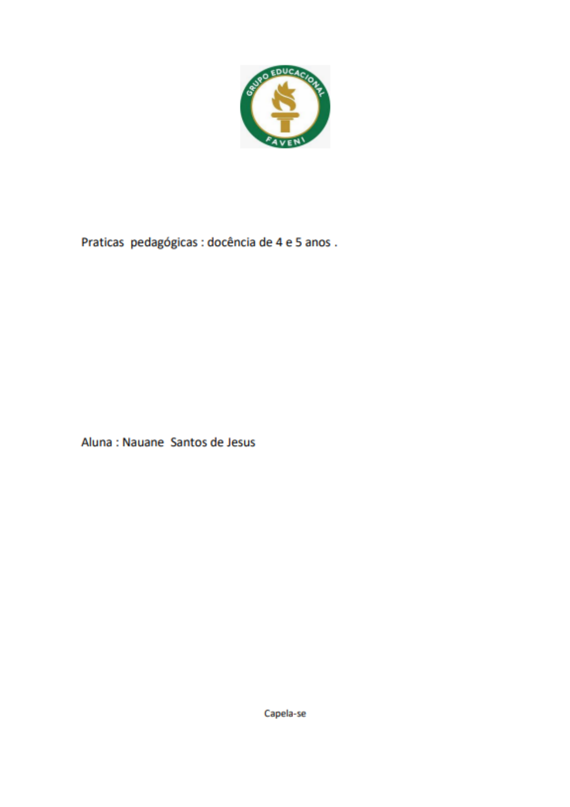 Praticas pedagógicas : docência de 4 e 5 anos Aluna : Nauane Santos de Jesus Capela-seNome: Nauane Santos de Jesus 6° semestre ATIVIDADE PRÁTICA PEDAGÓGICA Para esta prática, eleja um tema para elaborar seu projeto. Reflita sobre a importância de cada um deles para sua formação profissional e para a aprendizagem significativa de seus alunos. De acordo com a BNCC, segue abaixo os eixos temáticos que devem ser trabalhados nesta faixa etária: o eu, o outro e o nós Corpo, gestos e movimentos Traços, sons, cores e formas Escuta, fala, pensamento e imaginação Projeto: Corrente do Bem, valorizando a vida. Tema: Valorizando a vida e a solidariedade ao próximo Turma Estágio - crianças de 5 anos OBJETIVO GERAL: valorizar o ser humano, resgatando a importância das virtudes, respeito mútuo, solidariedade e amor ao próximo. OBJETIVOS ESPECÍFICOS: desenvolver a arte de ouvir e ser ouvido; Trabalhar as emoções e suas sensações. compreender a importância do cuidado com a saúde promover um clima emocional positivo realizar ações individuais, simples e positivas, que visam mobilizar toda a escola. DURAÇÃO: 20 dias, campo de Experiência: o eu, o outro e o nós É na interação com os pares e com adultos que as crianças vão constituindo um modo próprio de agir, sentir e pensar e vão descobrindo que existem outros modos de pessoas diferentes, com outros pontos de vista. Conforme vivem suas primeiras experiências sociais (na na instituição escolar, na coletividade), constroem percepções e questionamentos sobre si e sobre os outros, diferenciando-se e, simultaneamente, identificando- se como seres individuais e sociais. Ao mesmo tempo que participam de relações sociais e de cuidados pessoais, as crianças constroem sua autonomia e senso de autocuidado, de reciprocidade e de interdependência com o meio. Por sua vez, na Educação Infantil, é preciso criar oportunidades para que as crianças entrem em contato com outros grupossociais e culturais, outros modos de vida, diferentes atitudes, técnicas e rituais de cuidados pessoais e do grupo, costumes, celebrações e narrativas. Nessas experiências, elas podem ampliar o modo de perceber a si mesmas e ao outro, valorizar sua identidade, respeitar os outros e reconhecer as diferenças que nos constituem como seres humanos. Com base no filme corrente do Bem, promover ações que compartilhe ações de multiplicações que façam a diferença e ajude as pessoas, passar pequenos trechos sobre o filme com o foco na corrente do bem. A partir do filme realizar algumas ações. ação: - Falar com alguém com quem você nunca falou na escola ou que está sumido aulas Você já percebeu que tem muita gente na escola e até na nossa sala com quem a gente nunca falou? Ou que faz muito tempo que não aparece? A proposta é que você escolha alguém para dizer um "oi, como você está hoje?" Pode ser algum professor ou colaborador da escola também. Mas escolha hoje se aproximar de alguém diferente! Trocar uma palavra com uma pessoa nova ou que está sumida faz com que a gente se sinta mais próximo. E pode ser o começo de uma nova amizade, podendo ser por desenho ou carta demostrando o quanto a pessoa é importante. Realizar uma roda de conversa de como foi o encontro com as pessoas que sentimentos sentidos, se foi fácil ou dificil. ação - Oferecer ajuda cria oportunidades para mostrarmos nosso valor. Você já ajudou alguém hoje? A ideia é que você ofereça uma ajuda a alguém da sua escola. Pode ser um colega que perdeu o material que precisa da sua ajuda para fazer algo, um colaborador da escola que está com alguma dificuldade ou alguém outro que você notou estar triste. Oferecer uma simples ajuda faz com que o outro saiba que não está sozinho, se sinta melhor e te dá a oportunidade de mostrar seu valor. Roda de conversa sobre como foi ajudar as pessoas, realizar uma lista de sentimentos e fazer a relação dos sentimentos com os nomes das crianças. Ação Reconhecer que a gente precisa de ajuda é uma demonstração de força, não de fraqueza propomos que você peça a alguém de sua escola uma ajuda ou auxilio para algo que você precisa. Pode ser para te dar um conselho, para te ajudar com uma tarefa da escola, para desabafar, contar um fato. Pedir ajuda dá uma grande oportunidade ao outro de mostrar que ele é necessário e a você de não se sentir sozinho. Roda de conversa de como foi pedir ajuda e como precisamos das pessoas. Ação - Ser capaz de apreciar o bom da vida. Quantas pequenas coisas boas acontecem com a gente durante o dia, mas que as vezes nem prestamos atenção? Crie uma lista com coisas, ações, pessoas, sentimentos, desejos e sonhos que são bons Capela-se