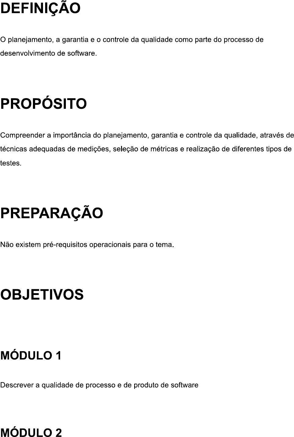 DEFINIÇÃO planejamento, a garantia e o controle da qualidade como parte do processo de desenvolvimento de software. PROPÓSITO Compreender a importância do planejamento, garantia e controle da qualidade, através de técnicas adequadas de medições, seleção de métricas e realização de diferentes tipos de testes PREPARAÇÃO Não existem pré-requisitos operacionais para o OBJETIVOS MÓDULO 1 Descrever a qualidade de processo e de produto de software MÓDULO 2Explicar o processo da garantia de qualidade de software MÓDULO 3 Explicar o planejamento da qualidade e o controle da qualidade de software MÓDULO 4 Descrever as medições e métricas do software INTRODUÇÃO software tem um destaque cada vez maior na vida moderna. Podemos imaginar a complexidade de um software embarcado em uma aeronave com 500 passageiros ou um software que gerencia o tráfego aéreo de uma grande cidade. A construção de um software desta magnitude exige o envolvimento de vários especialistas, tais como engenheiros de software, web designers, administradores de banco de dados, arquitetos de software e outros que trabalham arduamente para o sucesso do produto software. A referida equipe tem uma composição multidisciplinar, refletindo uma característica do software: A complexidade. trato desta complexidade requer a aplicação da Engenharia de Software, que por sua vez tem como foco a camada qualidade. A referida camada garante que os requisitos que atendem às expectativas do usuário serão cumpridos. Nesse contexto, o presente tema descreve o planejamento, a garantia e o controle da qualidade de software. MÓDULO 1Descrever a qualidade de processo e de produto de software ENGENHARIA DE SOFTWARE QUALIDADE Vamos iniciar nosso estudo sobre qualidade no contexto da área de conhecimento Engenharia de Software, que tem como principal produto o software. A cada dia, o produto software está mais presente nas nossas vidas, quer por meio das redes sociais, em nossos veículos ou nas nossas residências. No contexto da qualidade de software, podemos destacar a denominada "Crise do software" sintetizada pela afirmativa a seguir: A MAIOR CAUSA DA CRISE DO SOFTWARE É QUE AS MÁQUINAS SE TORNARAM VÁRIAS ORDENS DE MAGNITUDE MAIS POTENTES! EM TERMOS DIRETOS, ENQUANTO NÃO HAVIA MÁQUINAS, PROGRAMAR NÃO ERA UM PROBLEMA; QUANDO TIVEMOS COMPUTADORES FRACOS, ISSO SE TORNOU UM PROBLEMA PEQUENO, E AGORA QUE TEMOS COMPUTADORES GIGANTESCOS, PROGRAMAR TORNOU-SE UM PROBLEMA GIGANTESCO. DIJKSTRA, 1972 Importante destacar que o aprimoramento tecnológico do hardware nos últimos anos permitiu o desenvolvimento de softwares cada vez mais complexos, tendo um forte impacto na indústria de software.EXEMPLO Podemos apresentar a substituição do paradigma estruturado pelo paradigma orientado a objetos, que permite o reuso intensivo de especificação, bem como uma melhor manutenibilidade e, como consequência, o desenvolvimento de softwares mais complexos. Podemos imaginar as sérias consequências na falha de um software embarcado em uma aeronave com 500 passageiros ou em um sistema de controle de tráfego aéreo de uma grande cidade. Uma falha seria algo bem trágico! Ambos os exemplos possuem uma característica comum: A complexidade. A melhor tratativa para a complexidade é a aplicação de metodologia que permita a decomposição do problema em problemas menores de forma sistemática, cabendo à engenharia de software essa sistematização. A engenharia de software é uma tecnologia em camadas Veja: FERRAMENTAS MÉTODOS PROCESSO QUALIDADE Figura 1 - Camadas da Engenharia de Software. QUALIDADE A camada qualidade garante que os requisitos que atendem às expectativas do usuário serão cumpridos. PROCESSO A camada de processo determina as etapas de desenvolvimento do software. MÉTODOS A camada de métodos define os artefatos gerados em função da técnica de modelagem adotada.FERRAMENTAS A camada ferramentas estimula a utilização de ferramentas CASE. CASE É uma classificação que abrange todas as ferramentas baseadas em computadores que auxiliam atividades de Engenharia de software, desde análise de requisitos e modelagem até programação e testes. Retornando aos nossos exemplos, qual camada evitaria uma falha? Vejamos os seguintes argumentos e depois tire a sua conclusão. ATENÇÃO A camada base é a camada de processo, sendo a camada qualidade dependente da existência dessa, ou seja, a definição de um processo de desenvolvimento de software é condição para a implantação de um sistema de qualidade em um projeto de software. Os métodos e ferramentas da engenharia de software servem, entre outras coisas, ao propósito de garantir, ou pelo menos facilitar, a obtenção do objetivo de garantir a qualidade no software.Assista ao vídeo abaixo para saber um pouco mais sobre qualidade de software e as atividades de gerenciamento da qualidade no processo de desenvolvimento de software: QUALIDADE DE SOFTWARE De acordo com Pressman (2016), a qualidade de software é definida como uma gestão de qualidade efetiva, aplicada de modo a criar um produto útil que forneça valor mensurável para aqueles que o produzem e para aqueles que o utilizam.Roger Pressman Vamos a uma análise da citada definição: GESTÃO DE QUALIDADE Permite estabelecer uma infraestrutura de suporte ao desenvolvimento de software com qualidade. PRODUTO ÚTIL Inclui o atendimento às necessidades dos usuários, ou seja, atendimento aos requisitos, sendo esse produto isento de defeitos. VALOR MENSURÁVEL Permite a agregação de valor aos usuários e ao fabricante, sendo que nesse último caso, os engenheiros de software terão menos trabalho de manutenção e mais tempo disponível na construção de novas aplicações. gerenciamento de qualidade de software usualmente é estruturado em três atividades principais:GERENCIAMENTO DA QUALIDADE DE SOFTWARE GARANTIA PLANEJAMENTO CONTROLE DA QUALIDADE DA QUALIDADE DA QUALIDADE Figura 2 - Gerencia