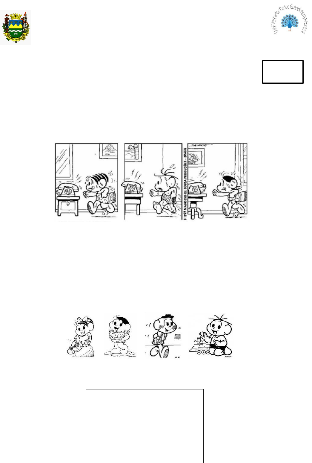 Prefeitura Municipal de Taubaté Secretaria da Educação EMEF Vereador Pedro Grandchamp – Fonte II NOME: ___________________________________________________________ ___º ANO ___ DATA: ___/____/2025 PROFESSORA: _________________________________ Campo para nota AVALIAÇÃO DE LÍNGUA-PORTUGUESA__1º BIMESTRE__2º ANO A 1. OBSERVE A TIRINHA EM QUADRINHOS: AGORA RESPONDA: QUAIS PERSONAGENS APARECEM NA HISTÓRIA EM QUADRINHOS? ( ) MAGALI, MÔNICA E CASCÃO. ( ) MÔNICA, CEBOLINHA E CHICO BENTO. ( ) MÔNICA, CEBOLINHA E MAGALI. CIRCULE O PERSONAGEM QUE ESTÁ LIGANDO PARA ELES. QUAL DESSES PERSONAGENS É O SEU FAVORITO? DESENHE. 2. COMPLETE O ALFABETO. 3. LIGUE AS FIGURAS ÀS VOGAIS QUE INICIEM SEUS NOMES. A E I O U 4. PINTE A PALAVRA CORRETA: 5. CIRCULE AS FIGURAS QUE RIMAM COM LEÃO. PINTE A FIGURA QUE RIMAR COM MAÇÃ. 6. ESCREVA SEU NOME: COPIE SEU NOME DO CRACHÁ. image6.png image7.jpeg image8.jpeg image9.jpeg image1.jpg image2.png image3.jpeg image4.jpeg image5.png