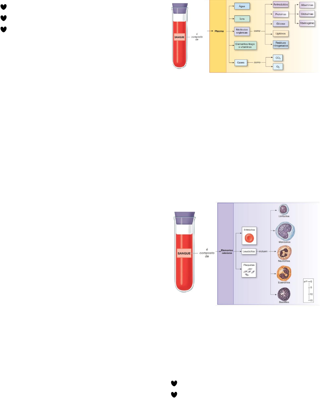 Morfofisiologia Sanguínea - Composição e funções Luz do vaso = buraco O endotélio está em contato com o sangue. As arteriolas controlam o fluxo sanguineo nos tecidos. Pressão sistólica: contração Pressão diastólica: relaxamento Pressão que ocorre nos ventriculos. Sangue Funções 1. Transporte de O2 e nutrientes. 2. Remoção de CO2 e transporte de residuos metabólicos (ex. ureia). 3. Transporte de hormônios. 4. Regulação da temperatura. 5. Equilibrio ácido-base (regulação do pH corporal – fundamental para a gasometria). 6. Defesa imunológica. 7. Coagulação sanguinea. Composição O sangue é um tecido conectivo, composto de elementos celulares suspensos em uma extensa matriz fluida, chamada de plasma (1/4 do LEC). É a porção circulante do liquido extracelular responsável por transportar material de uma parte do corpo para outra. Volume para adulto de 70 Kg: 7% do peso total do seu corpo, ou 0,07 X 70 kg = 4,9 kg = 5 kg. Ou seja, 1 kg de sangue ocupa o volume de 1 litro. 2 L = são células sanguineas 3 L = plasma Íons: responsáveis pelo potencial de ação. Residuos nitrogenados: ureia. Albuminas: principal proteina do organismo, regula a pressão, transporta hormônios e atua como substrato. Globulinas: atuam no sistema de defesa, como anticorpos. Fibrinogênio: faz a coagulação no sangue (fibrina). Linfócito CD4: “helper” Linfócito CD8: citotóxico Linfócito B: anticorpos. Os monócitos, quando estão nos tecidos, se chamam macrófagos. Atuam no sistema imune. Sistema Inato: já nasce com ele. Sistema Adaptativo: o corpo cria com o tempo. Os neutrófilos aumentam em infecções bacterianas e fazem fagocitose no sangue. Morfofisiologia Sanguínea - Composição e funções Basófilos teciduais são chamados de mastócitos. Plasma É a matriz fluida do sangue, dentro do qual os elementos celulares estão suspensos. A água é o principal componente do plasma, correspondendo a aproximadamente 92% do seu peso. As proteinas respondem por outros 7%. Os 1% remanescentes são moléculas orgânicas dissolvidas (aminoácidos, glicose, lipideos e residuos nitrogenados), ions (Na+, K+, Cl-, H+, Ca2+, e HCO3 -), elementos-traço e vitaminas, além de oxigênio dissolvido (O2) e dióxido de carbono (CO2). Tem Composição idêntica ao do liquido intersticial (exceto pelas proteinas plasmáticas). Albumina = 60% das proteinas plasmáticas. Globulinas = Ac e transportadoras (anticorpo). Fibrinogênio = coagulação. Transferrina = transporte de ferro. Plasma: tem fator de coagulação (citrato, EDTA, heparina, fleurato). Soro: não tem fator de coagulação. Presença de proteinas: torna a pressão osmótica do sangue mais alta do que a do liquido intersticial. Este gradiente tende a puxar a água do liquido intersticial para os capilares e compensar a filtração dos capilares criada pela pressão do sangue. A pressão oncótica é a pressão que as proteinas existentes no sangue geram nas paredes dos capilares sanguineos. Funções das proteinas plasmáticas Nome Origem Função Albuminas (múltiplos tipos) Figado Contribuintes principais para a pressão coloidosmótica do plasma; carreadores para várias substâncias Globulinas (múltiplos tipos) Figado e tecido linfático Fatores de coagulação, enzimas, anticorpos e carreadores para várias substâncias Fibrinogênio Figado Forma filamentos de fibrina essenciais para a coagulação do sangue Morfofisiologia Sanguínea - Composição e funções Transferrina Figado e outros tecidos Transporte de ferro Ferritina: Reserva de ferro no organismo (marcador inflamatório). o ferro fica dentro das hemácias. Elementos Celulares Glóbulos vermelhos ou eritrócitos (RBCs) Glóbulos brancos ou leucócitos (WBCs) Plaquetas ou trombócitos. Eritrócitos: perdem seus núcleos no momento em que entram na corrente circulatória. As hemácias têm núcleo quando estão na medula óssea, mas na corrente sanguinea não. Sua principal função é o transporte de gases. Plaquetas: fragmentos celulares (não é célula) originados dos megacariócitos. Sua principal função é fazer a coagulação sanguinea. Leucócitos: desempenham um papel-chave na resposta imune, defendendo o corpo contra invasores externos, como parasitos, bactérias e virus. A maioria dos leucócitos circulam através do corpo no sangue, mas seu trabalho é geralmente levado a cabo nos tecidos, em vez de no sistema circulatório. Funções Fagócitos: Neutrófilos, monócitos e macrófagos (no tecido), conseguem fagocitar. Imunócitos: Linfócitos. Granulócitos: Basófilos, os eosinófilos e os neutrófilos. Produção de células sanguineas As diferentes células sanguineas derivam de uma célula precursora, chamada de célula- tronco hematopoiética pluripotente, encontrada principalmente na medula óssea. Quando se especializam, elas diminuem seus possiveis destinos. Morfofisiologia Sanguínea - Composição e funções Células progenitoras comprometidas: Se comprometem a se desenvolverem em um ou, talvez, dois tipos celulares. Blastos: células inativas. Apenas as células da circulação podem estar presentes no sangue periférico. Leucemia Mieloide Aguda (LMA) Leucemia Mieloide Crônica (LMC) Leucemia Linfoblástica Aguda (LLA) Agudo: imaturo Crônico: maduro Hematopoiese: sintese de células sanguineas. 3ª semana fetal: células especializadas do saco vitelino do embrião formam aglomerados. Alguns desses aglomerados de células estão destinados a se tornarem o revestimento endotelial dos vasos sanguineos, ao passo que outros se tornam células sanguineas. À medida que o embrião se desenvolve, a produção das células sanguineas estende-se do saco vitelino para o figado, o baço e a medula óssea. Após o nascimento, o figado e o baço param de produzir células sanguineas. A hematopoiese continua ocorrendo na medula de todos os ossos do esqueleto até a idade de 5 anos. Com o envelhecimento, as regiões ativas da medula diminuem. Em adulto