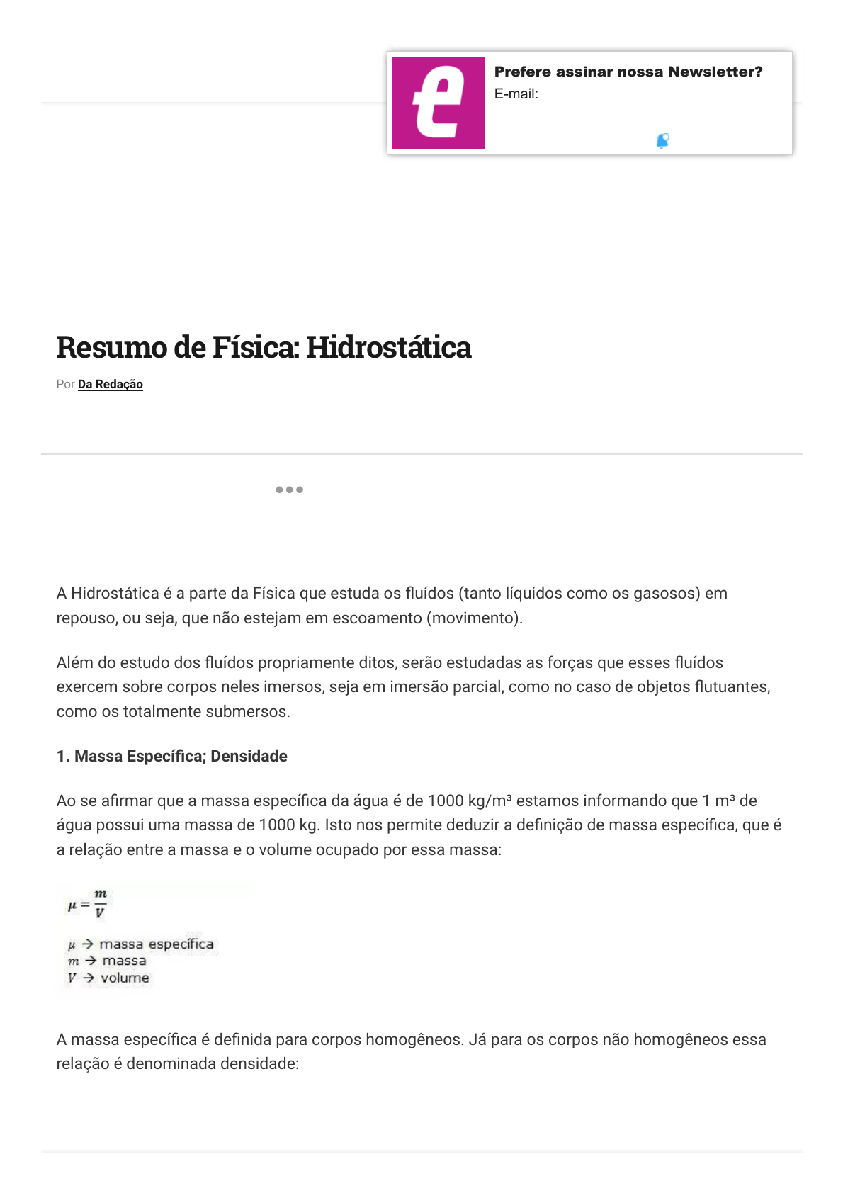 24/10/2017 Resumo de Física: Hidrostática | Guia do Estudante https://guiadoestudante.abril.com.br/estudo/resumo-de-fisica-hidrostatica/ 1/12 Por Da Redação A Hidrostática é a parte da Física que estuda os �uídos (tanto líquidos como os gasosos) em repouso, ou seja, que não estejam em escoamento (movimento). Além do estudo dos �uídos propriamente ditos, serão estudadas as forças que esses �uídos exercem sobre corpos neles imersos, seja em imersão parcial, como no caso de objetos �utuantes, como os totalmente submersos. 1. Massa Especí�ca; Densidade Ao se a�rmar que a massa especí�ca da água é de 1000 kg/m³ estamos informando que 1 m³ de água possui uma massa de 1000 kg. Isto nos permite deduzir a de�nição de massa especí�ca, que é a relação entre a massa e o volume ocupado por essa massa: A massa especí�ca é de�nida para corpos homogêneos. Já para os corpos não homogêneos essa relação é denominada densidade: Estudo Resumo de Física: Hidrostática 16 maio 2017, 13h28 - Publicado em 17 ago 2012, 14h01 PUBLICIDADE AssinePrefere assinar nossa Newsletter? E-mail: OK ✕ Powered by Pushnews https://guiadoestudante.abril.com.br/autor/wpvipabril whatsapp://send?text= https://guiadoestudante.abril.com.br/estudo/resumo-de-fisica-hidrostatica/?utm_source=whatsapp&utm_medium=social&utm_campaign=barra-compartilhamento via Guia do Estudante https://facebook.com/sharer/sharer.php?u=https://guiadoestudante.abril.com.br/estudo/resumo-de-fisica-hidrostatica/ https://twitter.com/intent/tweet?url=https://guiadoestudante.abril.com.br/estudo/resumo-de-fisica-hidrostatica/&text=&via=ge https://pinterest.com/pin/create/link/?url=https://guiadoestudante.abril.com.br/estudo/resumo-de-fisica-hidrostatica/&description=&media= https://guiadoestudante.abril.com.br/estudo https://guiadoestudante.abril.com.br/ https://www.assine.abril.com.br/portal/paginasEstaticas!showPromocao.action?codPromocao=malho_guia&?origem=sr_ge_topo&utm_source=sites&utm_medium=sr&utm_campaign=sr_ge_topo_estudo_desktop https://www.pushnews.eu/pt?utm_source=&utm_medium=OnSitePush&utm_campaign=icon https://www.pushnews.eu/pt?utm_source=&utm_medium=OnSitePush&utm_campaign=text 24/10/2017 Resumo de Física: Hidrostática | Guia do Estudante https://guiadoestudante.abril.com.br/estudo/resumo-de-fisica-hidrostatica/ 2/12 2. Pressão A pressão é de�nida como a aplicação de uma força distribuída sobre uma área: A unidade de medida da pressão é newton por metro quadrado (N/m²). A pressão pode também ser exercida entre dois sólidos. No caso dos �uídos o newton por metro quadrado é também denominado pascal (Pa). 3. Princípio de Stevin O princípio de Stevin nos permite calcular a pressão em um líquido em repouso, estando com sua superfície livre em contato com a atmosfera: Replay Assine Prefere assinar nossa Newsletter? E-mail: OK ✕ Powered by Pushnews https://guiadoestudante.abril.com.br/ https://www.assine.abril.com.br/portal/paginasEstaticas!showPromocao.action?codPromocao=malho_guia&?origem=sr_ge_topo&utm_source=sites&utm_medium=sr&utm_campaign=sr_ge_topo_estudo_desktop https://www.pushnews.eu/pt?utm_source=&utm_medium=OnSitePush&utm_campaign=icon https://www.pushnews.eu/pt?utm_source=&utm_medium=OnSitePush&utm_campaign=text 24/10/2017 Resumo de Física: Hidrostática | Guia do Estudante https://guiadoestudante.abril.com.br/estudo/resumo-de-fisica-hidrostatica/ 3/12 Uma das consequências do princípio de Stevin é: “Em um líquido em equilíbrio, a pressões são iguais em todos os pontos da mesma horizontal”. 4. Pressão atmosférica No planeta Terra em qualquer parte de sua superfície os corpos estão envoltos em um �uído gasoso, o ar. Como todo �uído ele causa uma pressão nos corpos nele imersos. A pressão atmosférica deve ser expressa em Pa (N/m²). Mas outras unidades podem ser encontradas: – atmosfera (atm) – milímetros de mercúrio (mmHg) ou centímetros de mercúrio (cmHg) – metros de coluna de água (mca). Então, é possível relacionar as várias medidas comparando-se os valores da pressão atmosférica ao nível do mar: 1 atm = 101325 Pa = 10,2 mca = 760 mmHg 5. Princípio de Pascal O Princípio de Pascal a�rma que: “Um acréscimo de pressão exercido em qualquer ponto de um �uído é transmitido para todo o �uído”. Com esse princípio é possível construir e dimensionar macacos hidráulicos, prensas hidráulicas, etc. Como a pressão é igual em todos os pontos do �uído e supondo a área do pistão da direita sendo 5 vezes maior que o da esquerda tem-se: Dessa maneira uma força F_1 será, no exemplo, ampli�cada (F_2 ) cinco vezes. Esse seria a versão hidráulica da alavanca mecânica concebida por Arquimedes. AssinePrefere assinar nossa Newsletter? E-mail: OK ✕ Powered by Pushnews https://guiadoestudante.abril.com.br/ https://www.assine.abril.com.br/portal/paginasEstaticas!showPromocao.action?codPromocao=malho_guia&?origem=sr_ge_topo&utm_source=sites&utm_medium=sr&utm_campaign=sr_ge_topo_estudo_desktop https://www.pushnews.eu/pt?utm_source=&utm_medium=OnSitePush&utm_campaign=icon https://www.pushnews.eu/pt?utm_source=&utm_medium=OnSitePush&utm_campaign=text 24/10/2017 Resumo de Física: Hidrostática | Guia do Estudante https://guiadoestudante.abril.com.br/estudo/resumo-de-fisica-hidrostatica/ 4/12 6. Princípio de Arquimedes Deve-se também a Arquimedes a de�nição da força de Empuxo gerada por um corpo imerso em um �uído. “A força de empuxo de um corpo imerso em um �uído é igual ao peso do �uído deslocado”. Se o empuxo for maior que a força peso do corpo, a tendência do corpo é de subir com aceleração. No caso de o peso ser menor que o empuxo, a tendência é de o corpo descer com aceleração. No caso do empuxo ser igual à força peso o corpo terá a tendência de permanecer parado. Nota: ao contrário do que se vê em muitos �lmes e da crença geral, um submarino ao tentar emergi