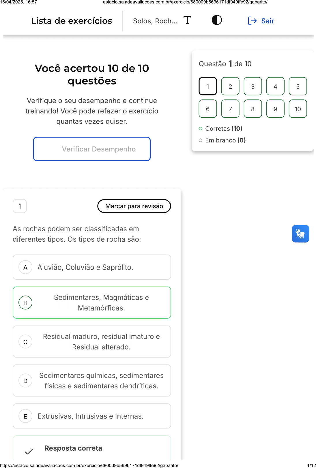 16/04/2025, 16:57 Lista de exercícios Solos, Roch... T Sair Questão 1 de 10 Você acertou 10 de 10 questões 1 2 3 4 5 Verifique o seu desempenho e continue treinando! Você pode refazer o exercício 6 7 8 9 10 quantas vezes quiser. Corretas (10) Em branco (0) Verificar Desempenho 1 Marcar para revisão As rochas podem ser classificadas em diferentes tipos. Os tipos de rocha são: A Aluvião, Coluvião e Saprólito. Sedimentares, Magmáticas e B Metamórficas. Residual maduro, residual imaturo e C Residual alterado. Sedimentares químicas, sedimentares D físicas e sedimentares dendríticas. E Extrusivas, Intrusivas e Internas. Resposta correta 1/1216/04/2025, 16:57 Parabéns, você selecionou a alternativa correta. Confira o gabarito comentado! Gabarito Comentado As rochas são classificadas em três tipos principais: sedimentares, magmáticas e metamórficas. As rochas sedimentares são formadas a partir da sedimentação de partículas de outras rochas ou de restos de seres vivos. As rochas magmáticas, também conhecidas como ígneas, são formadas a partir do resfriamento do magma. Por fim, as rochas metamórficas são formadas a partir da transformação de qualquer tipo de rocha quando submetidas a condições de pressão e temperatura diferentes das que originaram. Portanto, a alternativa correta é a B. 2 Marcar para revisão Desastres naturais podem ser um fator de forte impacto nos solos e rochas. Podem ser desastres naturais conhecidos, exceto: A Chuvas torrenciais B C Secas 2/1216/04/2025, 16:57 D Inundações E Marés Resposta correta Parabéns, você selecionou a alternativa correta. Confira o gabarito comentado! Gabarito Comentado As marés, apesar de serem fenômenos naturais, não são consideradas como causadoras de desastres naturais conhecidos, especialmente quando estão sob controle. Isso se contrasta com as outras opções apresentadas na questão (chuvas torrenciais, secas e inundações), que são fenômenos naturais conhecidos por causar grandes impactos e danos ao solo, às rochas e, consequentemente, ao meio ambiente e à vida humana. 3 Marcar para revisão Os movimentos de massa são classificados como: rastejos, corridas e escorregamentos. As corridas podem ser: A De terra, de solo e de lama. B De pedra, de silte e de areia. 3/1216/04/2025, 16:57 C Rotacional, Translacional e de Cunha. D De detritos, de rochas e de solos. E De terra, de água e de pó. Resposta correta Parabéns, você selecionou a alternativa correta. Confira o gabarito comentado! Gabarito Comentado Os movimentos de massa, especificamente as corridas, são classificados em três tipos principais: de terra, de solo e de lama. Essa classificação se dá de acordo com o material que está em movimento. As outras alternativas apresentam classificações que não se aplicam ao contexto de corridas em movimentos de massa, como por exemplo, a alternativa C que apresenta tipos de movimentos de massa (rotacional, translacional e de cunha) e não tipos de corridas. Portanto, a alternativa correta é a A. 4 Marcar para revisão Os rastejos podem causar danos significativos em taludes e encostas adjacentes a obras civis. Rastejos são: 4/1216/04/2025, 16:57 Movimentos de terras com velocidades muito baixas, ocorrendo A com frequência sazonal ou intermitente. Movimentos de terras com velocidades médias, deslocando B pequenos ou grandes volumes de material. Movimentos de terras com grandes C velocidades, que ocasionalmente provocam grandes catástrofes. Movimentos de terras caracterizados D por afundamentos rápidos. Movimentos de terras em que a E superfície de ruptura pode ser acima ou abaixo do sopé do talude. Resposta correta Parabéns, você selecionou a alternativa correta. Confira o gabarito comentado! Gabarito Comentado Os rastejos são definidos como movimentos de terras com velocidades muito baixas, que ocorrem com frequência sazonal ou intermitente. Esses movimentos podem causar danos significativos em taludes e encostas adjacentes a obras civis, pois, apesar de sua baixa velocidade, a constância desses movimentos pode levar a alterações estruturais significativas ao longo do tempo. Portanto, a alternativa 5/1216/04/2025, 16:57 A é a correta, pois descreve corretamente a definição de rastejos. 5 Marcar para revisão Os movimentos de massa podem ser classificados quanto ao tipo. Assinale a alternativa que representa dois destes tipos de movimento de massa: A Tombamentos e rolamentos. B Earth flow e Snow flow. C Rastejos e Corridas. D Sismos e Tsunamis. E Creeps e Slumps. Resposta correta Parabéns, você selecionou a alternativa correta. Confira o gabarito comentado! Gabarito Comentado Os movimentos de massa em solos podem ser classificados em diversos tipos, entre eles, os rastejos e as corridas, que são representados na alternativa C. Os rastejos são movimentos lentos e contínuos de partículas de solo ou rocha em encostas, 6/1216/04/2025, 16:57 enquanto as corridas são movimentos rápidos e de grande volume de material. Portanto, a alternativa correta é a C, que menciona esses dois tipos de movimentos de massa. 6 Marcar para revisão Os movimentos de blocos rochosos consistem nos deslocamentos, por gravidade, de blocos de rocha. Não é um movimento de elemento rochoso: A Rastejo. B Tombamento. C Escorregamento. D Colapso. E Rolamento. Resposta correta Parabéns, você selecionou a alternativa correta. Confira o gabarito comentado! Gabarito Comentado termo "Colapso" é utilizado para descrever um movimento de massa de solo, e não de rocha. Os movimentos de 7/1216/04/2025, 16:57 stacio.saladeavaliacoes.com.br/exercicio/680009b5696171df949ffe92/gabarito/ blocos rochosos, como o rastejo, tombamento, escorregamento e rolamento, são deslocamentos que ocorrem por ação da gravidade. No entanto, o colapso é um fenômeno que ocorre quando o solo, e não a rocha, sofre uma súbita perda de resistência e se deforma rapidamente. Portanto, o colapso não é considerado um movime