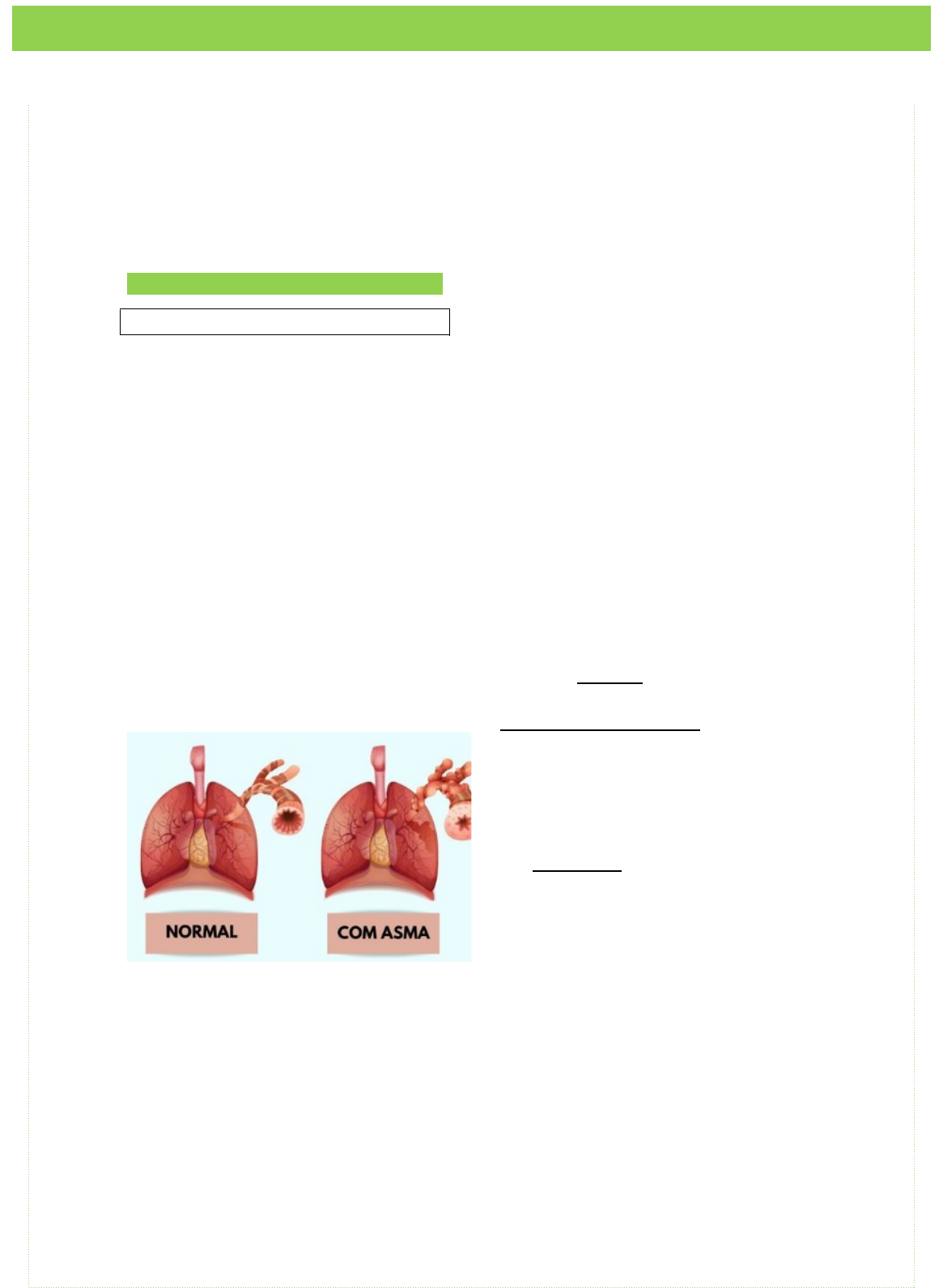 Asma Marc 8: Objetivos: 1. Revisar a classificação das doenças respiratórias crônicas na infância. 2. Entender os diagnósticos diferenciais das doenças respiratórias crônicas e agudas com a asma na infância 3. Compreender o diagnóstico e manejo da asma na infância. OBJETIVO 1 1. ASMA A asma é uma doença crônica heterogênea das vias aéreas caracterizada pela inflamação, hiperresponsividade e remodelamento brônquico secundário à exposição a determinados gatilhos, o que leva a limitação do fluxo expiratório de forma variável e reversível. Em fases mais tardias, a limitação ao fluxo aéreo pode se tornar persistente. Os seus sintomas podem variar em intensidade ao longo do tempo. · Sibilância · Falta de ar · Aperto no peito · Tosse Epidemiologicamente, a asma é comum em todas as faixas etárias e usualmente tem início na infância. A doença acometa de 8 a 10% da população mundial, com predomínio em indivíduos jovens do sexo masculino e mulheres adultas. Nas últimas décadas, a prevalência da asma aumentou mundialmente, inclusive em países em desenvolvimento. Apesar do aumento da prevalência da asma, a mortalidade vem apresentando queda ao longo das últimas décadas e essa queda observada no país coincide com a introdução do uso de corticoides inalatórios instituída por políticas públicas de saúde. Imunopatologia: Uma das características mais típicas da asma é a variedade de formas de apresentação da doença, o que faz com que a asma se assemelhe muito mais com uma síndrome do que propriamente com uma doença. Praticamente todos os tipos celulares e seus mediadores químicos já foram associados ao processo inflamatório na asma. Os linfócitos se destacam como os principais maestros desse processo. Os linfócitos B e plasmócitos participam do processo com a produção em grande quantidade de imunoglobulinas E, que respondem de forma precoce aos antígenos inalados e iniciam a cascata inflamatória por ativação dos mastócitos. Os linfócitos T reconhecem de forma específica os antígenos e iniciam a ativação imune. A ativação desses tipos celulares leva à produção de inúmeros mediadores químicos que retroalimentam o processo. Destacam-se os mediadores efetores liberados por eosinófilos presentes em grande número na mucosa inflamada. Mas os principais mediadores desse processo, são as citocinas interleucina-4, -5 e -13, com importante efeito indutor em outros tipos celulares. É isso que caracteriza a inflamação tipo 2. A mensuração do número de eosinófilos circulantes tem sido apontada como um marcador putativo para a caracterização desse fenótipo de forma segura e barata. Outro biomarcador que expressa a gravidade da inflamação local é a dosagem do óxido nítrico exalado. Um dos avanços mais recentes foi a identificação das chamadas alarminas, mediadores produzidos pelo epitélio brônquico em resposta inespecífica a estímulos de perigo. Além de participarem da indução da inflamação tipo 2, estão também envolvidas na inflamação não tipo 2, principalmente na inflamação neutrofílica, via linfócitos Th17 e mediadores como IL-6, IL-17 e IL-8. Esse outro fenótipo da asma tem em geral prognóstico mais sombrio, por responder menos aos anti-inflamatórios mais conhecidos. A identificação de moléculas que neutralizem as alarminas poderá trazer grande alívio para os portadores desse fenótipo de asma. Diagnóstico Sinais e sintomas clínicos: · Sibilância (chiado no peito) · Dispneia · Tosse que piora no início da manhã e à noite · Aperto no peito · Expectoração mucoide Os sintomas da asma são mais frequentes pela manhã e à noite e ela caracteriza-se pela reversibilidade da obstrução ao fluxo aéreo espontânea ou com terapia broncodilatadora. História clínica da asma Clinicamente a asma vai se manifestar por episódios de dispneia e aperto no peito, com o sem sibilância e tosse. Esses sintomas são desencadeados ou exacerbados por gatilhos como exercícios físicos, exposição a alérgenos, infecções virais ou aspectos emocionais. Geralmente quando desencadeados pelo exercício físico, os sintomas da asma surgem após vários minutos do início da atividade e podem ser prevenidos ou tratados com o uso de broncodilatadores. Exame físico pulmonar Fora da crise os pacientes costumam manter-se assintomáticos e com exame físico normal quando fora da crise asmática. A ausculta observa-se presença de sibilos, em caso de exacerbação ou na doença não controlada; OBS: Sibilância pode estra ausente na obstrução grave devido ao fluxo aéreo reduzido configurando o “tórax silencioso”. OBS: Sibilos localizados inspiratórios é mais sugestivo de obstrução mecânico. Exames de imagem Tomografia (TC): pode auxiliar no diagnóstico com o achado de impactação mucosa nas formas mais graves da doença e na demonstração de aprisionamento aéreo, sinalizando para o acometimento de pequenas vias aéreas. IMAGEM Radiografia (RX): útil somente para excluir diagnósticos diferencias. Testes funcionais: Os testes funcionais auxiliam no diagnóstico da asma e avalia a gravidade da limitação ao fluxo de ar e a resposta terapêutica. São exemplos de testes funcionais: espirometria, prova broncodilatadora (PB), pico de fluxo expiratório (PFE), testes de broncoprovocação, oscilometria de impulso (IOS), volumes pulmonares e outros. 1. Espirometria Exame de escolha para diagnóstico e para avaliar a evolução e a resposta ao tratamento da doença; Principais parâmetros avaliados: 1. Capacidade vital forçada (CVF); 2. Volume expiratório forçado no 1º segundo (VEF1); 3. Relação VEF1/CVF (índice de Tiffeneau). A redução de VEF1/CVF abaixo do limite inferior da normalidade (LIN) confirma o diagnóstico de distúrbio ventilatório obstrutivo (DVO). A graduação da gravidade do distúrbio é feita pelo VEF1. Os pacientes com asma não controlada têm maior la