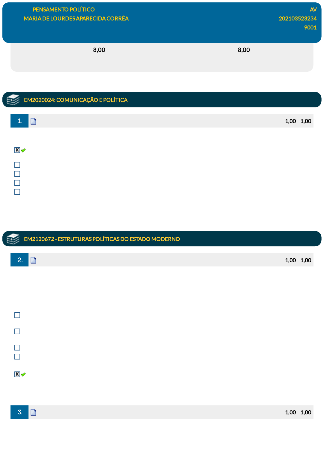 03/05/2024, 20:22 EPS https://simulado.estacio.br/alunos/ 1/5 Disciplina: PENSAMENTO POLÍTICO AV Aluno: MARIA DE LOURDES APARECIDA CORRÊA 202103523234 Turma: 9001 DGT0888_AV_202103523234 (AG) 19/01/2024 15:40:07 (F) Avaliação: 8,00 pts Nota SIA: 8,00 pts Estação de trabalho liberada pelo CPF 46363778859 com o token 699459 em 19/01/2024 09:42:52. EM2020024: COMUNICAÇÃO E POLÍTICA Ref.: 5415614 Pontos: 1,00 / 1,00 Qual das respostas abaixo compreende às quatro fontes de origem das democracias contemporâneas? O ideal grego de democracia, a tradição republicana clássica e moderna, a instituição da representatividade e a lógica da igualdade. As instituições gregas, romanas e republicanas de Veneza e Florença. A tradição iluminista nega a tradição grega, criando uma nova forma de pensar. A tradição grega, romana, renascentista e a americana que inventaram a democracia moderna. As instituições da democracia grega, a ideia romana de república, as eleições por voto e o direito de liberdade de expressão. EM2120672 - ESTRUTURAS POLÍTICAS DO ESTADO MODERNO Ref.: 5388371 Pontos: 1,00 / 1,00 (Universidade Federal da Fronteira Sul - Processo Seletivo) O Estado tem sido de�nido como um conjunto de instituições políticas, jurídicas e administrativas com jurisdição sobre a população de um país. Hegel sugeria que o estado seria uma criação racional, representando a ¿coletividade social¿. Essa concepção foi rejeitada por Marx e Engels, que concebiam o Estado como: Um instrumento essencial de dominação popular, estando acima dos con�itos de classe, com interesses legítimos de dominação comum. Um instrumento que molda a sociedade; ele existe antes da sociedade, ou seja, ele é não histórico, transcende a sociedade. Como curador da sociedade, ou seja, aquele que zela pelos interesses de outra pessoa ou instituição. Um instrumento capaz de manter a ordem natural da sociedade, colaborando para o bem comum de diferentes classes sociais. Um instrumento que serve aos interesses da classe dominante em qualquer sociedade. Não é o Estado que molda a sociedade, mas a sociedade que molda o Estado pelo modo de produção. Ref.: 5388361 Pontos: 1,00 / 1,00 (Questão extraída do ENADE-2017 - Ciências Sociais (Bacharelado)) Enquanto no pacto hobbesiano, visando a preservação de vidas em uma guerra de lobos, os indivíduos transferiam a um terceiro (homem ou assembleia) a força coercitiva da comunidade, trocando voluntariamente a sua liberdade pela segurança do Estado leviatã; no pacto lockeano, os indivíduos concordavam livremente em formar a sociedade civil para preservar e consolidar ainda mais os direitos que possuíam originalmente no estado de natureza (como os direitos à vida, à liberdade, à propriedade). Ou seja, a teoria do contrato social, que funda o Estado Moderno, joga o javascript:alert('C%C3%B3digo%20da%20quest%C3%A3o:%205415614.'); javascript:alert('C%C3%B3digo%20da%20quest%C3%A3o:%205415614.'); javascript:alert('C%C3%B3digo%20da%20quest%C3%A3o:%205388371.'); javascript:alert('C%C3%B3digo%20da%20quest%C3%A3o:%205388371.'); javascript:alert('C%C3%B3digo%20da%20quest%C3%A3o:%205388361.'); javascript:alert('C%C3%B3digo%20da%20quest%C3%A3o:%205388361.'); 03/05/2024, 20:22 EPS https://simulado.estacio.br/alunos/ 2/5 indivíduo para antes da sociedade política, atribuindo-lhe direitos individuais, direitos esses desconhecidos dos gregos e romanos. ODON, Tiago. Democracia liberal e direitos individuais: a epistemologia jurídica por trás do Estado Moderno. Revista de Informação Legislativa, Brasília, v.44, n.175, 2007 (adaptado). Considerando o que se a�rma no texto apresentado e as ideias de Hobbes e de Locke acerca do tema tratado, assinale a opção correta. Nas teorias contratualistas, os direitos à liberdade e à propriedade são consequências do Estado civil. No Estado hobbesiano, a segurança é garantida pelos próprios indivíduos, que abriram mão de sua liberdade ao aderirem ao pacto. Nas teorias contratualistas, a�rma-se a existência de direitos originários dos indivíduos, cuja manutenção é assegurada pelo pacto social. O pacto lockeano é realizado entre indivíduos que temem perder seu direito à vida, à liberdade e à propriedade. Tanto no pacto hobbesiano quanto no lockeano, o contrato social tem como �nalidade principal a preservação da vida e da segurança dos indivíduos em ambiente social. EM2120673 - IDEOLOGIAS POLÍTICAS E SEUS REFLEXOS NO ESTADO Ref.: 5299056 Pontos: 1,00 / 1,00 O �lósofo inglês John Locke �gura nos manuais de Filoso�a como o pai do liberalismo. Assinale, entre as alternativas abaixo, aquela que de�ne de maneira correta o pensamento de Locke e que justi�ca sua classi�cação como um pensador liberal. Locke era defensor da teoria da origem divina do poder real, que tratava o Estado como manifestação de uma razão superiora, acima da sociedade civil. Como o liberalismo é fundado na teocracia política, Locke foi consagrado como pai do ideário liberal. Locke era defensor das liberdades individuais e esteve preocupado em �xar limites para a atuação do Estado. Como o liberalismo é fundado no princípio que diz serem inalienáveis as liberdades individuais, Locke foi consagrado como pai do ideário liberal. Locke era defensor do projeto positivista de plani�cação da sociedade pela racionalidade cientí�ca. Como o liberalismo é fundado no princípio que diz ser a racionalidade cientí�ca o motor do progresso humano, Locke foi consagrado como pai do ideário liberal. Locke era defensor da teoria naturalista do poder político, segundo a qual o Estado se origina da manifestação da natureza, cujo objetivo é a harmonizar os assuntos humanos. Com o liberalismo é fundado no naturalismo, Locke foi consagrado como pai do ideário liberal. Locke era defensor da teoria materialista, segundo a qual o Estado é o resultado da dominação da burguesia sobre o proleta
