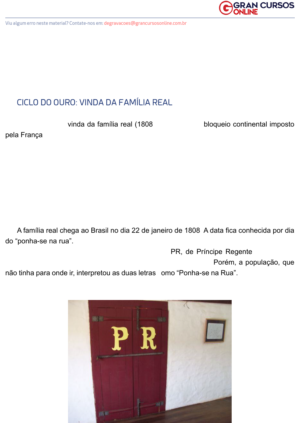 1www.grancursosonline.com.br Viu algum erro neste material? Contate-nos em: degravacoes@grancursosonline.com.br Organização Político-Administrativa do Brasil – Divisão Política e Regional III GEOGRAFIA DA BAHIA ORGANIZAÇÃO POLÍTICO-ADMINISTRATIVA DO BRASIL – DIVISÃO POLÍTICA E REGIONAL III Em continuidade ao estudo da formação territorial do Brasil, será estudada agora a vinda da família real ao Brasil. CICLO DO OURO: VINDA DA FAMÍLIA REAL Antecedentes: vinda da família real (1808) em função do bloqueio continental imposto pela França. Lembre-se de que existe uma grande rivalidade entre franceses e ingleses, A França, possuía, à época, o maior exército e a Inglaterra, a maior marinha mercante. Os franceses resolvem pressionar o governo português: se Portugal não rompesse os acordos comerciais que tinham com os ingleses, haveria invasão através de terras por parte do exército francês. Por outro lado, os ingleses também pressionavam Portugal: se houvesse a ruptura, a marinha mercante inglesa tomaria atitudes extremamente drásticas em relação ao governo português. Tendo de tomar partido, Portugal escolhe a Inglaterra, e os navios ingleses escoltam a família real portuguesa, que chega ao Brasil em 22 de janeiro de 1808. A família real chega ao Brasil no dia 22 de janeiro de 1808. A data fica conhecida por dia do “ponha-se na rua”. Antes da chegada da família real, as melhores moradias que existiam no Brasil colocaram, em suas portas, duas letras: PR, de Príncipe Regente – seria uma oportunidade de fornecer moradia a um membro da família real. Porém, a população, que não tinha para onde ir, interpretou as duas letras como “Ponha-se na Rua”. Foi um momento, portanto, de grande conturbação social. “Príncipe Regente” ou “Ponha-se na Rua” www.grancursosonline.com.br freal Realce freal Realce freal Realce freal Realce freal Realce freal Realce freal Realce freal Realce 2www.grancursosonline.com.br Viu algum erro neste material? Contate-nos em: degravacoes@grancursosonline.com.br Organização Político-Administrativa do Brasil – Divisão Política e Regional III GEOGRAFIA DA BAHIA A N O TA ÇÕ E S • D. João Bragança era o rei de Portugal, uma vez que D. Maria I estava afastada desde 1792 por problemas mentais. • D. João Bragança promoveu uma série de transformações com a chegada da família real, entre elas a criação do Banco do Brasil, da Biblioteca Nacional do Rio de Janeiro; a faculdade de medicina e o jardim botânico do Rio de Janeiro. • A principal medida adotada para a família real foi a abertura dos portos às nações amigas (entre elas, a Inglaterra) em 28 de janeiro de 1808. – A abertura dos portos abriu precedente perigoso para a emancipação do Brasil, construída em 1815, com a elevação à condição de Reino Unido a Portugal e Algar- ves e, no ano de 1822, o grito do Ipiranga “Independência ou Morte” por D. Pedro I. Entre as principais consequências do Tratado de Abertura dos Portos às Nações Amigas de Portugal, podemos citar: • Fim do Pacto Colonial; • Criação do Banco do Brasil; • Criação do primeiro jornal de grande circulação brasileira, a Gazeta do Rio de Janeiro; • Instalação da Real Biblioteca portuguesa no Brasil, situada no Rio de Janeiro. O Brasil, que ainda era uma colônia (com a função de ser uma economia complementar à da metrópole, enriquecendo esta), ao promover a abertura dos portos às nações amigas, rompeu com o pacto que estabelecia a relação entre a metrópole e sua colônia (relação do exclusivo metropolitano e do pacto colonial). 10m www.grancursosonline.com.br freal Realce freal Realce freal Realce freal Realce freal Realce freal Realce freal Realce freal Realce freal Realce freal Realce 3www.grancursosonline.com.br Viu algum erro neste material? Contate-nos em: degravacoes@grancursosonline.com.br Organização Político-Administrativa do Brasil – Divisão Política e Regional III GEOGRAFIA DA BAHIA A N O TA ÇÕ E S Ao comercializar com o Brasil as nações tinham tarifas alfandegárias distintas. Por exemplo, no comércio com Portugal, a tarifa adotada era de 16%; no comércio com a Inglaterra, a tarifa era de 15%; e no comércio com outras nações, a tarifa era aproximadamente 24%. No momento em que houve a abertura dos portos, e o rompimento do pacto colonial, estabeleceram-se condições, inclusive, para o desenvolvimento industrial. Este desenvolvimento fortaleceu o sentimento de nacionalismo e culminou no processo de emancipação do Brasil, em 7 de setembro de 1822. TRATADO DE COOPERAÇÃO E AMIZADE – TRATADO DE 1810 • Foi um acordo que consistia em estabelecer uma taxa de 15% para os britânicos, 16% para Portugal e de 24% para os demais países. Obs.: Posteriormente, houve o estabelecimento de apenas duas taxas: de 15% (Inglaterra) e 16% (Portugal e outras nações). • 1815 – o Brasil foi elevado à condição de Reino Unido a Portugal e Algarves. Este fato levou a grande insatisfação por parte de membros da elite portuguesa em Lisboa. • Alguns historiadores defendem, que este acontecimento foi o início do processo de independência do Brasil, que aconteceria poucos anos depois, em 1822. A elevação do Brasil à condição de Reino Unido a Portugal e Algarves acabou por instigar a elite portuguesa na metrópole. • 1820 – a população portuguesa exigiu o retorno de D. João VI a Lisboa, na revolução do Porto. Revolução do Porto • Ocorrida na cidade do Porto, caracterizou-se por intensas disputas políticas envolvendo interesses divergentes entre Portugal e Brasil (a instalação da administração do império português na cidade do Rio de Janeiro teria sido prejudicial à Portugal). • Com receio de perder o trono português, Dom João VI retornou à Lisboa, deixando seu filho Dom Pedro I no Governo do Brasil, para evitar qualquer tentativa de recolonização do Brasil. 20m www.grancursosonline.