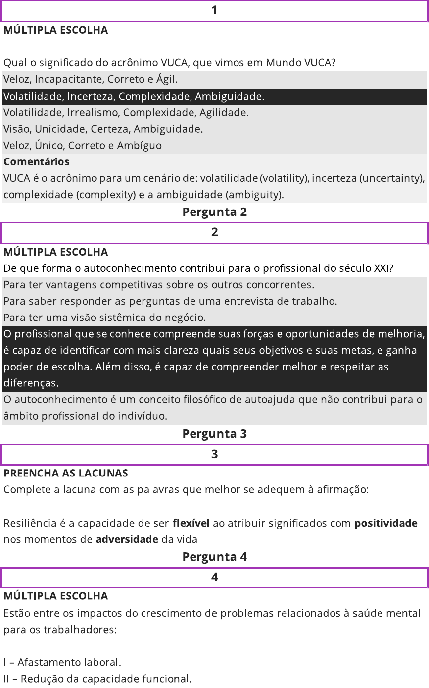 1 MÚLTIPLA ESCOLHA Qual o significado do acrônimo VUCA, que vimos em Mundo VUCA? Veloz, Incapacitante, Correto e Ágil. Volatilidade, Incerteza, Complexidade, Ambiguidade. Volatilidade, Irrealismo, Complexidade, Agilidade. Visão, Unicidade, Certeza, Ambiguidade. Veloz, Único, Correto e Ambíguo Comentários VUCA é o acrônimo para um cenário de: volatilidade (volatility), incerteza (uncertainty), complexidade (complexity) e a ambiguidade (ambiguity). Pergunta 2 2 MÚLTIPLA ESCOLHA De que forma o autoconhecimento contribui para o profissional do século XXI? Para ter vantagens competitivas sobre os outros concorrentes. Para saber responder as perguntas de uma entrevista de trabalho. Para ter uma visão sistêmica do negócio. O profissional que se conhece compreende suas forças e oportunidades de melhoria, é capaz de identificar com mais clareza quais seus objetivos e suas metas, e ganha poder de escolha. Além disso, é capaz de compreender melhor e respeitar as diferenças. O autoconhecimento é um conceito filosófico de autoajuda que não contribui para o âmbito profissional do indivíduo. Pergunta 3 3 PREENCHA AS LACUNAS Complete a lacuna com as palavras que melhor se adequem à afirmação: Resiliência é a capacidade de ser flexível ao atribuir significados com positividade nos momentos de adversidade da vida Pergunta 4 4 MÚLTIPLA ESCOLHA Estão entre os impactos do crescimento de problemas relacionados à saúde mental para os trabalhadores: Afastamento laboral. II - Redução da capacidade funcional.III - Queda na produtividade. IV - Respeito e inclusão social. III estão corretas. Apenas III está correta. e IV estão corretas. Apenas está correta. Apenas IV está correta. Comentários De acordo com Ribeiro et al. (2019), no início dos anos 2000, a Organização Mundial da Saúde (OMS) e a Organização Internacional do Trabalho (OIT) previram o crescimento da incidência de problemas relacionados à saúde mental e alertaram sobre o impacto desse aumento na população trabalhadora: queda de produtividade, afastamento laboral, redução da capacidade funcional e de trabalho, exclusão social e estigmatização de trabalhadores.
