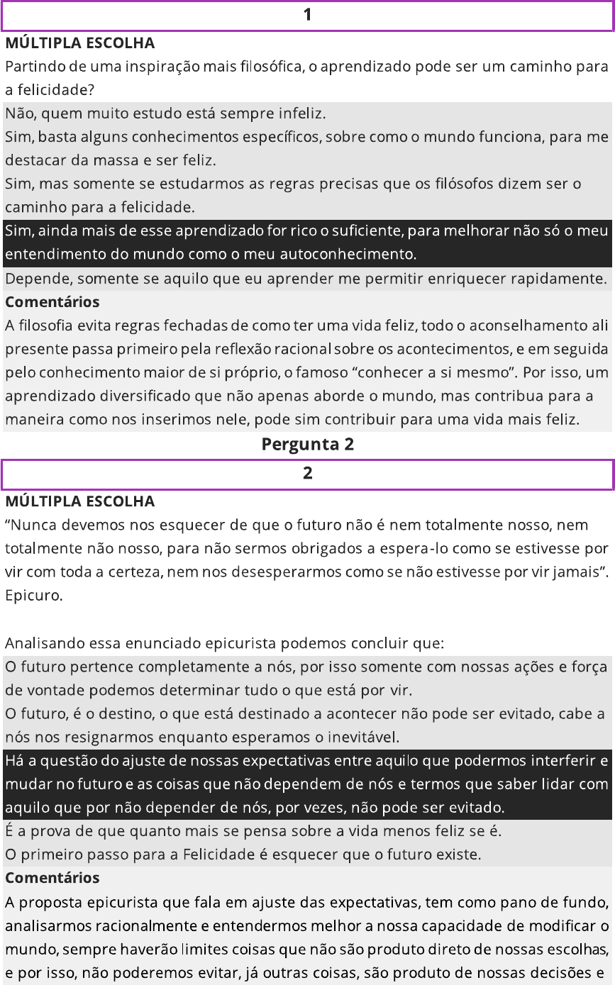 1 MÚLTIPLA ESCOLHA Partindo de uma inspiração mais filosófica, o aprendizado pode ser um caminho para a felicidade? Não, quem muito estudo está sempre infeliz. Sim, basta alguns conhecimentos específicos, sobre como o mundo funciona, para me destacar da massa e ser feliz. Sim, mas somente se estudarmos as regras precisas que os filósofos dizem ser o caminho para a felicidade. Sim, ainda mais de esse aprendizado for rico suficiente, para melhorar não só meu entendimento do mundo como O meu autoconhecimento. Depende, somente se aquilo que eu aprender me permitir rapidamente. Comentários A filosofia evita regras fechadas de como ter uma vida feliz, todo o aconselhamento ali presente passa primeiro pela reflexão racional sobre os acontecimentos, e em seguida pelo conhecimento maior de si próprio, o famoso "conhecer a si mesmo". Por isso, um aprendizado diversificado que não apenas aborde o mundo, mas contribua para a maneira como nos inserimos nele, pode sim contribuir para uma vida mais feliz. Pergunta 2 2 MÚLTIPLA ESCOLHA "Nunca devemos nos esquecer de que o futuro não é nem totalmente nosso, nem totalmente não nosso, para não sermos obrigados a espera-lo como se estivesse por vir com toda a certeza, nem nos desesperarmos como se não estivesse por vir jamais". Epicuro. Analisando essa enunciado epicurista podemos concluir que: O futuro pertence completamente a nós, por isso somente com nossas ações e força de vontade podemos determinar tudo o que está por vir. O futuro, é o destino, o que está destinado a acontecer não pode ser evitado, cabe a nós nos resignarmos enquanto esperamos inevitável. Há a questão do ajuste de nossas expectativas entre aquilo que podermos interferir e mudar no futuro e as coisas que não dependem de nós e termos que saber lidar com aquilo que por não depender de nós, por vezes, não pode ser evitado. É a prova de que quanto mais se pensa sobre a vida menos feliz se é. O primeiro passo para a Felicidade é esquecer que o futuro existe. Comentários A proposta epicurista que fala em ajuste das expectativas, tem como pano de fundo, analisarmos racionalmente e entendermos melhor a nossa capacidade de modificar o mundo, sempre haverão limites coisas que não são produto direto de nossas escolhas, e por isso, não poderemos evitar, já outras coisas, são produto de nossas decisões eações e por isso dependem principalmente de nós mesmos, há um maior empoderamento de nós mesmos quando evitamos misturar ambas as coisas. Nem para deixarmos de aquilo que podemos caso julguemos ser necessário nem se mortificar por mesmo por vezes não concordando com coisas que escapam completamente do nosso controle Pergunta 3 3 MÚLTIPLA ESCOLHA A Felicidade do ponto de vista filosófico é: Uma conquista que somente se consegue na velhice. Uma conquista permitida apenas ao jovens. Algo que não é evidente, daí a busca e a reflexão. Algo impossível de ser conquistado. Algo que perdemos ao aprendermos sobre o mundo Comentários A Felicidade, em filosofia, está na maior parte das vezes associada com a procura da mesma utilizando nossa capacidade reflexiva, para por exemplo, conhecermos melhor nós mesmos. Pergunta 4 4 MÚLTIPLA ESCOLHA "Não devemos estragar o que está presente pelo desejo do que está ausente, mas ponderar que também as coisas presentes foram antes desejadas". Epicuro. Fazendo uma reflexão sobre esse enunciado, podemos concluir que: Tudo aquilo que é presente perdeu valor no momento que fixarmos nossa próxima meta. Não há correlação entre o presente e o passado. É preciso valorizar mais as conquistas que se obteve no presente, pois elas também foram resultados de muito empenho. Se queremos realmente ter sucesso e felicidade devemos focar em tudo aquilo que ainda nos falta. Ponderar sobre o Tempo, o que desejamos passado, e que temos presente simplesmente estraga nossa felicidade, pois tomamos consciência de tudo que ainda nos falta. Comentários Manter-se num caminho é tão importante quando sobre o trajeto percorrido até agora. Sempre poderemos fixar novas metas, ter novos sonhos, mas o fato de não termos esses projetos ainda realizados, não deve diminuir o nosso próprio reconhecimento de tudo que foi alcançado até o momento, pois, no passado, o que foiconquistado hoje também foi no passado apenas projeto, esperança, sonho. Isso pode ser motivação para os desafios que ainda virão.