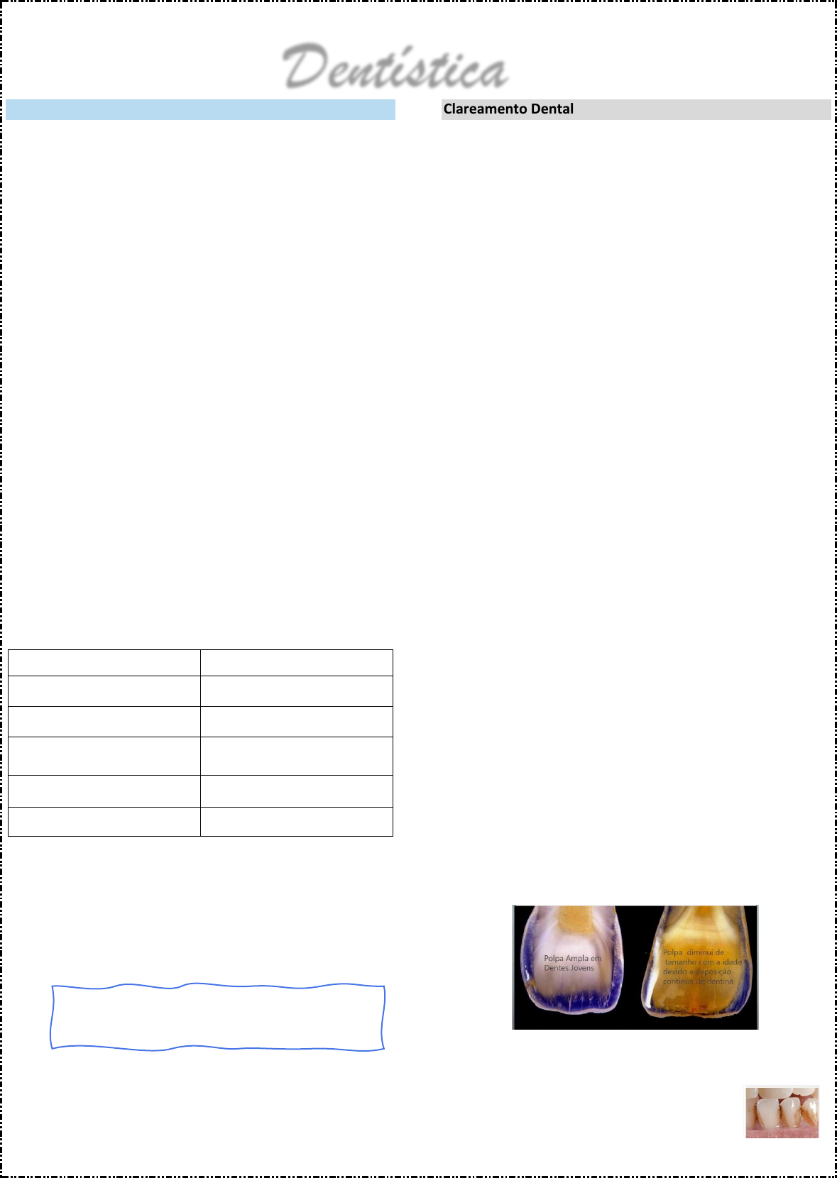 Introdução a Dentística Dentística é a especialidade que busca devolver ao dente integridade anatômica, funcional e estética, por meio de procedimentos educativos, preventivos, operatórios e terapêuticos. A atuação em Dentística é extremamente abrangente e deve estar em fases de prevenção, restauração e manutenção nos pilares de saúde, função e estética. RESINAS COMPOSTAS possibilitam restaurar forma e função, pois possui excelente estética e resistência. Procedimentos mais comuns na Dentística • Prevenção e manutenção da saúde; • Terapêutica de lesões de cárie; • Restaurações diretas e indiretas; • Clareamento; • Colagem de fragmentos dental; • Lesões não cariosas; • Micro abrasão; • Laminados cerâmicos; Equilíbrio → função, saúde e estética Planejar tratamentos através da inter-relação entre diferentes áreas é fundamental. Versão tradicional Versão atual Cirúrgico restaurador Promoção de saúde Forma mecanizada Minimamente invasivo Novas cáries em dente já tratados Manter estrutura: forma, função e estética Maior desgaste dental Odontologia adesiva Tratamento fracassou Excelência nas restaurações A mídia tem grande poder na estética em uma sociedade extremamente competitiva → Grande demanda estética Aumento significativo de lesões não cariosas (LNC), sem envolvimento de bactérias. Clareamento Dental O clareamento dental é uma técnica não invasiva que permite melhorar a estética do sorriso através de gel clareador. O escurecimento do sorriso além de comprometer a estética, também interfere negativamente na beleza e autoestima do paciente. Tratamento estético simples, eficaz, rápido, não invasivos e seguro para alteração de cor dos dentes Para alcançar o potencial máximo da prática clareadora, minimizar os efeitos adversos o dentista deve conhecer os produtos e técnicas clareadoras, além das reações. Histórico 1989, Haywood e Heymann descreveram a técnica de clareamento dental caseiro, com o uso de moldeira individual de polietileno com peróxido de carbamida. Os materiais clareadores possuem diferenças: pH, concentração de peróxido, viscosidade e presença de carbopol ou não. CARBOPOL aumenta o tempo de liberação de oxigênio, aumentando a eficácia do clareador. ÍONS DE CALCIO E FLUORETO neutralizam o efeito desmineralizante, o cálcio inibe a saída de cálcio do dente. O clareamento é um procedimento terapêutico que permite a remoção do escurecimento, NÃO altera a forma original dos dentes. Etiologia das alterações de cores As alterações de cor do dente podem ocorrer de fatores fisiológicos, extrínsecos ou intrínsecos. FATORES FISIOLÓGICOS escurecimento natural dos dentes, pelo desgaste natural e progressivo causado pela idade, possui bom prognóstico. FATORES EXTRÍNSECOS agentes externos que mancham ou danificam a estrutura dentária, oriundo da dieta e hábitos. Normalmente são manchas superficiais Dentística Síndrome do Envelhecimento Precoce Bucal boca envelhece mais rápido que o corpo! boca envelhece mais rápido que o corpo! FATORES INTRÍNSECOS agentes pigmentantes na superfície interna do dente, pode ser classificada como: • Congênitas: relacionada com a formação dos dentes. • Adquiridas: trauma dental, necrose pulpar, materiais restauradores. Doenças sistêmicas podem interferir na alteração dental, como eritoblastose fetal (incompatibilidade sanguínea entre mãe e filho) e icterícia grave (amarelão, excesso de bilirrubina) Outro fator causador de manchas intrínsecas é o antibiótico tetraciclina. Pigmentos intrínsecos são removidos por clareamento ou por procedimentos mais invasivos, com desgastes e restaurações diretas ou indiretas. FLUOROSE → clareamento + micro abrasão Antes do clareamento deve se pensar na prevenção de um envelhecimento precoce dos dentes, que aparente sorriso mais velho que a idade real do paciente! Mecanismo de ação O mecanismo de ação ocorre por meio da reação de oxido redução, fragmentam macromoléculas escuras em moléculas menores, resultando dentes mais claros. O efeito clareador ocorre com a degradação de moléculas complexas de alto peso molecular (cromóforos), resultando em moléculas menos complexas gerando uma diminuição ou eliminação do pigmento dental. Os mecanismos de ação dos clareadores são semelhantes, ambos o agente ativo é o peróxido de hidrogênio. • Peróxido de carbamida se decompõe em peróxido de hidrogênio (3%) e ureia (7%). o Ureia converte em amônia e dióxido de carbono. • Peróxido de Hidrogênio transforma-se em água e oxigênio. Não se trata de uma eliminação ou limpeza, é uma transformação molecular! Classificação Quanto a condição do dente: • Dente vital • Dente não vital (tratamento de canal) Quanto à técnica: • Clareamento caseiro supervisionado; • Clareamento de consultório; • Associação de clareamento caseiro/consultório; • Clareamento Interno (dentes não vitais). Clareamento dental A autoconfiança e o bem-estar psicológico aumentam em pacientes após procedimentos de clareamento. O escurecimento de dentes sem vida são situações recorrentes, principalmente em dentes anteriores. Peróxido de Hidrogênio (H2O2) Ingrediente ativo, forma mais pura ou direta do agente clareador não precisa de nenhum outro elemento para agir. Liquido ou gel, + comum em gel pois permite melhor controle da aplicação. • Concentração de 4-10% - Clareamento caseiro; • Concentração 35-40% - Clareamento de consultório. Utilizado em dentes vitais e não vitais Peróxido de carbamida (CH4N2O-H2O2) Uso em moldeiras, em dentes vitais e não vitais • Concentração 10-22% Clareamento caseiro • Concentração 35% Clareamento de consultório Descoberto por acidente, inicialmente era utilizado como antisséptico oral em pacientes com aparelhos ortodônticos e apresentavam traumas e casos de inflamação (gengivite)