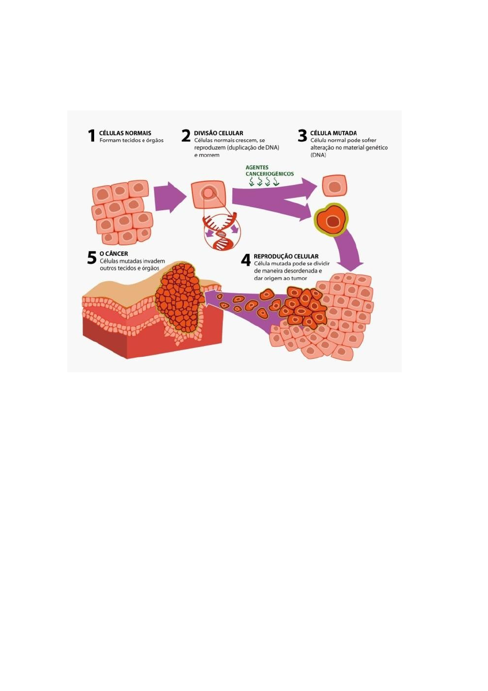 Câncer Câncer é um termo que abrange mais de 100 diferentes tipos de doenças malignas que têm em comum o crescimento desordenado de células, que podem invadir tecidos adjacentes ou órgãos a distância. Dividindo-se rapidamente, estas células tendem a ser muito agressivas e incontroláveis, determinando a formação de tumores, que podem espalhar-se para outras regiões do corpo. Os diferentes tipos de câncer correspondem aos vários tipos de células do corpo. Quando começam em tecidos epiteliais, como pele ou mucosas, são denominados carcinomas. Se o ponto de partida são os tecidos conjuntivos, como osso, músculo ou cartilagem, são chamados sarcomas. Outras características que diferenciam os diversos tipos de câncer entre si são a velocidade de multiplicação das células e a capacidade de invadir tecidos e órgãos vizinhos ou distantes, conhecida como metástase. Exemplos de cânceres, tipos de células e tecidos afetados · Carcinoma basocelular, o tipo mais comum de tumor na pele; · Melanoma, originado dos melanócitos, células com pigmento ativadas pela luz solar; · Hepatocarcinoma, o câncer mais comum do parênquima hepático; · Hepatoblastoma, uma malignidade decorrente de células precursoras primitivas do fígado; · Sarcomas, que começam no osso, cartilagem, gordura, músculo, vasos sanguíneos ou outro tecido conjuntivo; · Leucemias, que começam no tecido que produz o sangue, como a medula óssea; · Linfomas e Mielomas, que começam nas células do sistema imunológico; · Retinoblastoma, tumor maligno em um ou ambos os olhos que acomete a retina; · Câncer colorretal, surge a partir de uma célula do revestimento do intestino ou reto; · Adenocarcinoma é um câncer maligno que se origina em tecidos glandulares epiteliais, responsáveis por secreções. Características das células cancerígenas Proliferação Multiplicam-se sem limites, formando tumores Invasão Invadem tecidos adjacentes ou órgãos distantes Metástase Desprendem-se do tumor e migram para outros tecidos Imortalidade replicativa Não morrem e continuam a se dividir Resistência à apoptose Resistem à morte celular programada Sinalização proliferativa Sustentam a proliferação Insensibilidade a supressores de crescimento Não respondem a "avisos" para parar de crescer Escapar da vigilância imunológica Evitam ser detectadas e/ou destruídas pelo sistema imunológico Reprogramação do metabolismo energético Reprogramaram o seu metabolismo energético image1.jpeg