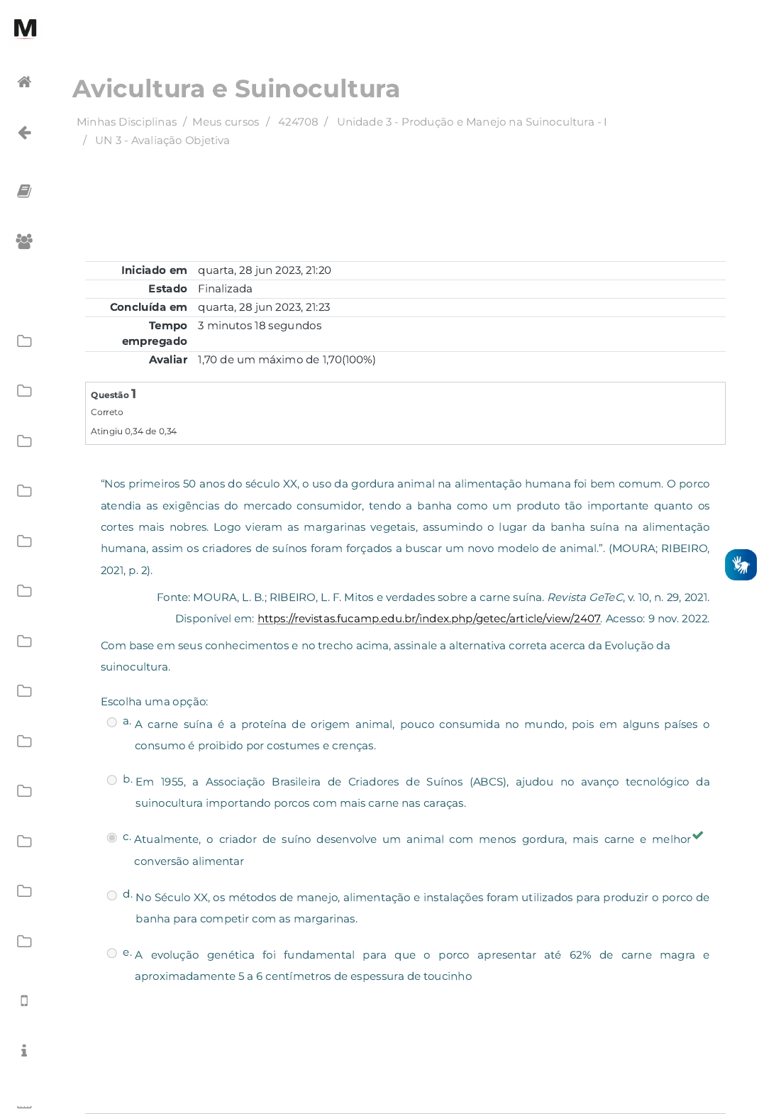 Minhas Disciplinas / Meus cursos / 424708 / Unidade 3 - Produção e Manejo na Suinocultura - I / UN 3 - Avaliação Objetiva Avicultura e Suinocultura Iniciado em quarta, 28 jun 2023, 21:20 Estado Finalizada Concluída em quarta, 28 jun 2023, 21:23 Tempo empregado 3 minutos 18 segundos Avaliar 1,70 de um máximo de 1,70(100%) Questão 1 Correto Atingiu 0,34 de 0,34 “Nos primeiros 50 anos do século XX, o uso da gordura animal na alimentação humana foi bem comum. O porco atendia as exigências do mercado consumidor, tendo a banha como um produto tão importante quanto os cortes mais nobres. Logo vieram as margarinas vegetais, assumindo o lugar da banha suína na alimentação humana, assim os criadores de suínos foram forçados a buscar um novo modelo de animal.”. (MOURA; RIBEIRO, 2021, p. 2). Fonte: MOURA, L. B.; RIBEIRO, L. F. Mitos e verdades sobre a carne suína. Revista GeTeC, v. 10, n. 29, 2021. Disponível em: https://revistas.fucamp.edu.br/index.php/getec/article/view/2407. Acesso: 9 nov. 2022. Com base em seus conhecimentos e no trecho acima, assinale a alternativa correta acerca da Evolução da suinocultura. Escolha uma opção: a. A carne suína é a proteína de origem animal, pouco consumida no mundo, pois em alguns países o consumo é proibido por costumes e crenças. b. Em 1955, a Associação Brasileira de Criadores de Suínos (ABCS), ajudou no avanço tecnológico da suinocultura importando porcos com mais carne nas caraças. c. Atualmente, o criador de suíno desenvolve um animal com menos gordura, mais carne e melhor conversão alimentar d. No Século XX, os métodos de manejo, alimentação e instalações foram utilizados para produzir o porco de banha para competir com as margarinas. e. A evolução genética foi fundamental para que o porco apresentar até 62% de carne magra e aproximadamente 5 a 6 centímetros de espessura de toucinho https://avap.multivix.edu.br/my/ https://avap.multivix.edu.br/course/view.php?id=19976 https://avap.multivix.edu.br/course/view.php?id=19976§ion=4 https://avap.multivix.edu.br/mod/quiz/view.php?id=1304625 https://revistas.fucamp.edu.br/index.php/getec/article/view/2407 https://avap.multivix.edu.br/my/ https://avap.multivix.edu.br/course/view.php?id=19976 https://avap.multivix.edu.br/user/index.php?id=19976 https://avap.multivix.edu.br/course/view.php?id=19976§ion=1 https://avap.multivix.edu.br/course/view.php?id=19976§ion=2 https://avap.multivix.edu.br/course/view.php?id=19976§ion=3 https://avap.multivix.edu.br/course/view.php?id=19976§ion=4 https://avap.multivix.edu.br/course/view.php?id=19976§ion=5 https://avap.multivix.edu.br/course/view.php?id=19976§ion=6 https://avap.multivix.edu.br/course/view.php?id=19976§ion=7 https://avap.multivix.edu.br/course/view.php?id=19976§ion=8 https://avap.multivix.edu.br/course/view.php?id=19976§ion=9 https://avap.multivix.edu.br/course/view.php?id=19976§ion=10 https://avap.multivix.edu.br/course/view.php?id=19976§ion=11 https://avap.multivix.edu.br/course/view.php?id=19976§ion=12 https://avap.multivix.edu.br/course/view.php?id=19976§ion=13 https://avap.multivix.edu.br/hooks/portal/ https://avap.multivix.edu.br/mod/page/view.php?id=1252%2F%22%20target%3D%22_blank https://avap.multivix.edu.br/calendar/view.php/ https://avap.multivix.edu.br/ Questão 2 Correto Atingiu 0,34 de 0,34 Raças de suínos são grupos de animais com características especí�cas de exterior, tais como cor da pelagem, tipo de per�l frontonasal, de cabeça e de orelhas, criados e selecionados separadamente de outros genótipos e agrupados em registros genealógicos. Fonte: ABCS, 2014. Produção de suínos: teoria e prática. Brasília, DF: Associação Brasileira de criadores de Suínos; Coordenação técnica da Integral Soluções em Produção Animal, 2014. Considere as a�rmativas a seguir. I - Entre as raças puras criadas comercial e industrialmente no Brasil encontram-se Duroc, landrace, large White e linha sintética. II - Uma das características mais importantes da raça Pietrain é o teor de marmoreio na carne. III - Landrace apresenta pelagem branca, per�l cefálico retilíneo, orelhas do tipo céltico, grande profundidade e comprimento corporal. É correto o que se a�rma em: Escolha uma opção: a. II e III, apenas b. I e III, apenas c. I, apenas d. I e II, apenas e. III, apenas https://avap.multivix.edu.br/my/ https://avap.multivix.edu.br/course/view.php?id=19976 https://avap.multivix.edu.br/user/index.php?id=19976 https://avap.multivix.edu.br/course/view.php?id=19976§ion=1 https://avap.multivix.edu.br/course/view.php?id=19976§ion=2 https://avap.multivix.edu.br/course/view.php?id=19976§ion=3 https://avap.multivix.edu.br/course/view.php?id=19976§ion=4 https://avap.multivix.edu.br/course/view.php?id=19976§ion=5 https://avap.multivix.edu.br/course/view.php?id=19976§ion=6 https://avap.multivix.edu.br/course/view.php?id=19976§ion=7 https://avap.multivix.edu.br/course/view.php?id=19976§ion=8 https://avap.multivix.edu.br/course/view.php?id=19976§ion=9 https://avap.multivix.edu.br/course/view.php?id=19976§ion=10 https://avap.multivix.edu.br/course/view.php?id=19976§ion=11 https://avap.multivix.edu.br/course/view.php?id=19976§ion=12 https://avap.multivix.edu.br/course/view.php?id=19976§ion=13 https://avap.multivix.edu.br/hooks/portal/ https://avap.multivix.edu.br/mod/page/view.php?id=1252%2F%22%20target%3D%22_blank https://avap.multivix.edu.br/calendar/view.php/ https://avap.multivix.edu.br/ Questão 3 Correto Atingiu 0,34 de 0,34 A produção de suínos pode ser classi�cada de acordo com o grau de controle da produção em extensiva e intensiva, e a produção extensiva é de�nida pelos autores como extrativista e de subsistência, praticamente sem controle de dados e manejos. Fonte: ABCS, 2014. Produção de suínos: teoria e prática. Brasília, DF: Associação Brasileira de criadores de Suínos; Coordenação técnica da Integral Soluções em Produção Animal, 2014. 9