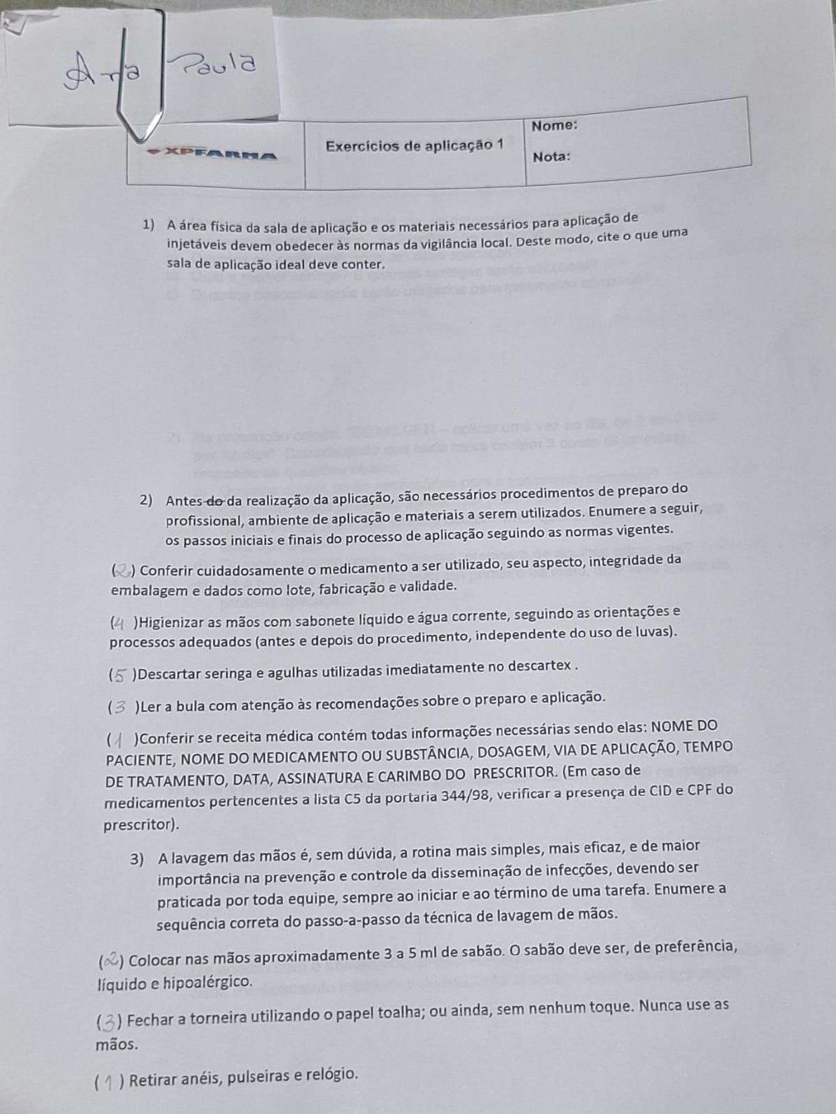 Paula Nome: Exercícios de aplicação 1 Nota: 1) A área física da sala de aplicação e os materiais necessários para aplicação de injetáveis devem obedecer às normas da vigilância local. Deste modo, cite o que uma sala de aplicação ideal deve conter. 2) Antes-do-da realização da aplicação, são necessários procedimentos de preparo do profissional, ambiente de aplicação e materiais a serem utilizados. Enumere a seguir, os passos iniciais e finais do processo de aplicação seguindo as normas vigentes. (2) Conferir cuidadosamente o medicamento a ser utilizado, seu aspecto, integridade da embalagem e dados como lote, fabricação e validade. )Higienizar as mãos com sabonete líquido e água corrente, seguindo as orientações e processos adequados (antes e depois do procedimento, independente do uso de luvas). 15 Descartar seringa e agulhas utilizadas imediatamente no descartex (3 )Ler a bula com atenção às recomendações sobre preparo e aplicação. (1 )Conferir se receita médica contém todas informações necessárias sendo elas: NOME DO PACIENTE, NOME DO MEDICAMENTO OU SUBSTÂNCIA, DOSAGEM, VIA DE APLICAÇÃO, TEMPO DE TRATAMENTO, DATA, ASSINATURA E CARIMBO DO PRESCRITOR. (Em caso de medicamentos pertencentes a lista C5 da portaria 344/98, verificar a presença de CID e CPF do prescritor). 3) A lavagem das mãos é, sem dúvida, a rotina mais simples, mais eficaz, e de maior importância na prevenção e controle da disseminação de infecções, devendo ser praticada por toda equipe, sempre ao iniciar e ao término de uma tarefa. Enumere a sequência correta do passo-a-passo da técnica de lavagem de mãos. (2) Colocar nas mãos aproximadamente 3 a 5 ml de sabão. o sabão deve ser, de preferência, líquido e (3) Fechar a torneira utilizando o papel toalha; ou ainda, sem nenhum toque. Nunca use as mãos. (1) Retirar anéis, pulseiras e relógio.Nome: Exercícios de aplicação 2 Nota: 1) Um frasco-ampola contém 5mL de um determinado medicamento, cuja concentração de Aplicar 5mg de 8/8 horas por 10 dias. a) Quantos mL serão aplicados em cada aplicação? 0,5 b) Qual a melhor seringa? E quantas seringas serão utilizadas? de c) Quantos frascos-ampola serão utilizados para tratamento completo? 150 2) Na prescrição consta: "DEXALGEN aplicar uma vez ao dia, de 2 em 2 dias por 12 dias". Considerando que cada caixa contém 3 doses (6 ampolas), responda as questões abaixo: a) Quantas caixas serão necessárias para tratamento completo? b) Cite quais locais podemos aplicar. intramuscular c) Considerando que cada ampola contém 1mL, qual a melhor seringa para essa aplicação? a adicionais? de d) Quantas seringas serão utilizadas, precisará de agulhas e) Se a primeira aplicação foi feita dia primeiro de maio, qual será a data da próxima aplicação? 4 de 3) Cite a ordem dos procedimentos para aplicação de um injetável na drogaria 4) De acordo com o treinamento prévio aplicado, cite qual a validade da receita de cada medicamento injetável e quando não deve ser realizada a aplicação.1) Qual a diferença entre fármaco e medicamentos? 2) que é forma farmacêutica e via de administração? 4) Associe a primeira coluna com a segunda: (A) Fármaco (B) Comprimido (B) Forma farmacêutica sólida (A) Prozac (C) Forma farmacêutica semi-sólida (E)Xarope (D) Medicamento Fluoxetina ativo do Prozac) (E) Forma farmacêutica líquida (C)Creme 4) A preparação farmacêutica que contém um ou mais fármacos e é destinada ao tratamento, prevenção ou diagnóstico de doenças é denominada: (a) b) remédio. c) insumo. d) droga. 5) Qual dessas formas farmacêuticas, em geral, NÃO pode ser considerada uma forma farmacêutica semi-sólida? a) pomadas. b) cápsulas. c) géis. d) e) pastas. 6) Assinale a alternativa que relaciona vias de administração enteral de medicamentos: a) oral, sublingual e retal. b) oral, intradérmica e retal.c) oral, intravenosa e d) oral e e) intravenosa, intradérmica e 7) Identifique o fármaco, a forma farmacêutica, medicamento e a via de administração dos seguintes produtos farmacêuticos: caixas contendo comprimidos revestidos para uso oral. Cada comprimido contém 25 mg de agomelatina. Fármaco: Medicamento: Forma farmacêutica: Via de administração: frasco com suspensão oral contendo 200 mg de amoxicilina por 5mL de Fármaco: Medicamento: Ameral Forma farmacêutica: Via de administração: oral Nome: MEDICAMENTOS Nota: XPFARMA 1) Quais os tipos de medicamentos disponíveis no Brasil? 2) Qual a diferença entre um medicamento alopático, um fitoterápico e um homeopático? 3) Qual a diferença entre um medicamento de referência, um medicamento genérico e um medicamento similar? 4) o medicamento que contém o mesmo ou os mesmos princípios ativos, apresenta a mesma concentração, forma farmacêutica, via de administração, posologia e indicaçãoterapêutica, preventiva ou diagnóstica, do medicamento de referência registrado no órgão federal responsável pela vigilância sanitária, podendo diferir somente em características relativas ao tamanho e forma do produto, prazo de validade, embalagem, rotulagem excipientes e devendo sempre ser identificado por nome comercial ou marca, é denominado de: a) similar; b) c) comercial; d) referência; e) longitudinal. 5) Contém o mesmo ou os mesmos ativos, apresenta a mesma concentração, forma farmacêutica, via de administração, posologia e indicação terapêutica, preventiva ou diagnóstica, do medicamento de referência registrado no órgão federal responsável pela vigilância sanitária, podendo diferir somente em características relativas ao tamanho e forma do produto, prazo de validade, embalagem, rotulagem, excipientes e veículos, devendo sempre ser identificado por nome do principio ativo. Tais informações referem-se a) medicamento inovador b) medicamento similar c) medicamento genérico d) medicamento 6) Os medicamentos a seguir são todos utilizados como an