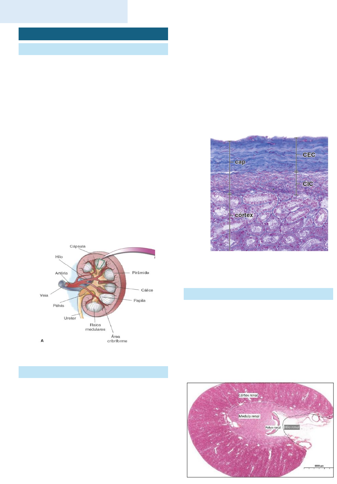 Anderson Matheus de Oliveira Amaral Santana Medicina -UFAL HISTOLOGIA DO SISTEMA URINÁRIO RINS – ESTRUTURA E LOCALIZAÇÃO • Órgãos altamente vascularizados, recebendo 25% do débito cardíaco. Estão localizados no espaço retroperitoneal • Localização: entre a 12ª vértebra torácica e a 3ª vértebra lombar. o rim direito ligeiramente mais inferior do que o esquerdo, por conta do fígado. • Possuem uma borda convexa, lateralmente, e uma borda côncava, medialmente, na qual se situa o hilo. os rins podem ser divididos em córtex e medula. • Raios medulares formados por ductos e túbulos coletores que chegam à papila renal. • Área cribiforme: contato entre a papila e a pelve renal. • Um lobo renal é formado por uma pirâmide + tecido cortical ao redor. • Um lóbulo renal é constituído por um raio medular + tecido cortical ao seu redor, delimitado pelas artérias interlobulares. • REVESTIDO POR TRÊS CAMADAS: • − Cápsula renal (fáscia renal): membrana fibrosa - condensação de tecido conjuntivo denso irregular (de sustentação, a base de fibras de colágeno − intimamente colada à superfície do rim, a qual mantem seu formato, protegendo−o. Essa cápsula também está envolta dos glomérulos renais e túbulos contorcidos • Cápsula adiposa: localizada no meio, encontra−se um tecido adiposo, a gordura perirrenal. Esta cápsula é separada em duas camadas: gordura perirrenal (conectada com o seio renal e o hilo) e gordura pararrenal (envolve a gordura perirrenal e a fáscia). Esta cápsula confere proteção contra choques. • Cápsula fibrosa (cápsula verdadeira): na posição mais interna, os rins possuem uma cápsula de tecido conjuntivo frouxo com muitos miofibroblastos, que tornam a cápsula capaz de se adaptar às constantes mudanças de pressão dentro do rim. • A glândula suprarrenal (adrenal) fica no polo superior do rim, separada dele pela gordura perirrenal. Tanto o rim quanto a glândula suprarrenal estão recobertos por uma camada de fáscia renal • Mais externamente – tecido conjuntivo denso não modelado. • Mais internamente – tecido conjuntivo frouxo + miofibroblastos (com capacidade de contratilidade). CÓRTEX é a camada externa do tecido renal (parênquima renal). Tem a coloração mais forte do que a medula porque recebe mais de 90% da vascularização renal, e contém muitos glomérulos renais e núcleos. Tem uma zona cortical, de aparência granulosa, porque contém, principalmente, as partes ovoides e contorcidas dos néfrons, isto é, os corpúsculos renais e os túbulos contorcidos proximais e distais; rico em glomérulos. E, apresenta pouco tecido conjuntivo. Anderson Matheus de Oliveira Amaral Santana Medicina -UFAL Raios medulares: região onde há partes retilíneas/ longitudinais dos túbulos. HILO RENAL é uma fenda localizada na região côncava do rim. É onde vasos sanguíneos de grande calibre entram. O sangue chega no rim, nessa região, pela artéria renal, que vai se ramificando em vasos mais delgados (finos), até que a parede desses vasos seja tão fininha que haverá a passagem de moléculas, por um epitélio fenestrado. − A artéria renal se ramifica nos ramos segmentares, na altura do hilo, e estas vão se ramificar em artérias interlobares, que vão permear as colunas renais (seguindo o formato das bordas das pirâmides em direção das colunas), em seguida, estas por sua vez se ramificam em artérias arqueadas, na região corticomedular. Depois, pequenas artérias intralobulares são formadas, que por fim serão ramificadas em arteríolas aferentes, que originarão capilares glomerulares (formando o glomérulo). Após passarem pelos glomérulos, as vão convergir, sendo chamados de veias interlobares, e, em seguida, se unem de novo formando a veias interlobares, num caminho inverso as artérias, formando, por fim, a veia renal. MEDULA RENAL Região mais interna do rim, composta pelas pirâmides renais. • A base das pirâmides está voltada para o córtex, enquanto o ápice, denominado papila renal, direciona-se ao hilo. • Os ductos coletores da urina desembocam nas papilas renais. • Cada papila se projeta em um cálice menor. • Os cálices menores se unem, geralmente em grupos de 2 a 4, formando os cálices maiores, que conduzem a urina para estruturas posteriores do sistema excretor. Uma pirâmide renal e o tecido cortical adjacente constituem um lobo renal. O rim é multilobar porque possui mais de um lobo. Córtex mais escuro e medula parte mais clara da imagem NÉFRON unidades funcionais do rim, sendo eles os responsáveis pela filtração do sangue e formação da urina. É constituído por corpúsculo renal (ou de Malpighi), túbulo contorcido proximal, alça de Henle (ou túbulo Anderson Matheus de Oliveira Amaral Santana Medicina -UFAL intermediário), túbulo contorcido distal e um tubo coletor. O lóbulo renal é a parte do órgão em que os CORPÚSCULO RENAL O corpúsculo renal é constituído por um aglomerado de capilares, denominado de glomérulo. O glomérulo é envolvido por uma cápsula, chamada de cápsula de Bowman. GLOMÉRULO RENAL (OU DE MALPIGHI) Unidade funcional dos rins, responsável pela filtração do sangue. Consiste em um emaranhado de capilares envoltos pela cápsula de Bowman, uma estrutura revestida por epitélio pavimentoso simples. Ao penetrar na cápsula de Bowman, a arteríola aferente se ramifica em diversas alças capilares, formando o glomérulo. Esses capilares posteriormente convergem, originando a arteríola eferente, que sai da cápsula pelo polo vascular e segue em direção à veia renal. O glomérulo é sustentado por um tecido conjuntivo rico em fibras de colágeno, que mantém sua estrutura e delimita o espaço interno da cápsula de Bowman. Quando o sangue passa pelos capilares glomerulares, a água e outras substâncias saem do sangue, atravessam as células endoteliais fenestradas (dos capilares) e caem no espaço de Bowman, de