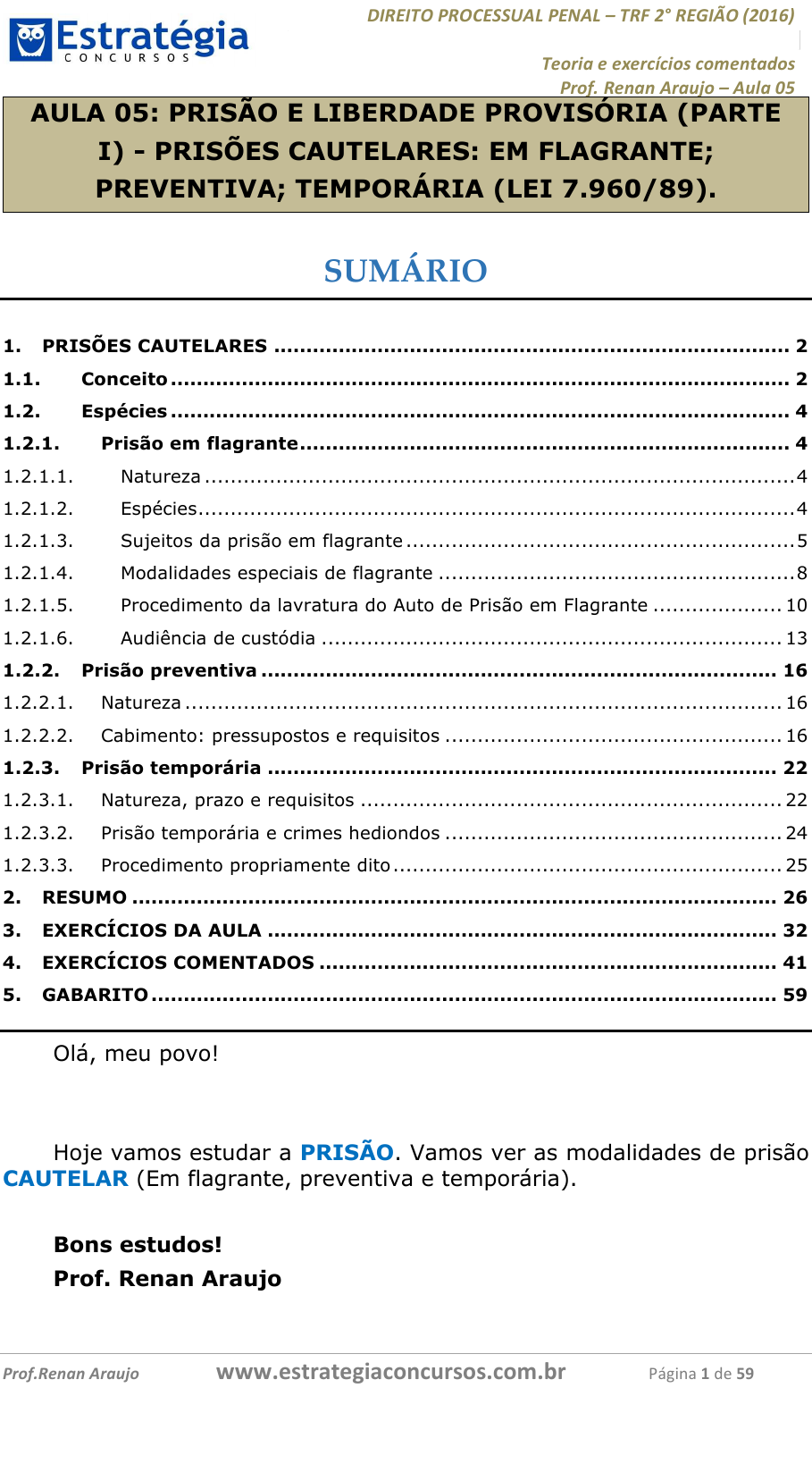 !∀#∃∀%&∋(#&)∃∗∗+,−∋(∃.,−∋/∋%#0∋12∋#∃3∀4&∋516789∋ %>?≅ΑΒ∋>∋>Χ>≅∆Ε∆Α?Φ∋∆?Γ>ΗΙΒϑ?Φ∋ (≅?ΚΛ∋#>ΗΒΗ∋,≅ΒΜΝ?∋/∋,ΜΟΒ∋6Π∋ ! ! ! ! ! ! ! ! ! (≅?ΚΛ#>ΗΒΗ∋,≅ΒΜΝ?∋∋∋∋∋∋∋∋∋∋∋∋∋∋∋∋∋∋∋∀∀∀#∃%&∋(&∃)∗(+,−+.∋%,%#+,/#0∋!!!!!!!!!!!!!!!!!!!!∀#∃%&∋!1!()!23! AULA 05: PRISÃO E LIBERDADE PROVISÓRIA (PARTE I) - PRISÕES CAUTELARES: EM FLAGRANTE; PREVENTIVA; TEMPORÁRIA (LEI 7.960/89). SUMÁRIO ! 1. PRISÕES CAUTELARES ................................................................................ 2 1.1. Conceito ................................................................................................ 2 1.2. Espécies ................................................................................................ 4 1.2.1. Prisão em flagrante ............................................................................ 4 1.2.1.1. Natureza ........................................................................................... 4 1.2.1.2. Espécies ............................................................................................ 4 1.2.1.3. Sujeitos da prisão em flagrante ............................................................ 5 1.2.1.4. Modalidades especiais de flagrante ....................................................... 8 1.2.1.5. Procedimento da lavratura do Auto de Prisão em Flagrante .................... 10 1.2.1.6. Audiência de custódia ....................................................................... 13 1.2.2. Prisão preventiva ................................................................................ 16 1.2.2.1. Natureza ............................................................................................ 16 1.2.2.2. Cabimento: pressupostos e requisitos .................................................... 16 1.2.3. Prisão temporária ............................................................................... 22 1.2.3.1. Natureza, prazo e requisitos ................................................................. 22 1.2.3.2. Prisão temporária e crimes hediondos .................................................... 24 1.2.3.3. Procedimento propriamente dito ............................................................ 25 2. RESUMO .................................................................................................... 26 3. EXERCÍCIOS DA AULA ............................................................................... 32 4. EXERCÍCIOS COMENTADOS ....................................................................... 41 5. GABARITO ................................................................................................. 59 Olá, meu povo! Hoje vamos estudar a PRISÃO. Vamos ver as modalidades de prisão CAUTELAR (Em flagrante, preventiva e temporária). Bons estudos! Prof. Renan Araujo !∀#∃∀%&∋(#&)∃∗∗+,−∋(∃.,−∋/∋%#0∋12∋#∃3∀4&∋516789∋ %>?≅ΑΒ∋>∋>Χ>≅∆Ε∆Α?Φ∋∆?Γ>ΗΙΒϑ?Φ∋ (≅?ΚΛ∋#>ΗΒΗ∋,≅ΒΜΝ?∋/∋,ΜΟΒ∋6Π∋ ! ! ! ! ! ! ! ! ! (≅?ΚΛ#>ΗΒΗ∋,≅ΒΜΝ?∋∋∋∋∋∋∋∋∋∋∋∋∋∋∋∋∋∋∋∀∀∀#∃%&∋(&∃)∗(+,−+.∋%,%#+,/#0∋!!!!!!!!!!!!!!!!!!!!∀#∃%&∋!4!()!23! 1.! PRISÕES CAUTELARES ! 1.1.! Conceito Quando falamos em “prisão”, no bojo do Direito Processual Penal, só podemos estar diante de duas espécies de medidas privativas de liberdade: Prisão pena – É uma punição que decorre da aplicação da lei penal através de uma sentença penal condenatória irrecorrível (imodificável); Prisão não-pena – Trata-se não de uma punição (pois ainda não há condenação irrecorrível), mas de uma medida de NATUREZA CAUTELAR (cautela = cuidado, a fim de se evitar um prejuízo), cuja finalidade pode ser garantir o regular desenvolvimento da instrução processual, a aplicação da lei penal ou, nos casos expressamente previstos em lei, evitar a prática de novas infrações penais. A modalidade de prisão que nos interessa, e que vamos estudar, é a prisão “não pena”, que é a prisão cuja finalidade não é punir o acusado (pois ele ainda não pode ser considerado culpado, eis que o processo ainda está tramitando, lembram-se?). Quando alguém comete uma infração penal, surge para o Estado o dever de punir (jus puniendi). Entretanto, o Estado não pode aplicar a pena, como diríamos, “à moda Bangu”, ou seja, de qualquer forma. Existe um procedimento que deve ser seguido pelo Estado previamente à aplicação da Lei Penal. Este procedimento a ser adotado pelo Estado se chama “Processo Criminal”. O processo criminal tem como finalidade garantir que o Estado aplique a Lei penal de maneira correta, no momento correto, em face da pessoa correta. Ou seja, para que o Estado não faça besteira! Tem coisa mais irritante que ouvir os “penalistas” das emissoras de TV aberta cobrando a prisão de alguém que cometeu recentemente um crime? Eu conheço poucas coisas tão irritantes quanto isto! Frases como “Mas e fulano, não está preso por quê?”, “Como é que pode, faz uma coisa dessas e não vai preso...”. Esses pseudointelectuais não sabem que existe um procedimento prévio que o Estado deve adotar para que depois possa punir uma pessoa. A prisão, antes desse momento (trânsito em julgado da sentença condenatória) é MEDIDA EXCEPCIONALÍSSIMA (Com as alterações da Lei 12.403/11, se tornou ainda mais excepcional). Se alguém pratica um crime, deve responder a um processo criminal, no qual lhe seja assegurada ampla defesa, contraditório e todos os demais direitos fundamentais, para que, ao final, o Estado possa dizer: “É, realmente foi fulano quem praticou o crime, em tais circunstâncias, por tais motivos e, por isso, lhe será aplicada tal pena”. Essa é a finalidade. Mas então porque existem pr