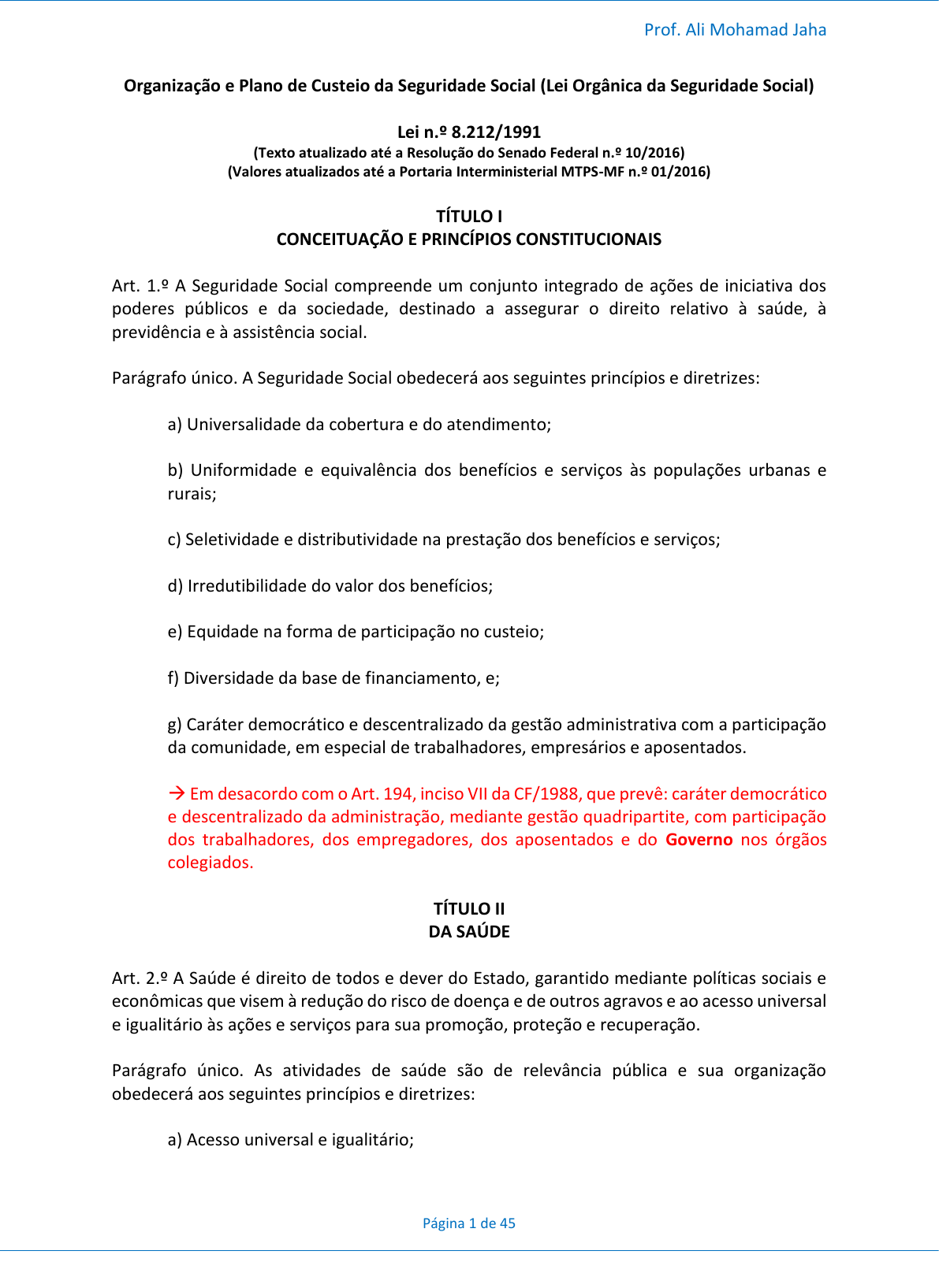 Prof. Ali Mohamad Jaha Página 1 de 45 Organização e Plano de Custeio da Seguridade Social (Lei Orgânica da Seguridade Social) Lei n.º 8.212/1991 (Texto atualizado até a Resolução do Senado Federal n.º 10/2016) (Valores atualizados até a Portaria Interministerial MTPS-MF n.º 01/2016) TÍTULO I CONCEITUAÇÃO E PRINCÍPIOS CONSTITUCIONAIS Art. 1.º A Seguridade Social compreende um conjunto integrado de ações de iniciativa dos poderes públicos e da sociedade, destinado a assegurar o direito relativo à saúde, à previdência e à assistência social. Parágrafo único. A Seguridade Social obedecerá aos seguintes princípios e diretrizes: a) Universalidade da cobertura e do atendimento; b) Uniformidade e equivalência dos benefícios e serviços às populações urbanas e rurais; c) Seletividade e distributividade na prestação dos benefícios e serviços; d) Irredutibilidade do valor dos benefícios; e) Equidade na forma de participação no custeio; f) Diversidade da base de financiamento, e; g) Caráter democrático e descentralizado da gestão administrativa com a participação da comunidade, em especial de trabalhadores, empresários e aposentados. Em desacordo com o Art. 194, inciso VII da CF/1988, que prevê: caráter democrático e descentralizado da administração, mediante gestão quadripartite, com participação dos trabalhadores, dos empregadores, dos aposentados e do Governo nos órgãos colegiados. TÍTULO II DA SAÚDE Art. 2.º A Saúde é direito de todos e dever do Estado, garantido mediante políticas sociais e econômicas que visem à redução do risco de doença e de outros agravos e ao acesso universal e igualitário às ações e serviços para sua promoção, proteção e recuperação. Parágrafo único. As atividades de saúde são de relevância pública e sua organização obedecerá aos seguintes princípios e diretrizes: a) Acesso universal e igualitário; Prof. Ali Mohamad Jaha Página 2 de 45 b) Provimento das ações e serviços através de rede regionalizada e hierarquizada, integrados em sistema único (SUS); c) Descentralização, com direção única em cada esfera de governo; d) Atendimento integral, com prioridade para as atividades preventivas; e) Participação da comunidade na gestão, fiscalização e acompanhamento das ações e serviços de saúde, e; f) Participação da iniciativa privada na assistência à saúde, obedecidos os preceitos constitucionais. TÍTULO III DA PREVIDÊNCIA SOCIAL Art. 3.º A Previdência Social tem por fim assegurar aos seus beneficiários meios indispensáveis de manutenção, por motivo de incapacidade, idade avançada, tempo de serviço, desemprego involuntário, encargos de família e reclusão ou morte daqueles de quem dependiam economicamente. Divergência: Atualmente a Previdência prevê benefício em função do tempo de contribuição. Parágrafo único. A organização da Previdência Social obedecerá aos seguintes princípios e diretrizes: a) Universalidade de participação nos planos previdenciários, mediante contribuição; b) Valor da renda mensal dos benefícios, substitutos do salário de contribuição ou do rendimento do trabalho do segurado, não inferior ao do salário mínimo; c) Cálculo dos benefícios considerando-se os salários de contribuição, corrigidos monetariamente; d) Preservação do valor real dos benefícios, e; e) Previdência complementar facultativa, custeada por contribuição adicional. TÍTULO IV DA ASSISTÊNCIA SOCIAL Art. 4.º A Assistência Social é a política social que provê o atendimento das necessidades básicas, traduzidas em proteção à família, à maternidade, à infância, à adolescência, à velhice e à pessoa portadora de deficiência, independentemente de contribuição à Seguridade Social. Parágrafo único. A organização da Assistência Social obedecerá às seguintes diretrizes: Prof. Ali Mohamad Jaha Página 3 de 45 a) Descentralização político-administrativa, e; b) Participação da população na formulação e controle das ações em todos os níveis. TÍTULO V DA ORGANIZAÇÃO DA SEGURIDADE SOCIAL Art. 5.º As ações nas áreas de Saúde, Previdência Social e Assistência Social, conforme o disposto no Capítulo II (Da Seguridade Social) do Título VIII (Da Ordem Social) da Constituição Federal, serão organizadas em Sistema Nacional de Seguridade Social, na forma desta Lei. (...) Art. 8.º As propostas orçamentárias anuais ou plurianuais da Seguridade Social serão elaboradas por Comissão integrada por 3 representantes, sendo 1 da área da saúde, 1 da área da previdência social e 1 da área de assistência social. Art. 9.º As áreas de Saúde, Previdência Social e Assistência Social são objeto de leis específicas, que regulamentarão sua organização e funcionamento. TÍTULO VI DO FINANCIAMENTO DA SEGURIDADE SOCIAL INTRODUÇÃO Art. 10. A Seguridade Social será financiada por toda sociedade, de forma direta e indireta, nos termos do Art. 195 da Constituição Federal e desta Lei, mediante recursos provenientes da União, dos Estados, do Distrito Federal, dos Municípios e de contribuições sociais. Art. 11. No âmbito federal, o orçamento da Seguridade Social é composto das seguintes receitas: I - Receitas da União; II - Receitas das contribuições sociais, e; III - Receitas de outras fontes. Parágrafo único. Constituem contribuições sociais: a) As das empresas, incidentes sobre a remuneração paga ou creditada aos segurados a seu serviço; b) As dos empregadores domésticos; c) As dos trabalhadores, incidentes sobre o seu salário de contribuição; Prof. Ali Mohamad Jaha Página 4 de 45 d) As das empresas, incidentes sobre faturamento e lucro; e) As incidentes sobre a receita de concursos de prognósticos. CAPÍTULO I DOS CONTRIBUINTES Seção I Dos Segurados Art. 12. São segurados obrigatórios da Previdência Social as seguintes pessoas físicas: I - Como empregado: a) Aquele que pres
