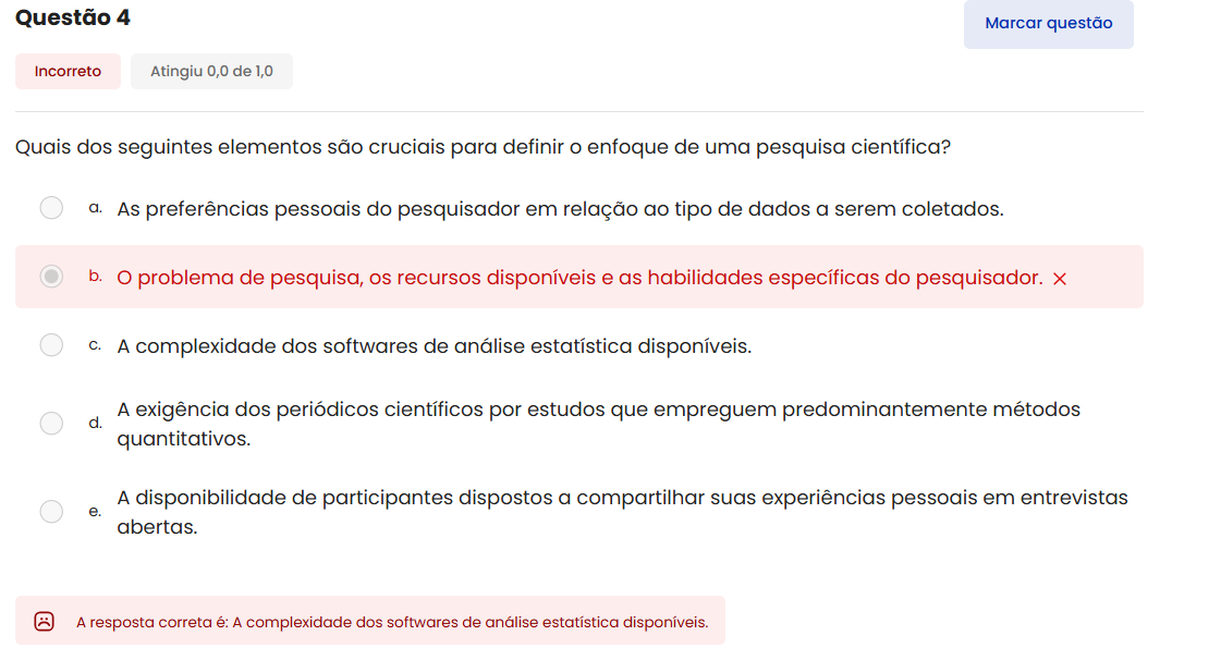 Questão 4 Marcar questão Incorreto Atingiu 0,0 de 1,0 Quais dos seguintes elementos são cruciais para definir o enfoque de uma pesquisa científica? a. As preferências pessoais do pesquisador em relação ao tipo de dados a serem coletados. b. problema de pesquisa, os recursos disponíveis e as habilidades específicas do pesquisador. C. A complexidade dos softwares de análise estatística disponíveis. A exigência dos periódicos científicos por estudos que empreguem predominantemente métodos d. quantitativos. A disponibilidade de participantes dispostos a compartilhar suas experiências pessoais em entrevistas e. abertas. A resposta correto é: A complexidade dos softwares de estatística disponíveis.