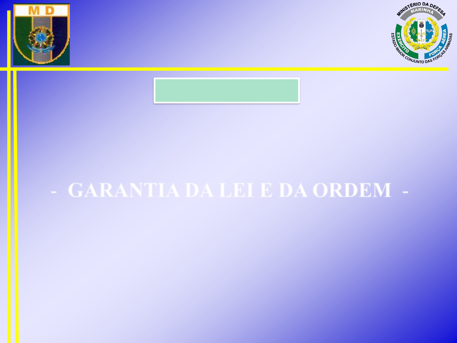 MINISTÉRIO DA DEFESA ESTADO-MAIOR CONJUNTO DAS FORCAS ARMADAS SUBCHEFIA DE OPERAÇÕES - GARANTIA DA LEI E DA ORDEM - ASSUNTO OBJETIVO CONHECER A DOUTRINA E A SISTEMÁTICA DE EMPREGO DAS FORÇAS ARMADAS EM AÇÕES DE GARANTIA DA LEI E DA ORDEM MINISTÉRIO DA DEFESA ESTADO-MAIOR CONJUNTO DAS FORCAS ARMADAS SUBCHEFIA DE OPERAÇÕES SUMÁRIO 1 - CONSIDERAÇÕES INICIAIS 2 - HISTÓRICO 3 - LEGISLAÇÃO BÁSICA 4 - SISTEMÁTICA PARA EMPREGO 5 - PARTICIPAÇÕES RECENTES 6 - CONSIDERAÇÕES FINAIS MINISTÉRIO DA DEFESA ESTADO-MAIOR CONJUNTO DAS FORCAS ARMADAS SUBCHEFIA DE OPERAÇÕES SUMÁRIO 1 – CONSIDERAÇÕES INICIAIS 2 - HISTÓRICO 3 – LEGISLAÇÃO BÁSICA 4 – SISTEMÁTICA PARA EMPREGO 5 – PARTICIPAÇÕES RECENTES 6 – CONSIDERAÇÕES FINAIS MINISTÉRIO DA DEFESA ESTADO-MAIOR CONJUNTO DAS FORCAS ARMADAS SUBCHEFIA DE OPERAÇÕES OPERAÇÃO BAHIA Operações de GLO CONCEITOS BÁSICOS 1. Garantia da lei e da ordem “A expressão garantia da lei e da ordem pode ser entendida como a imposição do cumprimento e acatamento das disposições legais, assegurando o exercício dos direitos fundamentais e uma situação de paz, tranquilidade e normalidade na sociedade”. MINISTÉRIO DA DEFESA ESTADO-MAIOR CONJUNTO DAS FORCAS ARMADAS SUBCHEFIA DE OPERAÇÕES CONCEITOS BÁSICOS 2. Ordem pública “É a situação de tranquilidade e normalidade, cuja preservação cabe ao Estado, às Instituições e aos membros da sociedade, consoante as normas jurídicas legalmente estabelecidas” (ESG). MINISTÉRIO DA DEFESA ESTADO-MAIOR CONJUNTO DAS FORCAS ARMADAS SUBCHEFIA DE OPERAÇÕES CONCEITOS BÁSICOS 4. Perturbação da Ordem “Abrange todos os tipos de ação, inclusive as decorrentes de calamidade pública que, por sua natureza, origem, amplitude e potencial possam vir a comprometer o exercício dos poderes constituídos, o cumprimento das leis e a manutenção da ordem pública, ameaçando a população e propriedades públicas e privadas. (Dec 88777/1983 – Reg. PM e CBM) MINISTÉRIO DA DEFESA ESTADO-MAIOR CONJUNTO DAS FORCAS ARMADAS SUBCHEFIA DE OPERAÇÕES CONCEITOS BÁSICOS 4. Policiamento Ostensivo “Ação policial, em cujo emprego o homem ou a fração de tropa engajados sejam identificados de relance, quer pela farda, quer pelo equipamento, ou viatura, objetivando a manutenção da ordem pública.” (Dec 88777/1983 – Reg. PM e CBM) MINISTÉRIO DA DEFESA ESTADO-MAIOR CONJUNTO DAS FORCAS ARMADAS SUBCHEFIA DE OPERAÇÕES Preparar efetivos das FA para o cumprimento de missões de Garantia da Lei e da Ordem, nos termos da Constituição Federal. DIRETRIZES ESTRATÉGIA NACIONAL DE DEFESA MINISTÉRIO DA DEFESA ESTADO-MAIOR CONJUNTO DAS FORCAS ARMADAS SUBCHEFIA DE OPERAÇÕES DECRETO Nº 6.703, DE 18 DEZ 2008 FUNDAMENTOS Participação das FA em operações internas da Garantia da Lei e da Ordem, nos termos da Constituição Federal e em atendimento às requisições da Justiça Eleitoral. SITUAÇÃO Quando os órgãos com destinação de garantir a segurança pública não forem eficazes ou não estiverem em condições de agir, existe a possibilidade de emprego das Forças Armadas para atuarem na garantia da lei e da ordem MINISTÉRIO DA DEFESA ESTADO-MAIOR CONJUNTO DAS FORCAS ARMADAS SUBCHEFIA DE OPERAÇÕES SITUAÇÃO As Forças Armadas não são instrumento de segurança pública, tendo sua atuação prevista para quando ocorrer o impossibilidade de emprego dos órgãos destinados à preservação da ordem pública. Cabe às Forças Armadas, restabelecer a ordem e as condições para atuação dos órgãos de segurança pública. MINISTÉRIO DA DEFESA ESTADO-MAIOR CONJUNTO DAS FORCAS ARMADAS SUBCHEFIA DE OPERAÇÕES SUMÁRIO 1 – CONSIDERAÇÕES INICIAIS 2 - HISTÓRICO 3 – LEGISLAÇÃO BÁSICA 4 – SISTEMÁTICA PARA EMPREGO 5 – PARTICIPAÇÕES RECENTES 6 – CONSIDERAÇÕES FINAIS MINISTÉRIO DA DEFESA ESTADO-MAIOR CONJUNTO DAS FORCAS ARMADAS SUBCHEFIA DE OPERAÇÕES HISTÓRICO CONSTITUIÇÃO FEDERAL DE 1824 Capítulo VIII – DA FORÇA MILITAR “Art. 148 Ao Poder Executivo compete privativamente empregar a Força Armada de Mar e Terra, como bem lhe parecer conveniente à segurança e defesa do Império.” Historicamente, as Forças Armadas têm participado da Garantia da Lei e da Ordem MINISTÉRIO DA DEFESA ESTADO-MAIOR CONJUNTO DAS FORCAS ARMADAS SUBCHEFIA DE OPERAÇÕES HISTÓRICO Constituição de 1824 Art. 145 …sustentar a integridade do Império. Constituição de 1891 Art. 14 …e a manutenção das leis no interior. Constituição de 1934 Art.162 …garantir os Poderes Constitucionais, a ordem e a lei. Constituições de 1946 e de 1967 Art. 177 e 92 (respectivamente) …a garantir os Poderes constituídos, a lei e a ordem. Constituição de 1988 Art.142 ...à garantia dos poderes constitucionais e, por iniciativa de qualquer destes, da lei e da ordem. MINISTÉRIO DA DEFESA ESTADO-MAIOR CONJUNTO DAS FORCAS ARMADAS SUBCHEFIA DE OPERAÇÕES SUMÁRIO 1 – CONSIDERAÇÕES INICIAIS 2 - HISTÓRICO 3 – LEGISLAÇÃO BÁSICA 4 – SISTEMÁTICA PARA EMPREGO 5 – PARTICIPAÇÕES RECENTES 6 – CONSIDERAÇÕES FINAIS MINISTÉRIO DA DEFESA ESTADO-MAIOR CONJUNTO DAS FORCAS ARMADAS SUBCHEFIA DE OPERAÇÕES CF/88 –Art 142 As Forças Armadas, constituídas pela Marinha, pelo Exército e pela Aeronáutica, são instituições nacionais permanentes e regulares, organizadas com base na hierarquia e na disciplina, sob a autoridade suprema do Presidente da República, e destinam-se à defesa da pátria, à garantia dos poderes constitucionais e, por iniciativa de qualquer destes, . MINISTÉRIO DA DEFESA ESTADO-MAIOR CONJUNTO DAS FORCAS ARMADAS SUBCHEFIA DE OPERAÇÕES CF/88 – Art 144 A segurança pública, dever do estado, direito e responsabildade de todos, é exercida para a preservação da ordem pública e da incolumidade das pessoas e do patrimônio através dos seguintes órgãos: I – Polícia Federal; II – Polícia Rodoviária Federal; III – Polícia Ferroviária Fed