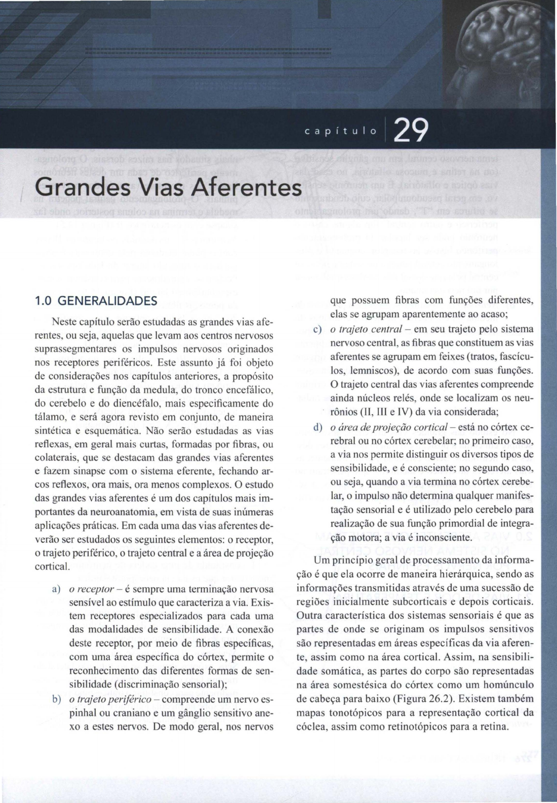 Grandes Vias Aferentes 1.0 GENERALIDADES Neste capítulo serão estudadas as grandes vias afe rentes, ou seja, aquelas que levam aos centros nervosos suprassegmentares os impulsos nervosos originados nos receptores periféricos. Este assunto já foi objeto de considerações nos capítulos anteriores, a propósito da estrutura e função da medula, do tronco encefálico, do cerebelo e do diencéfalo, mais especificamente do tálamo, e será agora revisto em conjunto, de maneira sintética e esquemática. Não serão estudadas as vias reflexas, em geral mais curtas, formadas por fibras , ou colaterais, que se destacam das grandes vias aferentes e fazem sinapse com o sistema eferente, fechando ar cos reflexos, ora mais, ora menos complexos. O estudo das grandes vias aferentes é um dos capítulos mais im portantes da neuroanatomia, em vista de suas inúmeras aplicações práticas. Em cada uma das vias aferentes de verão ser estudados os seguintes elementos: o receptor, o trajeto periférico, o trajeto central e a área de projeção cortical. a) o receptor - é sempre uma terminação nervosa sensível ao estímulo que caracteriza a via. Exis tem receptores especializados para cada uma das modalidades de sensibilidade. A conexão deste receptor, por meio de fibras específicas, com uma área específica do córtex, permite o reconhecimento das diferentes formas de sen sibilidade (discriminação sensorial); b) o trajeto periférico - compreende um nervo es pinhal ou craniano e um gânglio sensitivo ane xo a estes nervos. De modo geral , nos nervos que possuem fibras com funções diferentes, elas se agrupam aparentemente ao acaso; c) o trajeto central - em seu trajeto pelo sistema nervoso central , as fibras que constituem as vias aferentes se agrupam em feixes (tratos, fascícu los, lemniscos), de acordo com suas funções. O trajeto central das vias aferentes compreende ainda núcleos relés, onde se localizam os neu rônios (II, III e IV) da via considerada; d) o área de projeção cortical - está no córtex ce rebral ou no córtex cerebelar; no primeiro caso, a via nos permite distinguir os diversos tipos de sensibilidade, e é consciente; no segundo caso, ou seja, quando a via termina no córtex cerebe lar, o impulso não determina qualquer manifes tação sensorial e é utilizado pelo cerebelo para realização de sua função primordial de integra ção motora; a via é inconsciente. Um princípio geral de processamento da informa ção é que ela ocorre de maneira hierárquica, sendo as informações transmitidas através de uma sucessão de regiões inicialmente subcorticais e depois corticais. Outra característica dos sistemas sensoriais é que as partes de onde se originam os impulsos sensitivos são representadas em áreas específicas da via aferen te, assim como na área cortical. Assim, na sensibili dade somática, as partes do corpo são representadas na área somestésica do córtex como um homúnculo de cabeça para baixo (Figura 26 .2). Existem também mapas tonotópicos para a representação cortical da cóclea, assim como retinotópicos para a retina. José Filho Destaque José Filho Sublinhado José Filho Destaque José Filho Sublinhado As grandes vias aferentes podem ser consideradas como cadeias neuronais unindo os receptores ao cór tex. No caso das vias inconscientes (cerebelares), esta cadeia é constituída apenas por dois neurônios (1, II). Já nas vias conscientes (cerebrais), estes neurônios são geralmente três, sobre os quais podem ser estabeleci dos os seguintes princípios gerais: a) Neurônio I - localiza-se geralmente fora do sis tema nervoso central , em um gânglio sensitivo (ou na retina e mucosa olfatória, no caso das vias óptica e olfatória). É um neurônio sensiti vo, em geral pseudounipolar, cujo dendraxônio se bifurca em "T", dando um prolongamento periférico e outro central. Em alguns casos o neurônio pode ser bipolar. O prolongamento periférico liga-se ao receptor, enquanto o pro longamento central penetra no sistema nervoso central pela raiz dorsal dos nervos espinhais ou por um nervo craniano; b) Neurônio II - localiza-se na coluna posterior da medula ou em núcleos de nervos cranianos do tronco encefálico (fazem exceção as vias ópti ca e olfatória). Origina axônios que geralmente cruzam o plano mediano logo após sua origem e entram na formação de um trato ou lemnisco; c) Neurônio III - localiza-se no tálamo e origina um axônio que chega ao córtex por uma radia ção talâmica (faz exceção a via olfatória). No estudo das grandes vias aferentes, levaremos sempre em conta a posição e o trajeto dos axônios des tes três neurônios. Serão estudadas, primeiramente, as vias aferentes do tronco e membros, que penetram no sistema nervoso central pelos nervos espinhais; a se guir, aquelas da cabeça, que penetram por nervos cra nianos. 2.0 VIAS AFERENTES QUE PENETRAM NO SISTEMA NERVOSO CENTRAL POR NERVOS ESPINHAIS 2.1 VIAS DE DOR E TEMPERATURA Os receptores de dor são terminações nervosas livres. Existem duas vias principais através das quais os impulsos de dor e temperatura chegam ao cérebro: uma via filogeneticamente mais recente, neoespinota lâmica, constituída pelo trato espinotalâmico lateral, que vai diretamente ao tálamo; e outra, mais antiga, paleoespinotalâmica, constituída pelo trato espino -reticular, e pelas fibras retículo-talâmicas (via espino- -retículo-talâmica). Como será visto, essas duas vias 276 NEUROANATOMIA FUNCIONAL veiculam formas diferentes de dor e serão estudadas de maneira esquemática a seguir. 2.1.1 Via neoespinotalâmica Trata-se da via "clássica" de dor e temperatura, cons tituída basicamente pelo trato espinotalâmico lateral, en volvendo uma cadeia de três neurônios (Figura 29.1). a) Neurônios I - localizam-se nos gânglios espi nhais situados nas raízes dorsais. O prolonga mento periférico de cada um destes neurônios liga-se aos receptores através dos n
