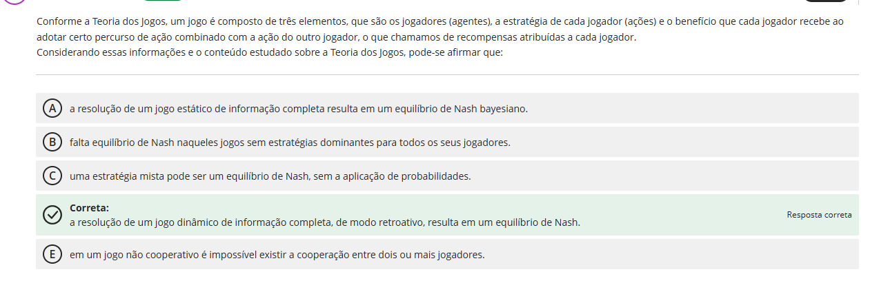 Conforme a Teoria dos Jogos, um jogo é composto de três elementos, que são os jogadores (agentes), a estratégia de cada jogador (ações) e benefício que cada jogador recebe ao adotar certo percurso de ação combinado com a ação do outro jogador, o que chamamos de recompensas atribuídas a cada jogador. Considerando essas informações e conteúdo estudado sobre a Teoria dos Jogos, pode-se afirmar que: A a resolução de um jogo estático de informação completa resulta em um equilíbrio de Nash bayesiano. B falta equilíbrio de Nash naqueles jogos sem estratégias dominantes para todos os seus jogadores. C uma estratégia mista pode ser um equilíbrio de Nash, sem a aplicação de probabilidades. Correta: Resposta correta a resolução de um jogo dinâmico de informação completa, de modo retroativo, resulta em um equilíbrio de Nash. E em um jogo não cooperativo é impossível existir a cooperação entre dois ou mais jogadores.