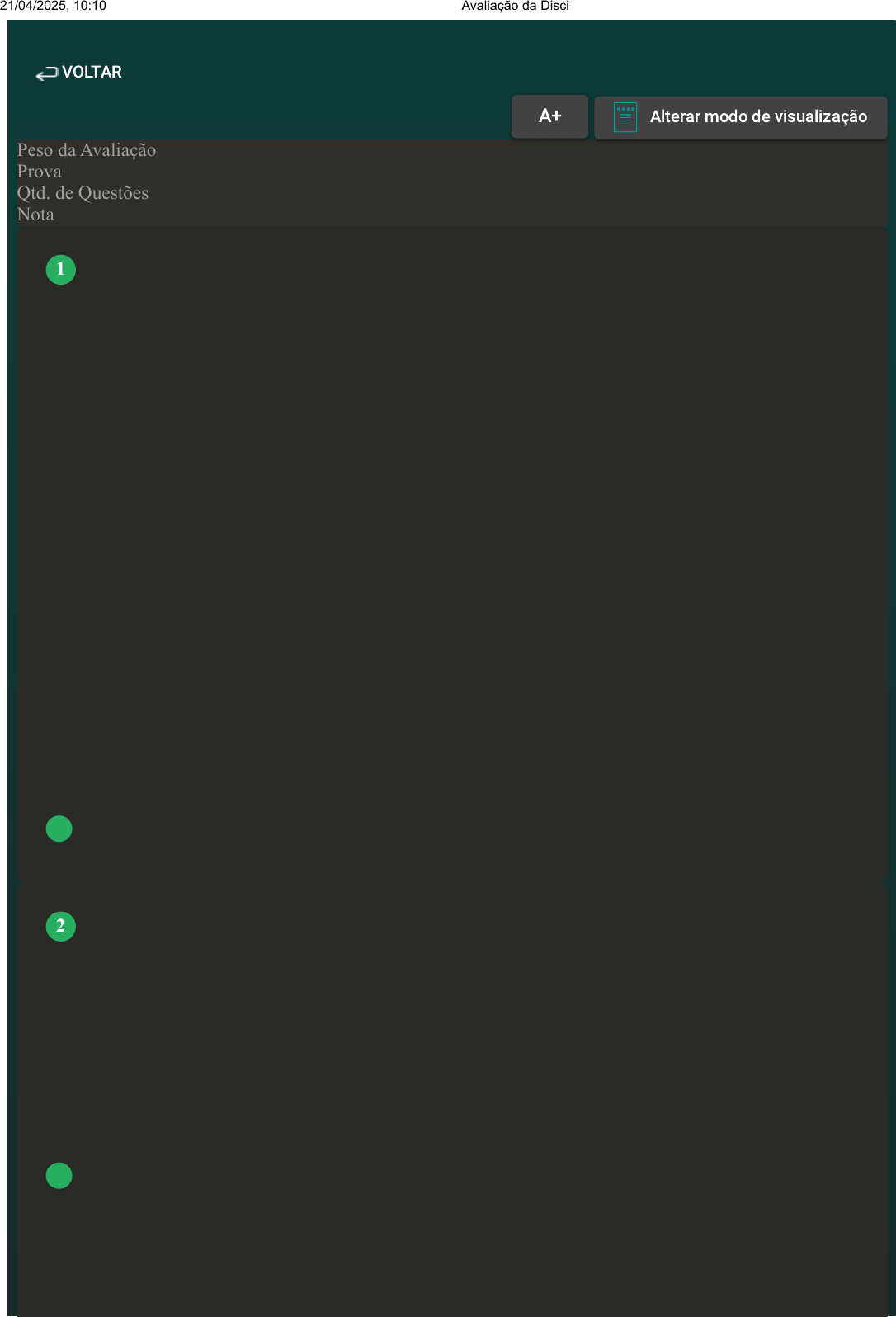 Prova Impressa GABARITO | Avaliação da Disciplina (Cod.:659752) Peso da Avaliação 10,00 Prova 97847367 Qtd. de Questões 20 Nota 9,00 Perrenoud (2004) salienta que os professores necessitam receber uma formação que contemple acompanhamento adequado para a construção de competências e adverte sobre alguns aspectos. Sobre as advertências que o autor sugere, analise as afirmativas a seguir: FONTE: PERRENOUD, P. Os ciclos de aprendizagem: um caminho para combater o fracasso escolar. Porto Alegre: Artmed, 2004. I- Que a formação contínua esteja à escuta dos professores e desenvolva novas ofertas assim que as necessidades apareçam. II- Que a estrutura de enquadramento apoie os professores em inovação de todas as maneiras imagináveis. III- Que um dispositivo específico de acompanhamento seja implantado uma vez. IV- Que a formação continuada habilite o professor a encontrar uma situação mobilizadora para que o aprendizado aconteça. V- Que não haja necessidade da tomada de consciência, pois ela já existe. Assinale a alternativa CORRETA: A Somente a afirmativa I está correta. B As afirmativas IV e V estão corretas. C As afirmativas II e III estão corretas. D As afirmativas I, II e IV estão corretas. Para Moran et al. (2000), a aprendizagem ocorre quando o aluno questiona, tem interesse e necessidade em conhecer um determinado assunto. Nesse sentido, a aprendizagem poderá ocorrer com as aplicabilidades da Web 4.0. Além de ser considerada a Quarta Revolução Industrial, é também a internet das coisas. Sobre o exposto, assinale a alternativa CORRETA: FONTE: MORAN, José Manuel et al. Novas tecnologias e mediação pedagógica. 6. ed. Campinas: Papirus, 2000. A A inovação e a interação não contribuirão com a aprendizagem, pois, com a Web 4.0, a inteligência artificial solucionará os problemas propostos para os alunos resolverem. B A inteligência artificial é uma das formas de se utilizar a Web 4.0. C A ruptura com o modelo tradicional de ensino é desnecessária para os ambientes colaborativos de aprendizagem. VOLTAR A+ Alterar modo de visualização 1 2 21/04/2025, 10:10 Avaliação da Disciplina about:blank 1/8 D A robótica não é ainda bem aceita nos ambientes de aprendizagem. As pessoas lidam com diferentes tipos de tecnologias em nosso cotidiano, como um abridor de latas ou uma ferramenta para apertar um parafuso. Nesse sentido, para alguns professores, lidar com a tecnologia e com a deficiência em sala de aula causa pavor. Diante desses pavores, assinale a alternativa CORRETA: A A formação continuada deverá instigar o professor a se preparar para o enfrentamento na sala de aula, que é homogênea. B Os cursos de formação continuada deverão discutir as expectativas quanto à heterogeneidade da sala de aula. C A continuidade nos estudos e a ampliação do conhecimento provocará no professor o interesse pelo aluno com dificuldades de aprendizagem. D A formação continuada não precisará considerar os saberes mobilizados e empregados na prática cotidiana pelos professores. Ao utilizar as tecnologias na escola como ambiente formal, os envolvidos poderão encontrar vantagens e desvantagens, afinal, para que o processo ensino aprendizagem ocorra, ambos, aluno e professor, precisarão estar preparados para lidarem com os meios tecnológicos. Sobre o exposto, assinale a alternativa CORRETA: A Estudar por meio dos recursos tecnológicos é uma desvantagem, pois gera dificuldades para aprendizagem do aluno, que, em muitos casos, não sabe lidar com os meios digitais. B Existem muitos formulários e documentos que precisam ser preenchidos, e assim, torna-se uma desvantagem utilizar as tecnologias para atender a esta demanda. C Adquirir conhecimento de forma mais rápida atrapalha a aprendizagem do aluno, caracterizando, desse modo, uma desvantagem no uso de tecnologias. D Saber lidar com os recursos digitais é uma vantagem para o professor trabalhar em sala de aula e para o aluno adquirir conhecimento, bem como desenvolver autonomia. Os ambientes colaborativos de aprendizagem, por utilizarem as ferramentas tecnológicas, contribuem para a inclusão dos alunos com diferentes deficiências na aprendizagem. A socialização desses alunos tem relação com a atuação pedagógica do professor. Sobre essa atuação, assinale a alternativa CORRETA: A Jogar e praticar os conteúdos e atividades de gamificação não servirão para a inclusão e aprendizagem. B Monitorar o aluno será necessário apesar de ele, o aluno, estar integralmente concentrado na resolução de suas atividades. C Dar feedbacks não será necessário, pois o aluno perceberá onde errou e onde acertou. D Motivar não será interessante no momento de aplicação da atividade porque o aluno com deficiência de aprendizagem precisará se concentrar. 3 4 5 21/04/2025, 10:10 Avaliação da Disciplina about:blank 2/8 De acordo com Mittler (2001), a inclusão é um caminho a ser trilhado, como nota-se no breve histórico dos aspectos legais da inclusão no Brasil. Ainda há um longo caminho a percorrer e, enquanto professores, devemos organizar nosso planejamento a fim de atender e propor alternativas para que os alunos possam desenvolver as atividades. Nesse sentido, a tecnologia é uma grande aliada para a proposta de inclusão. Com relação ao uso da tecnologia para auxiliar na inclusão, classifique V para as sentenças verdadeiras e F para as falsas: FONTE: MITTLER, P. Rumo à inclusão. Posições, v. 12, n. 2-3, jul./nov. 2001. Disponível em: https://periodicos.sbu.unicamp.br/ojs/index.php/proposic/article/view/8643996. Acesso em: abr. 2020. ( ) As características da turma não precisarão ser consideradas para a prática e realização da atividade. ( ) Os alunos possuem habilidades tecnológicas, não havendo necessidade do professor mediador. ( ) O professor, ao desenvolver as atividades, avaliará as condições que estas exigem. ( ) A caracterização da turma considera todos